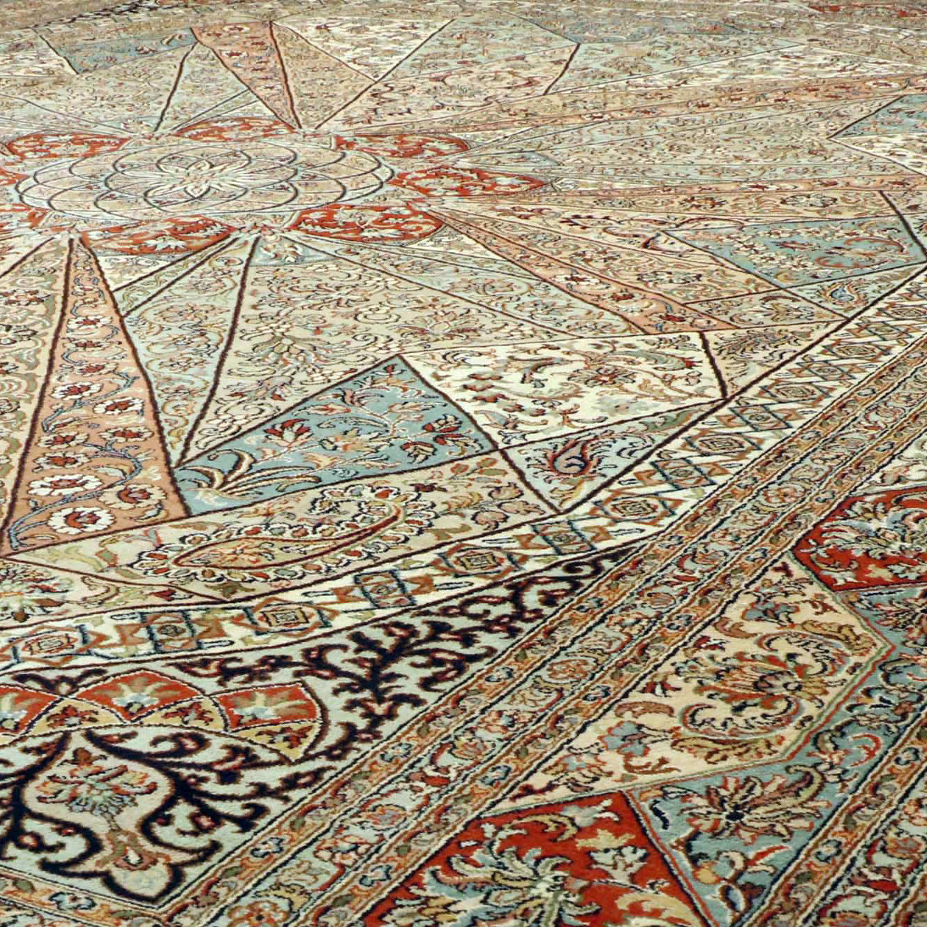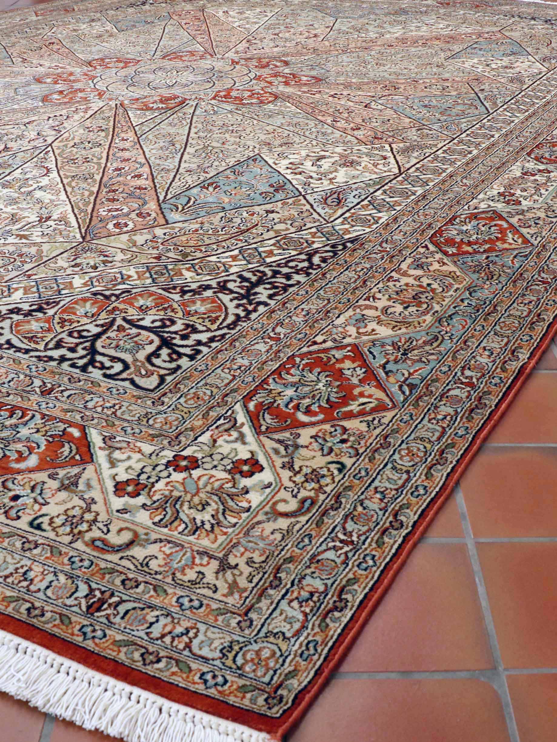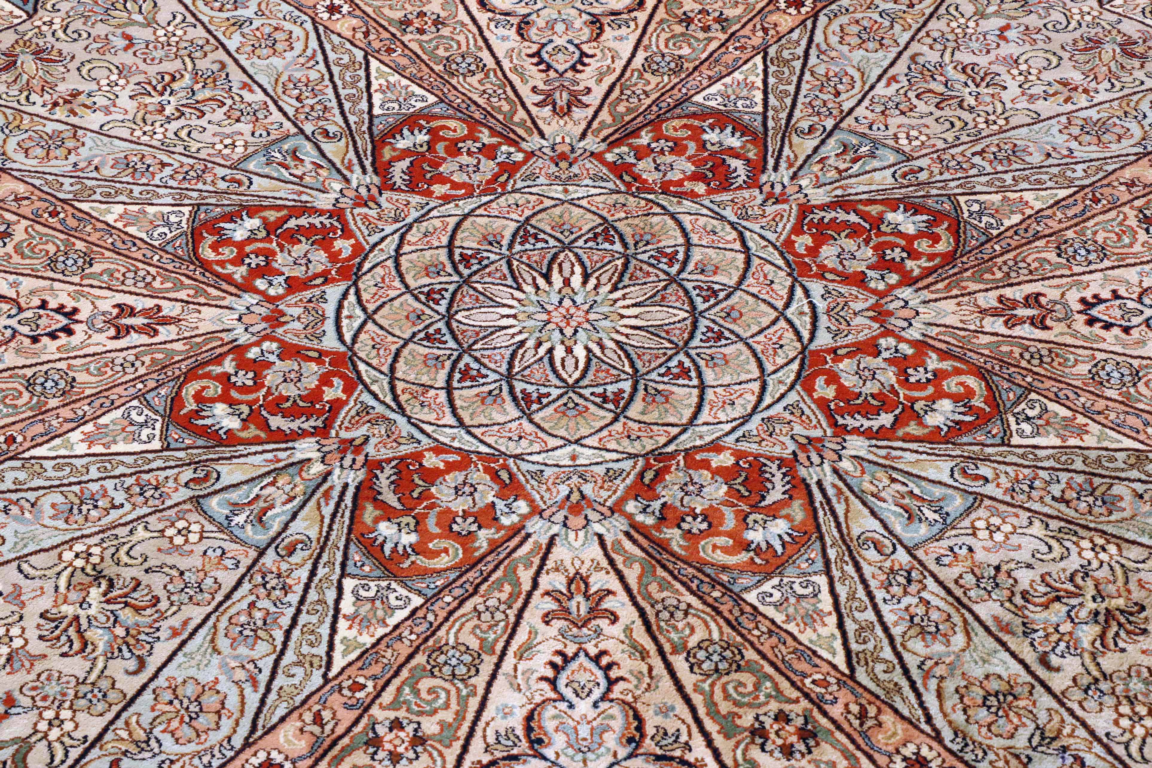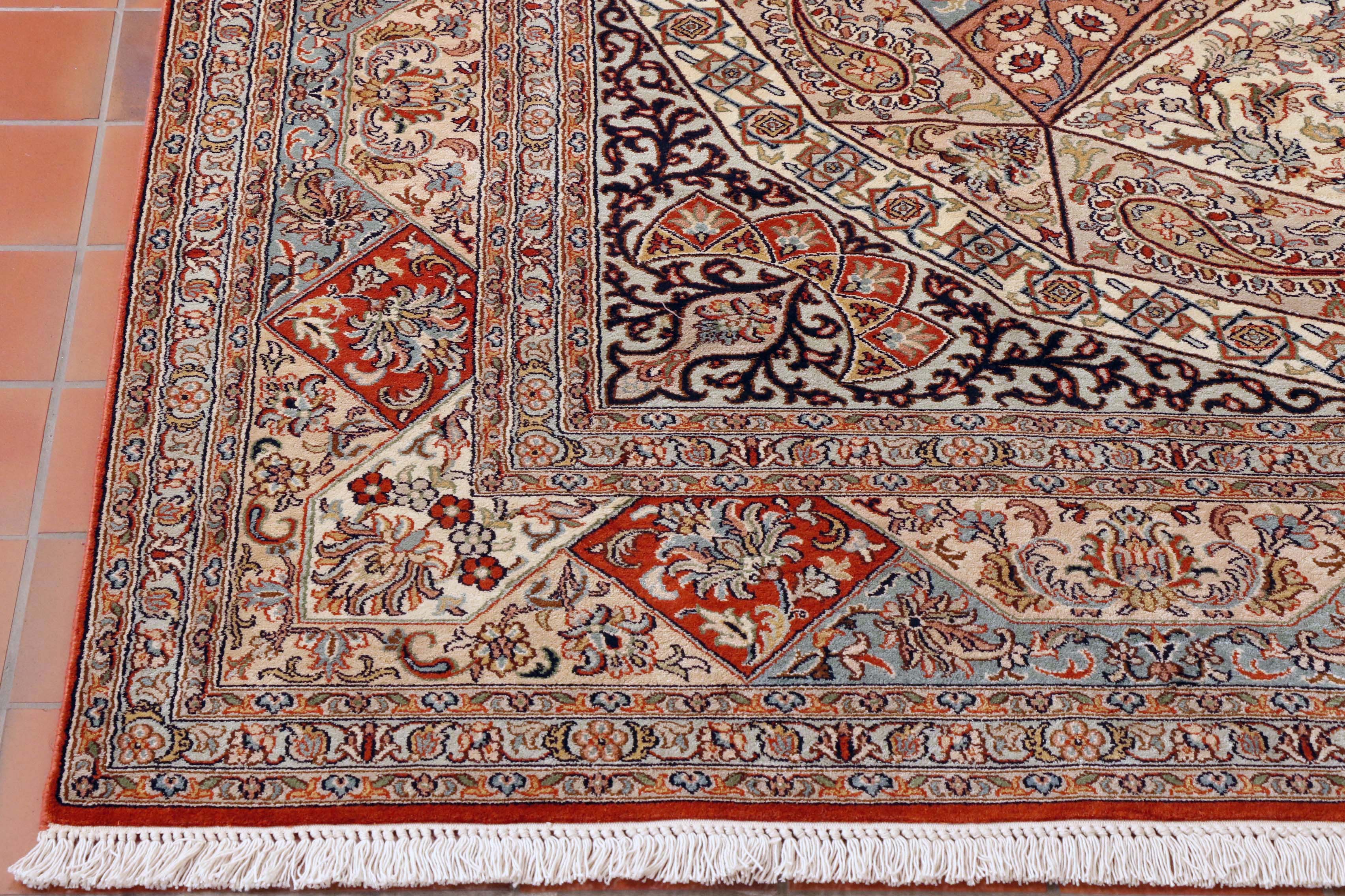 Wow! What a truly breathtaking piece of art! This stunning fine Kashmir silk carpet has been made using a design taken from the intricate tile work in the dome of a Persian mosque. The soft duck-egg blue is just one of many irresistible colours in this piece, along with soft terracotta, gold, green, and cream.