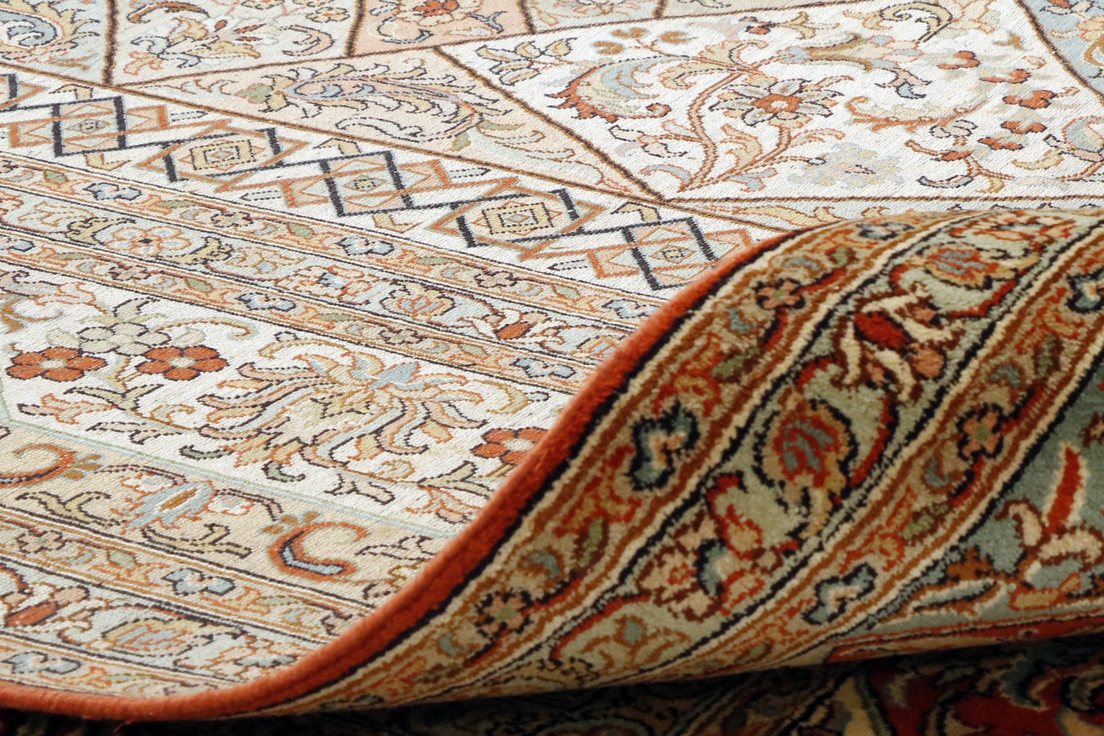 The pile is 100% silk, woven onto a cotton warp and weft with 18 x 18 (324) knots per square inch. The majority of the silk is produced in China and Brazil.