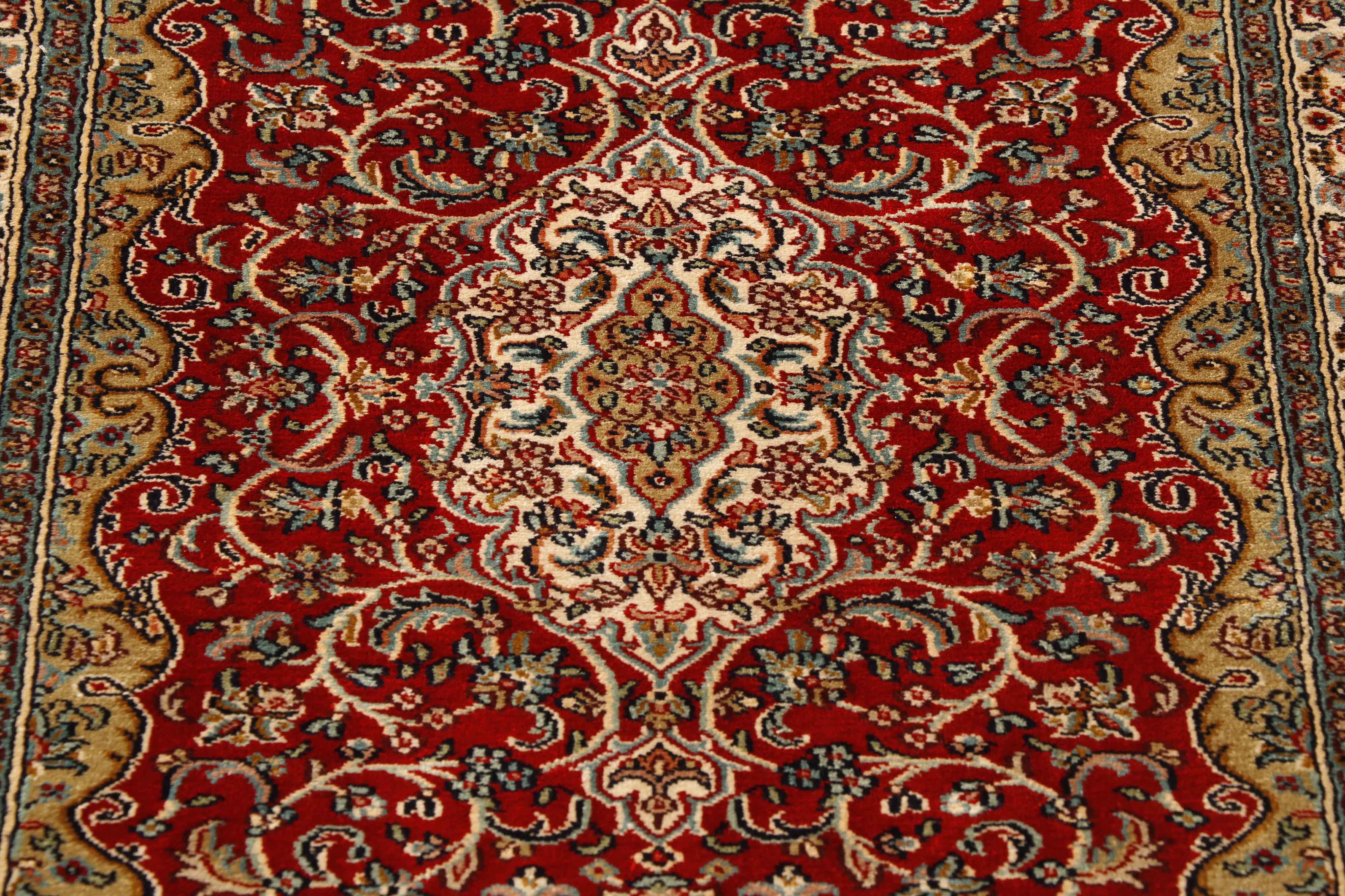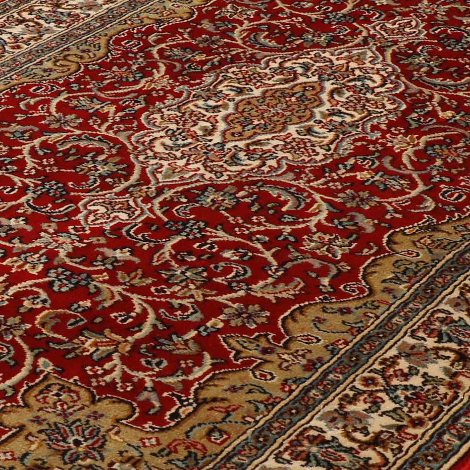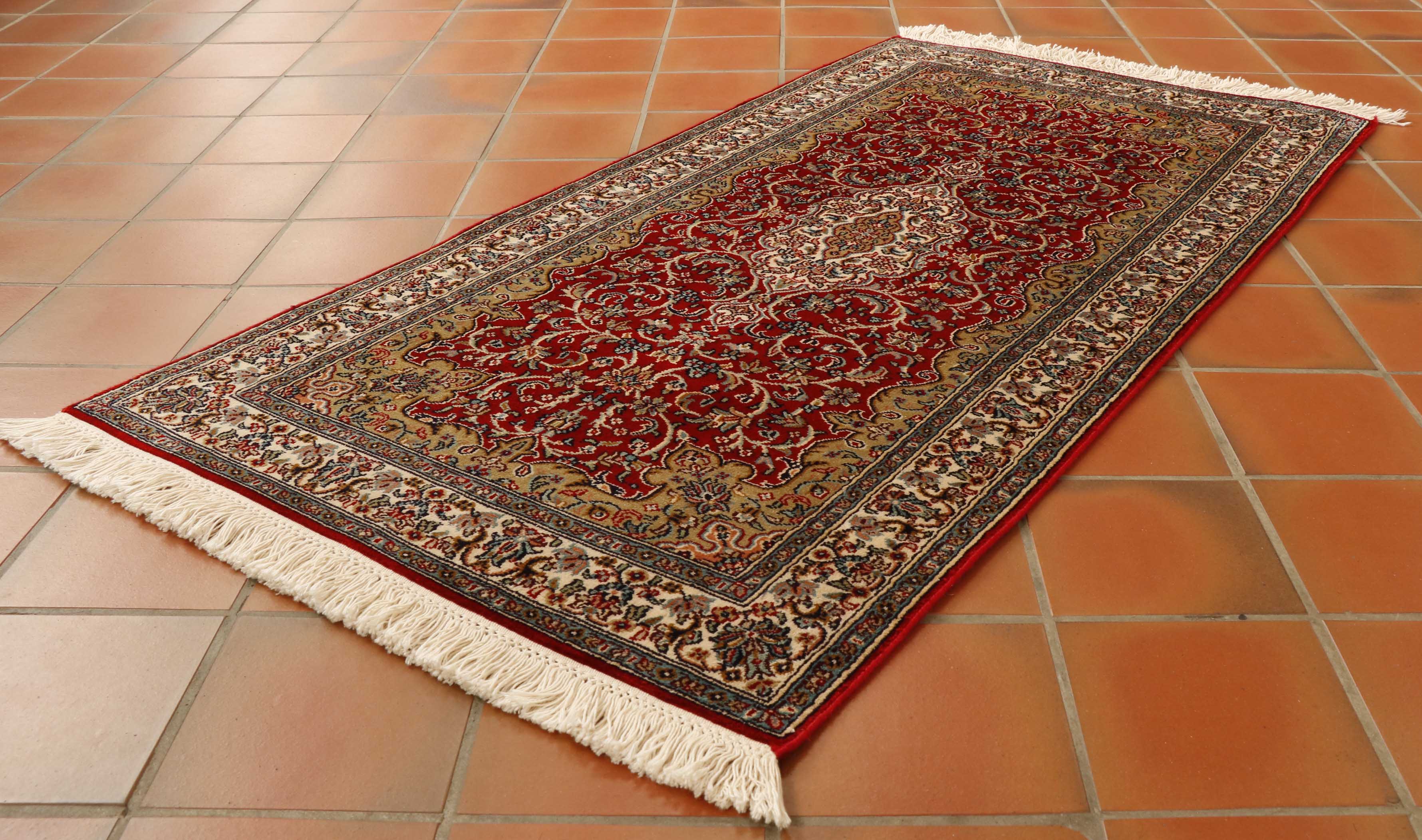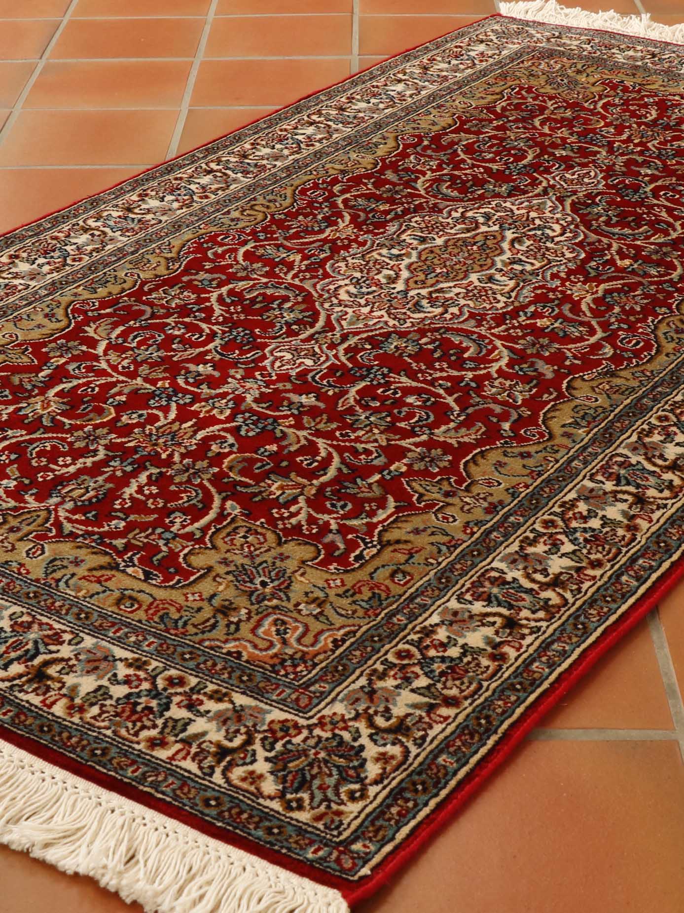 The size of this piece is slightly different from most. Generally, for a 4ft length, the width will be 2'8. However, this piece is only 2ft wide. They have used a brilliant bright red for the background shade and cream for the main border with an inner wall of gold. The shape of the rug gives the medallion more of an elongated shape.