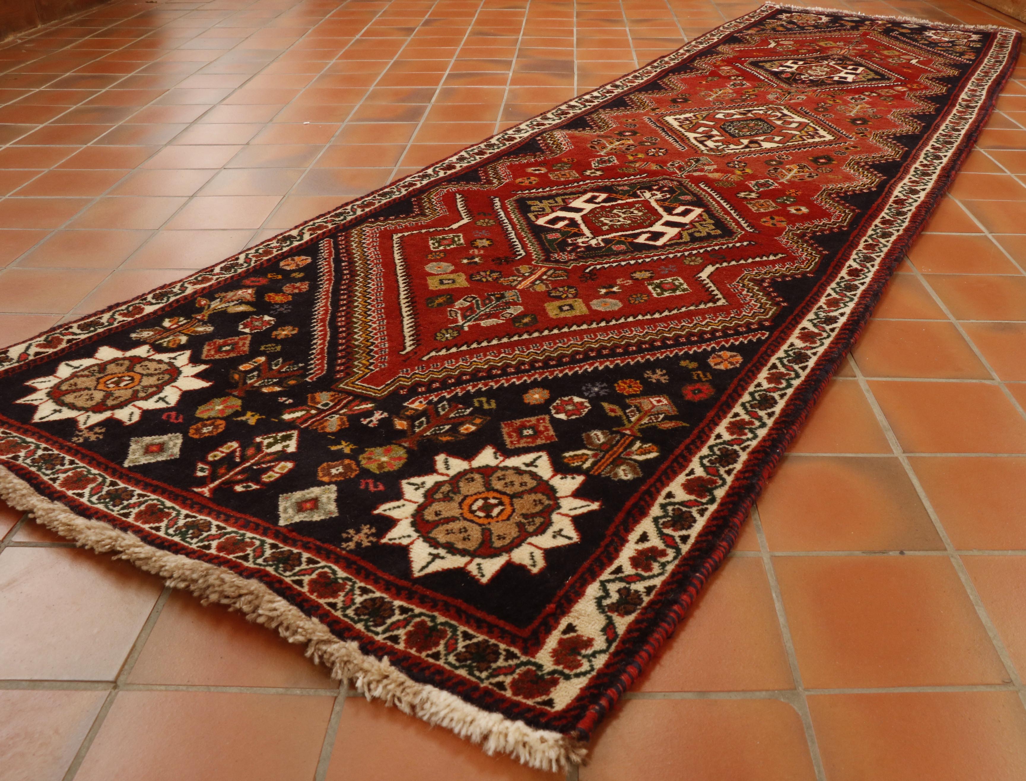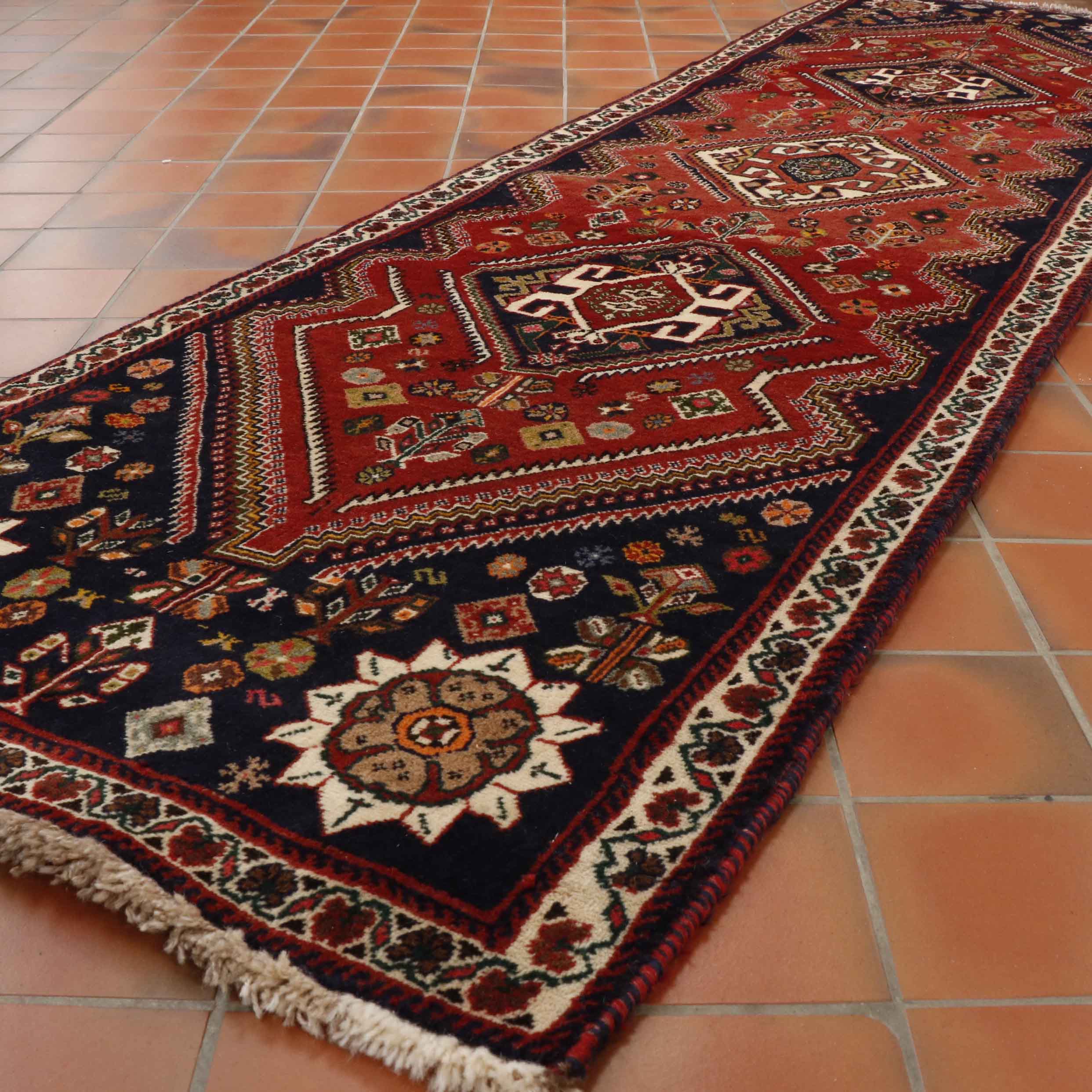 This is a traditional Oriental Qashqai runner, a true tribal piece. Its decorative pattern and colour add warmth and character. This lovely piece best shows this type of rug.