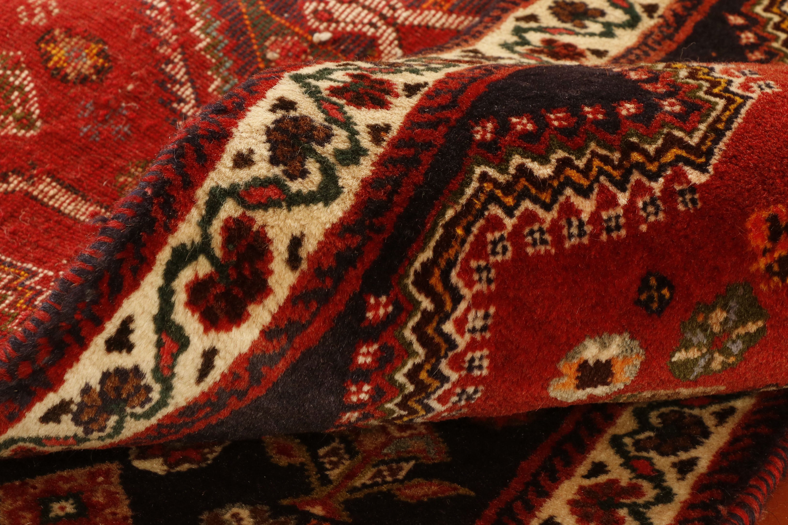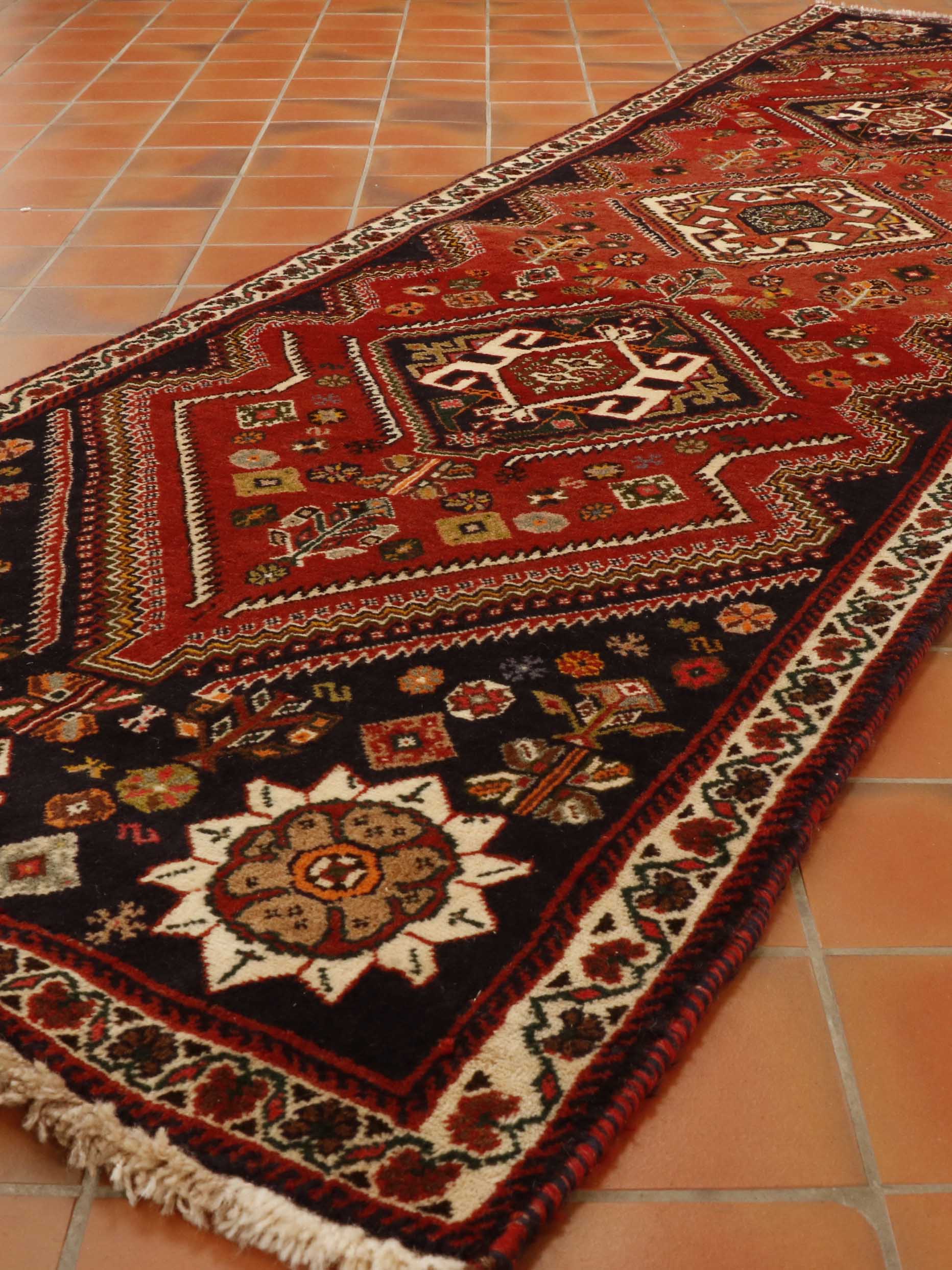 The Qashqai designs are not written or drawn but passed on to daughters who watch their mothers from an early age and gradually develop their skills in a family environment. The women will make these pieces with two or even three generations involved. The piece is knotted by the weavers who sit cross-legged upon the floor and, indeed, the carpet whilst they craft their art. Meanwhile, the men and boys will defend and protect the animals. In addition to the traditional lozenge-shaped ground with medallions in the centre repeated in the corners, they will often include many birds, animals, flowers, and trees that they see around them. Occasionally, if you were very fortunate, you would come across one with the horse head of Persepolis. As you would expect, these carpets are hand-knotted with wool that has largely been vegetable-dyed. The Kashgai pieces often have an interesting selvedge with bi or tricolour windings like a barber pole. The other distinctive characteristic is that the rug will be knotted on a wool foundation.