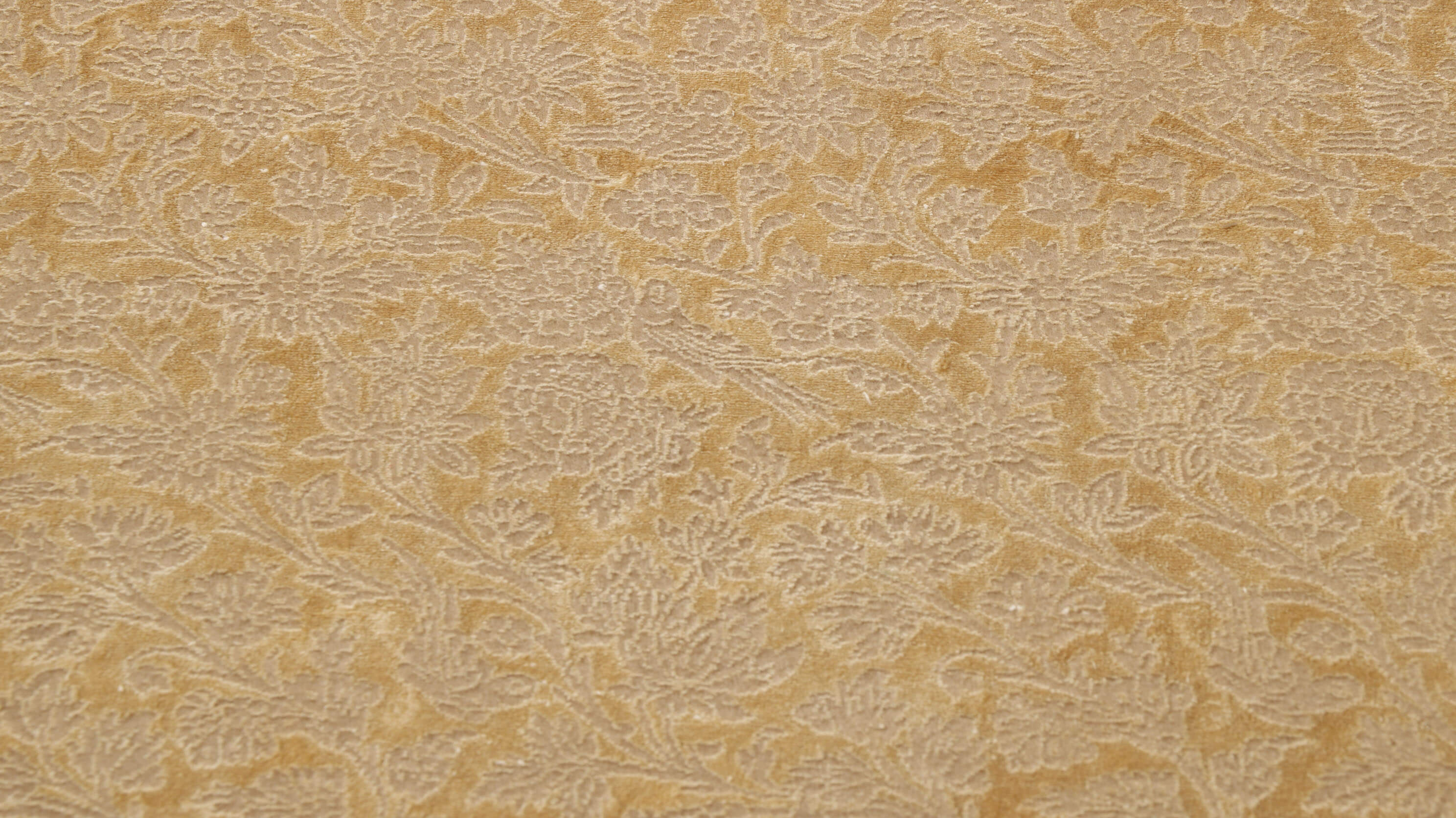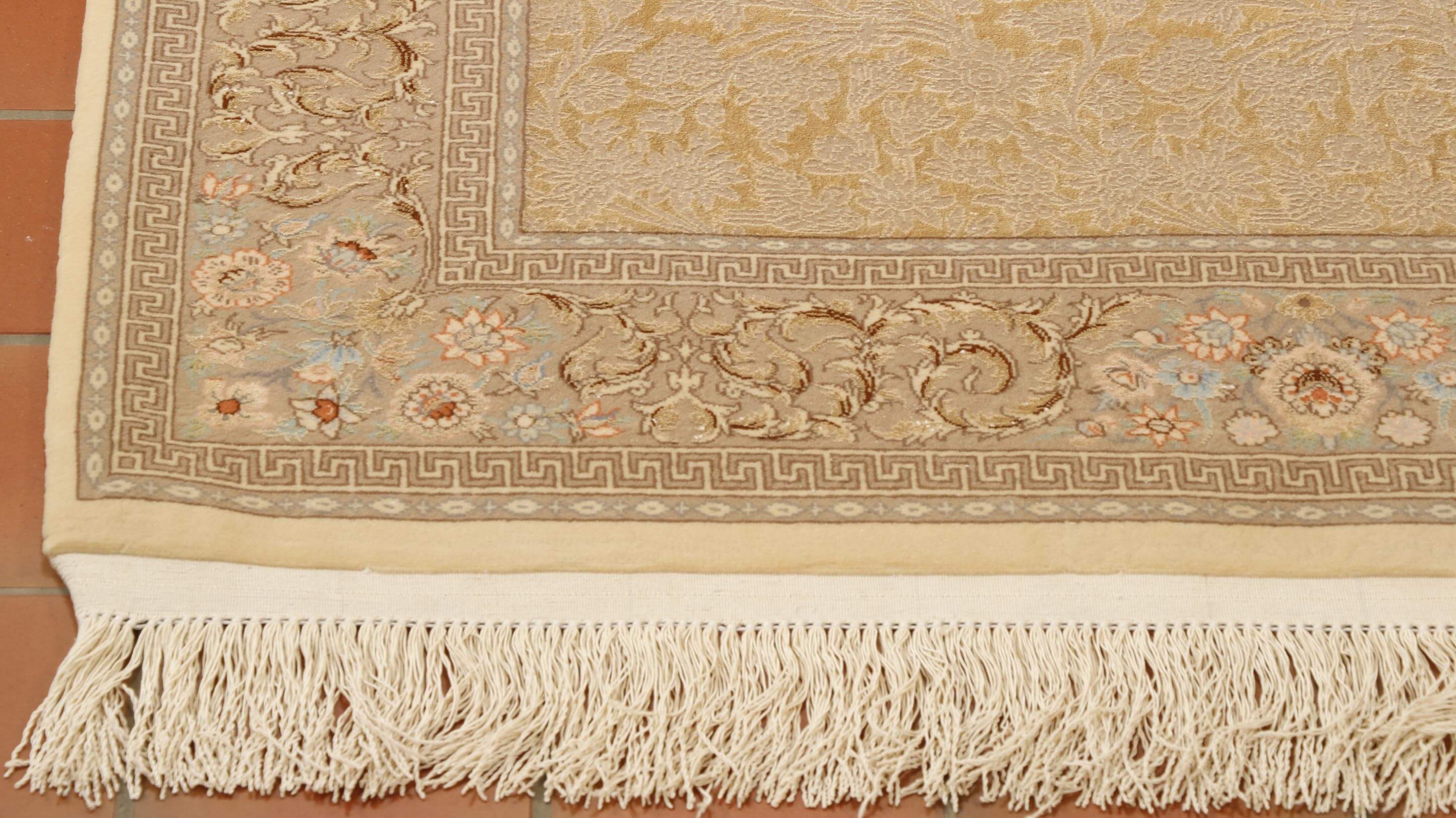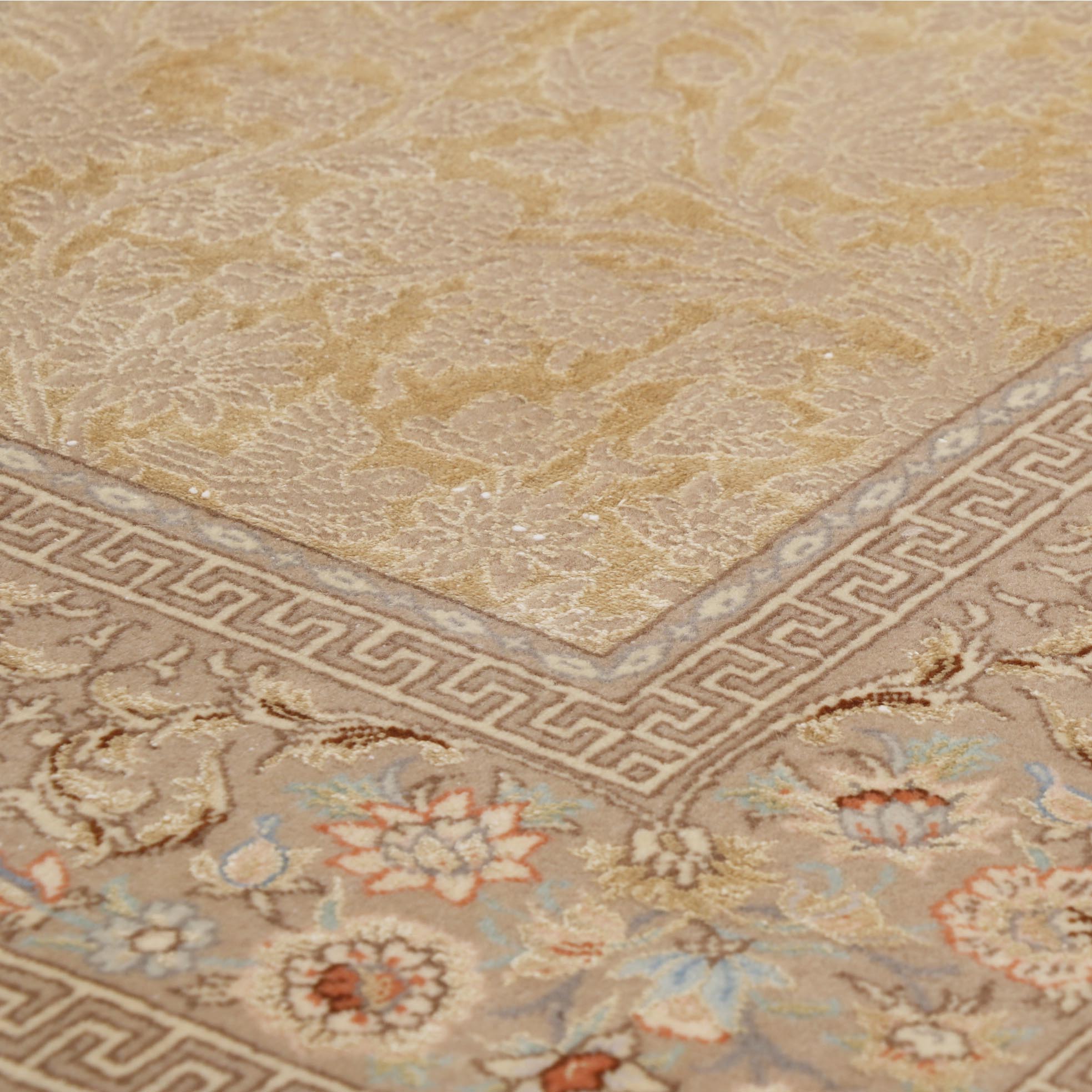 Many contemporary Isfahans are very bright, with strong reds and blues, and their patterns are ornate. This piece has a very subtle colouring of pale gold, soft peach, and delicate duck egg blue. The carpet is hand-knotted with a significant amount of very fine wool, combined with silk, which is used extensively to create the design. When you look closely at the scene, you'll see that it is covered with flowers, leaves, and birds.