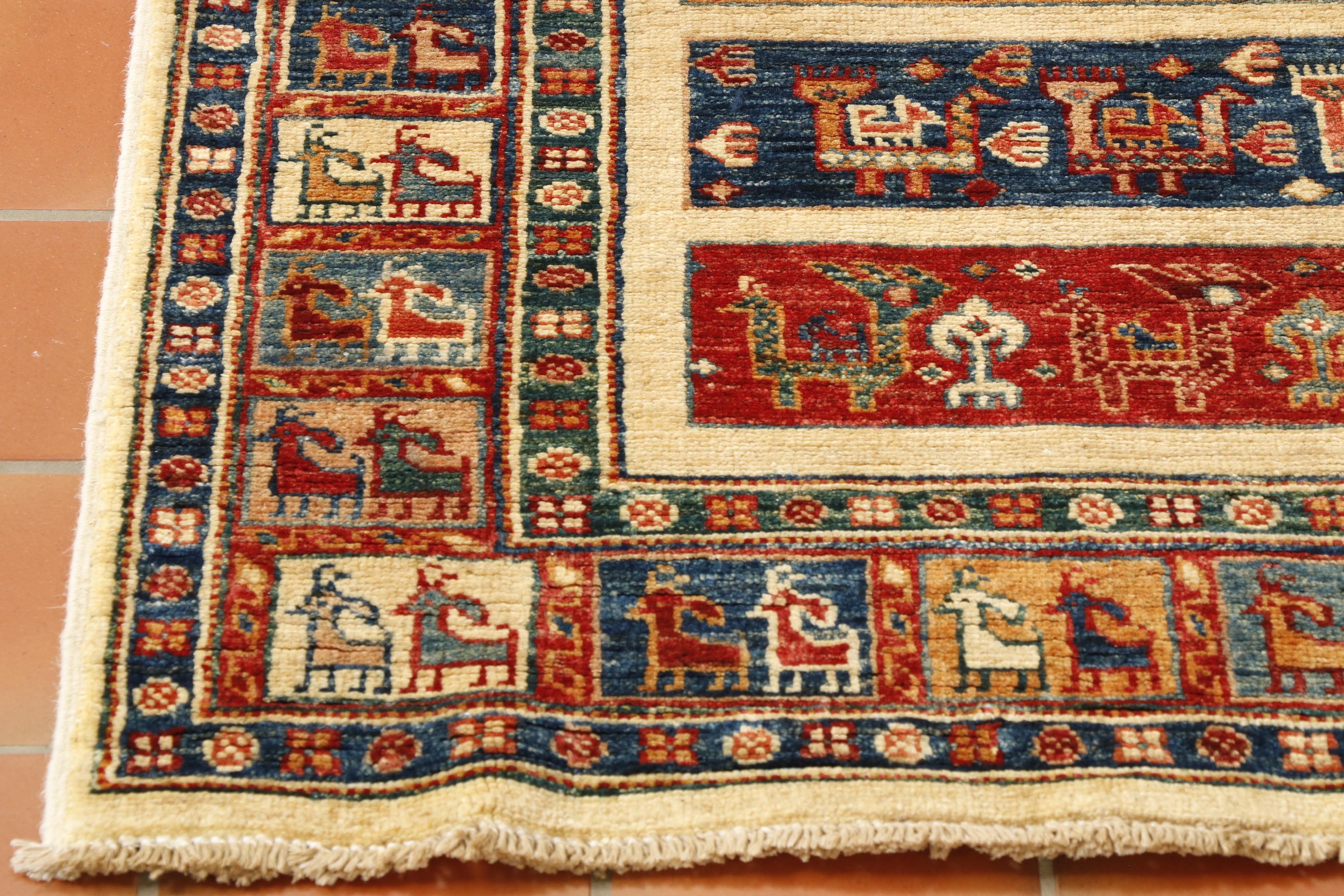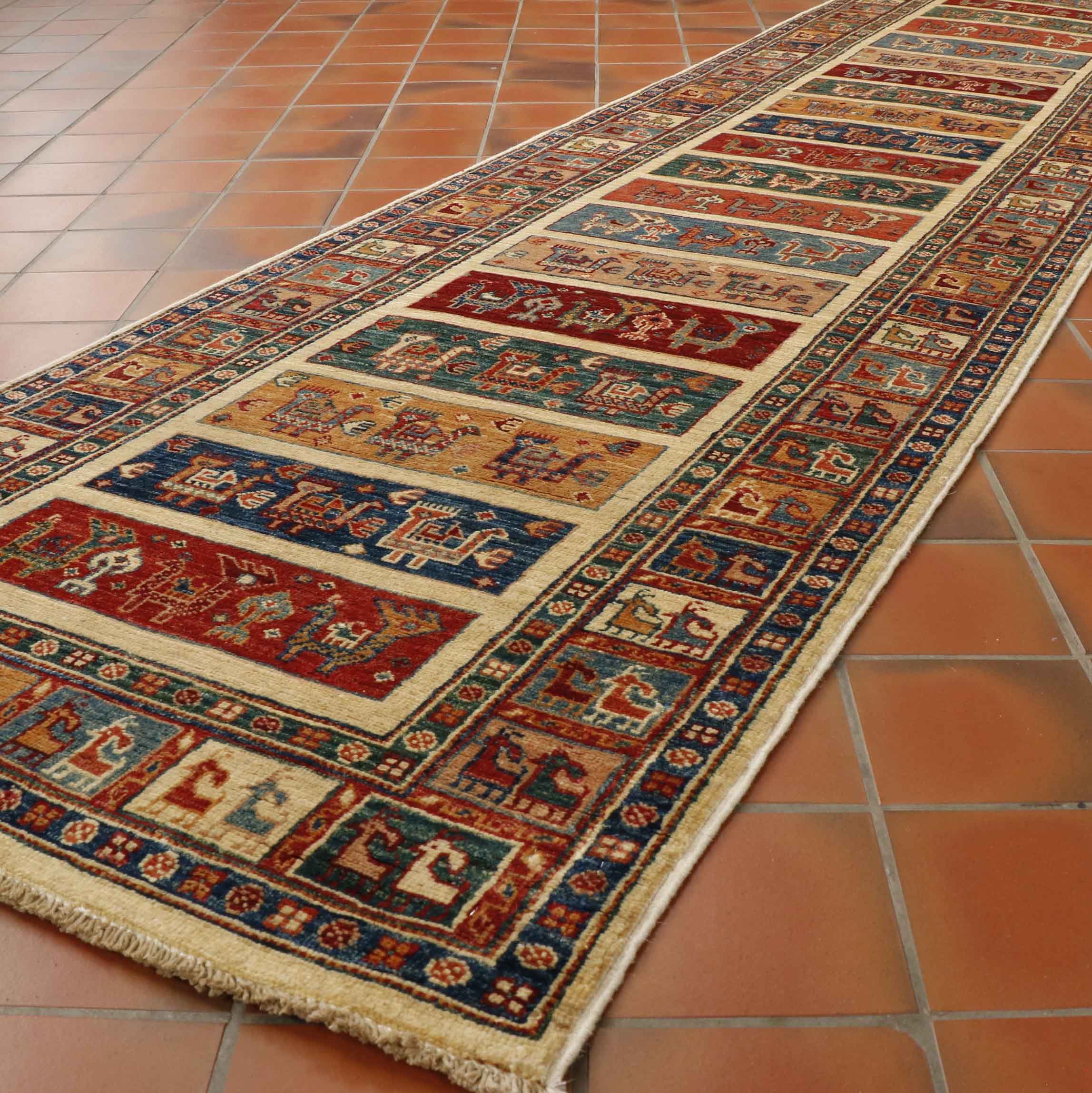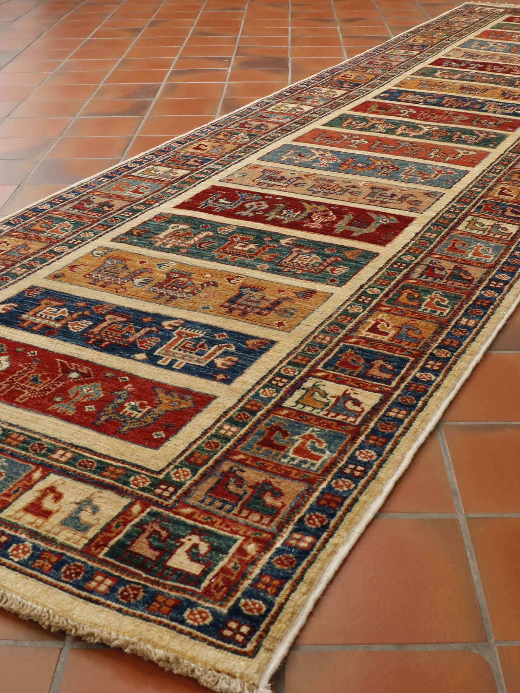 This is a striking runner for all animal and bird enthusiasts. This piece is an absolute joy to behold, with many quirky, stylised goats and peacocks with their fantails. They have used a broad mix of colours from brick red and bottle green to old gold and dark blue, with some terracotta and cream thrown in for good measure.