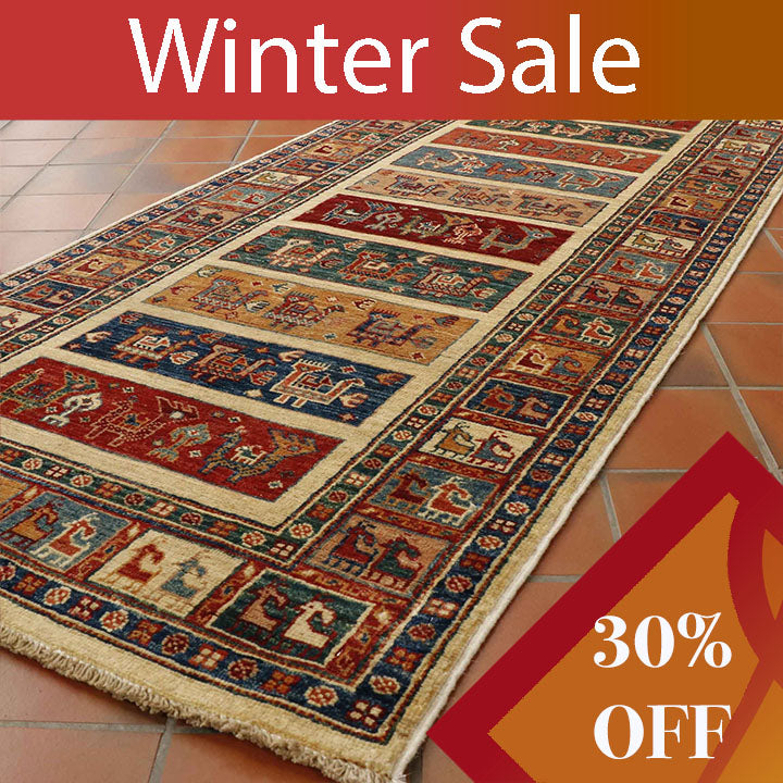 Afghan Aryana rugs are hand-knotted in Mazar-e-Sharif and Kabul, Afghanistan, often featuring designs inspired by museum pieces. Woven from long wool sheared from Karakul sheep, the wool is washed with gentle soap and water, then hand-combed and hand-spun on a spindle. Next, the wool is vegetable dyed using plants, flowers and berries, walnut husks, pomegranate rind, madder root, and indigo. Not surprisingly, wools vary in colour due to differences in the dyes' absorption, resulting in a feature called 'Abrash' that gives Aryana rugs their unique colour and distinct appearance.