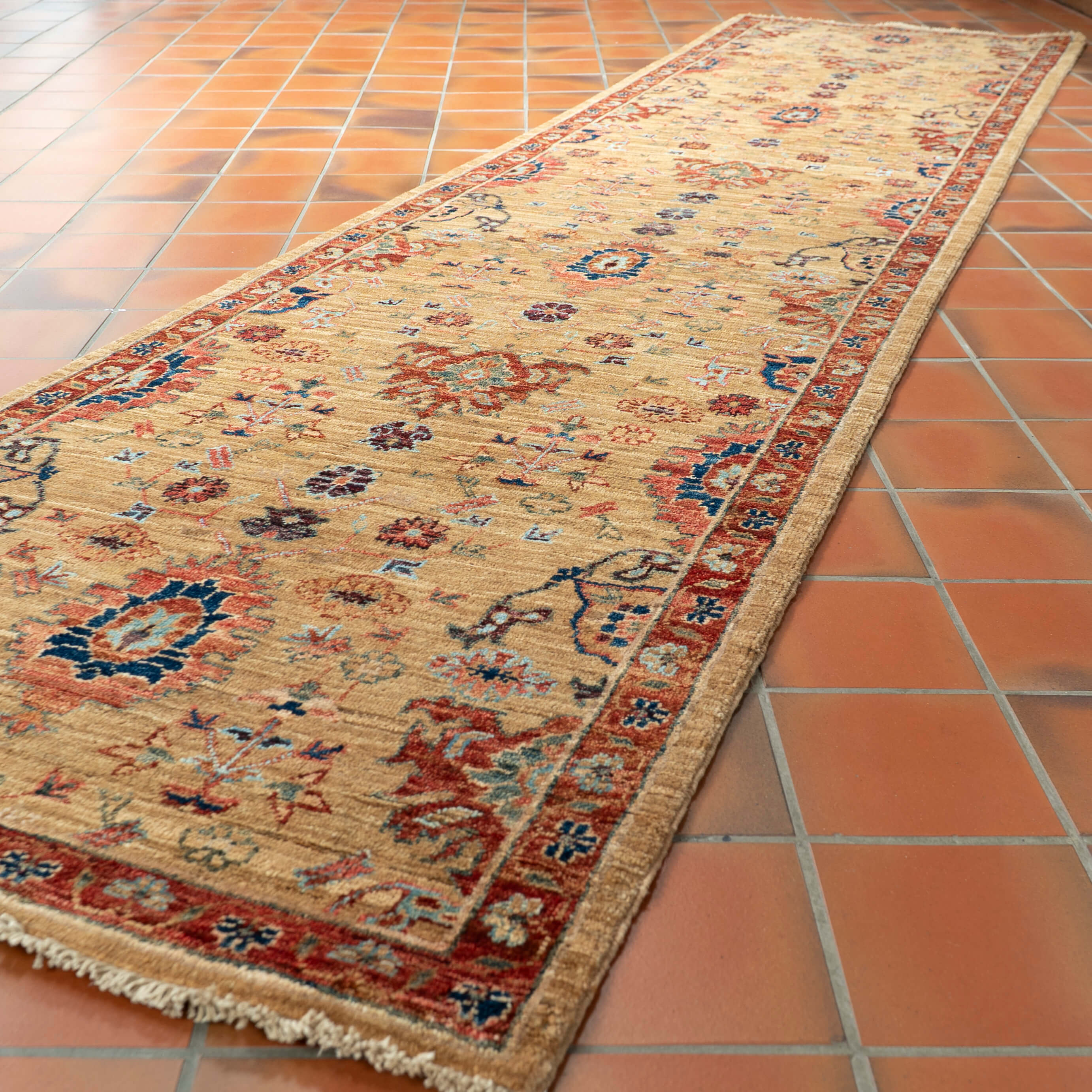 This beautiful handmade Afghan Choeb Rang runner uses traditional techniques from Afghanistan's cottage industry to create a classic, old, gold-backgrounded design with brick red and olive green accents. An expertly woven piece provides an elegant look and is practical for any space.  Please click the hyperlinks in gold if you are interested in additional information.This unique and varied collection is produced in northwest Afghanistan and has a similar construction to the Ziegler rugs. The wool is sheared by hand from the indigenous Karukal sheep. It is then hand-spun and coloured using natural vegetable and mineral dyes. These pieces have utilised attractive old Persian designs and patterns...
