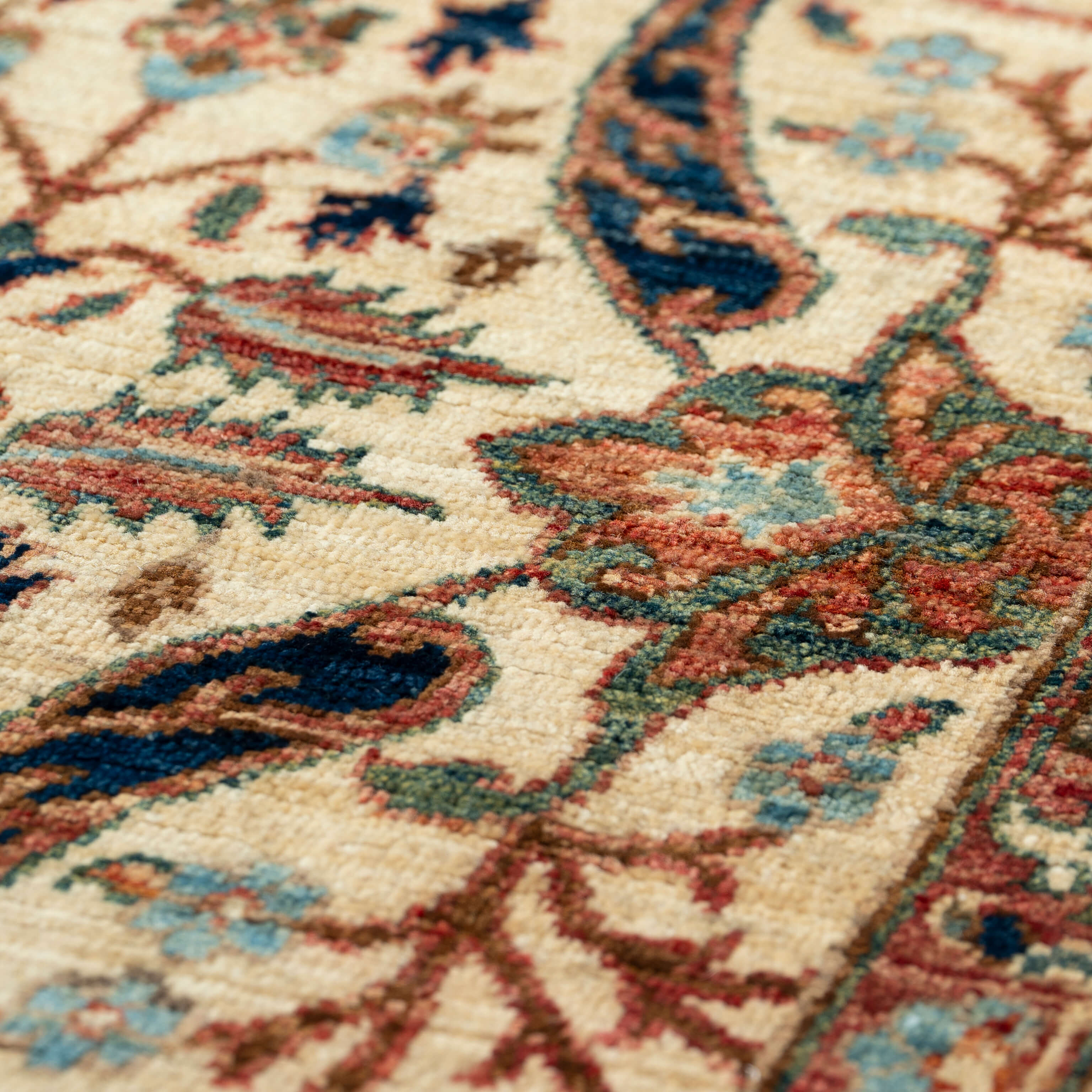 This unique and varied collection is produced in northwest Afghanistan and has a similar construction to the Ziegler rugs. The wool is sheared by hand from the indigenous Karukal sheep. It is then handspun and coloured using natural vegetable and mineral dyes. These pieces have utilised attractive old Persian designs and patterns from unusual museum pieces. They are generally more vibrant colours and less muted shades. However, the exciting and uplifting colours remain almost Jewel-like. The final finishing processes are carried out in Pakistan, where some post-production occurs; this will mean alignment corrections, surface clipping and tumbling, and the washing mentioned earlier.