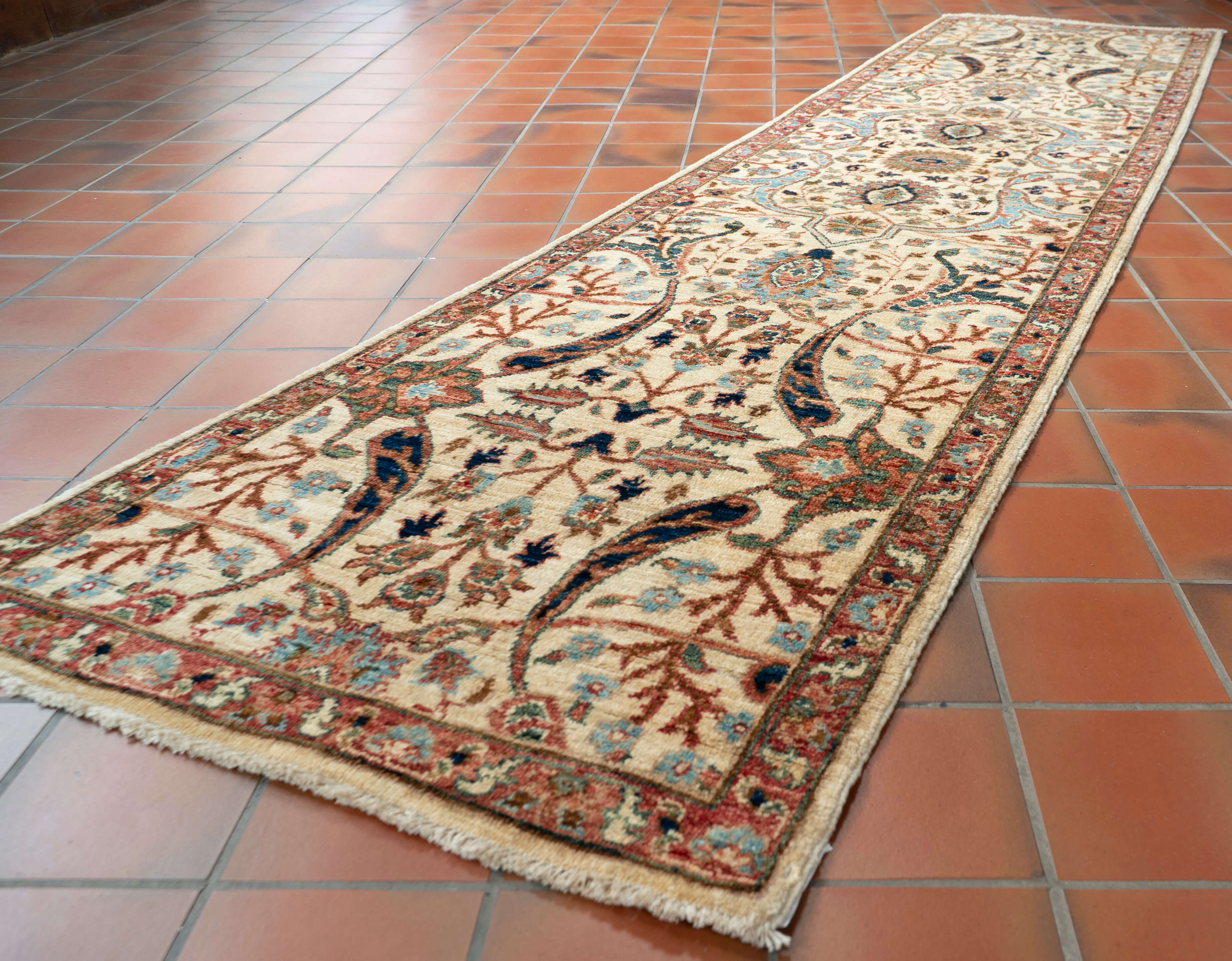 Experience the artisanal beauty of our Handmade Afghan Choeb Rang runner. Skilled weavers in northwest Afghanistan make Each runner of vegetable-dyed handspun wool. Its classic style and interesting design make it a striking addition to any space. With a cream background and accent colours of dark green, navy blue, pale blue, and brick, this runner is visually appealing but also practical and hardwearing. Elevate your home with this exclusive piece.