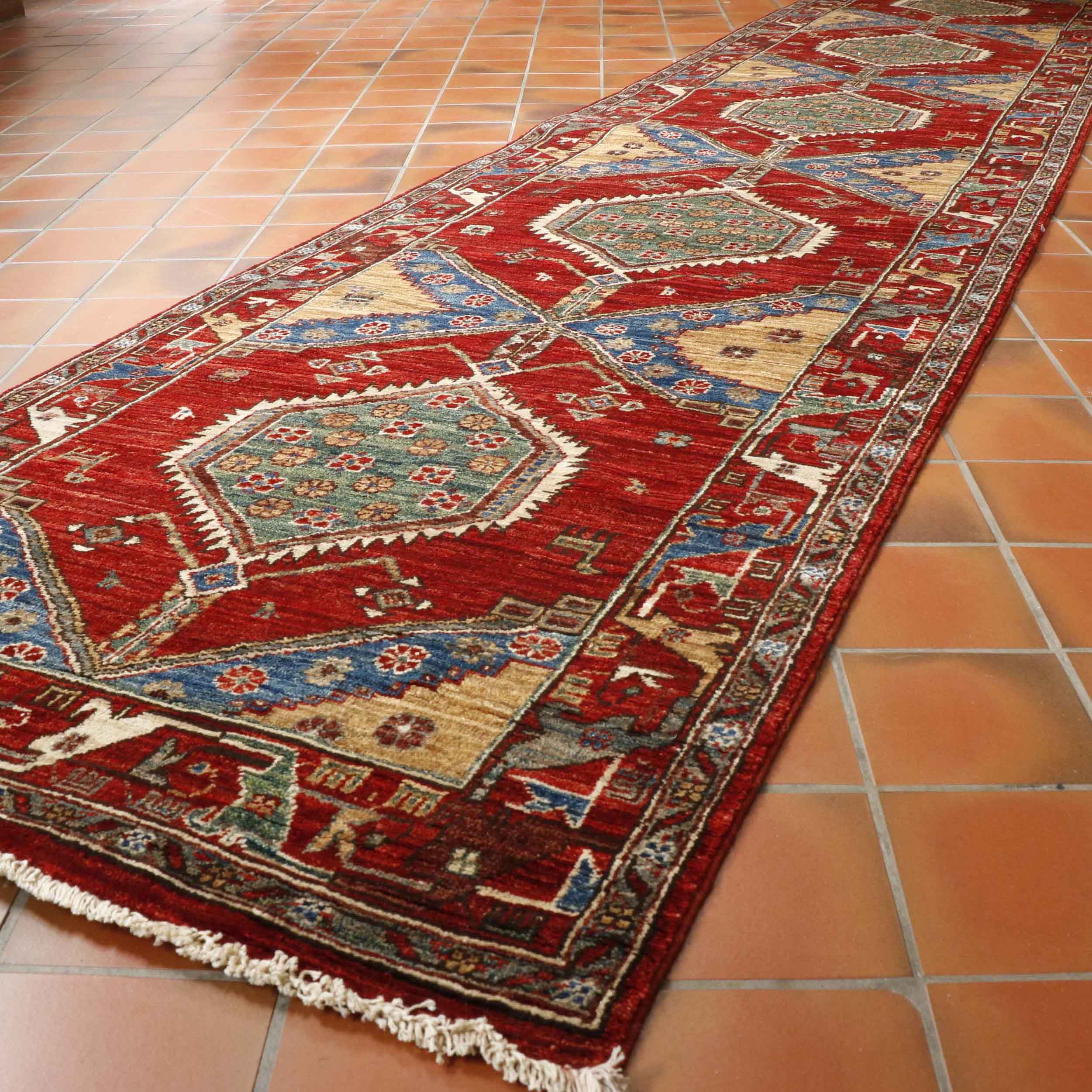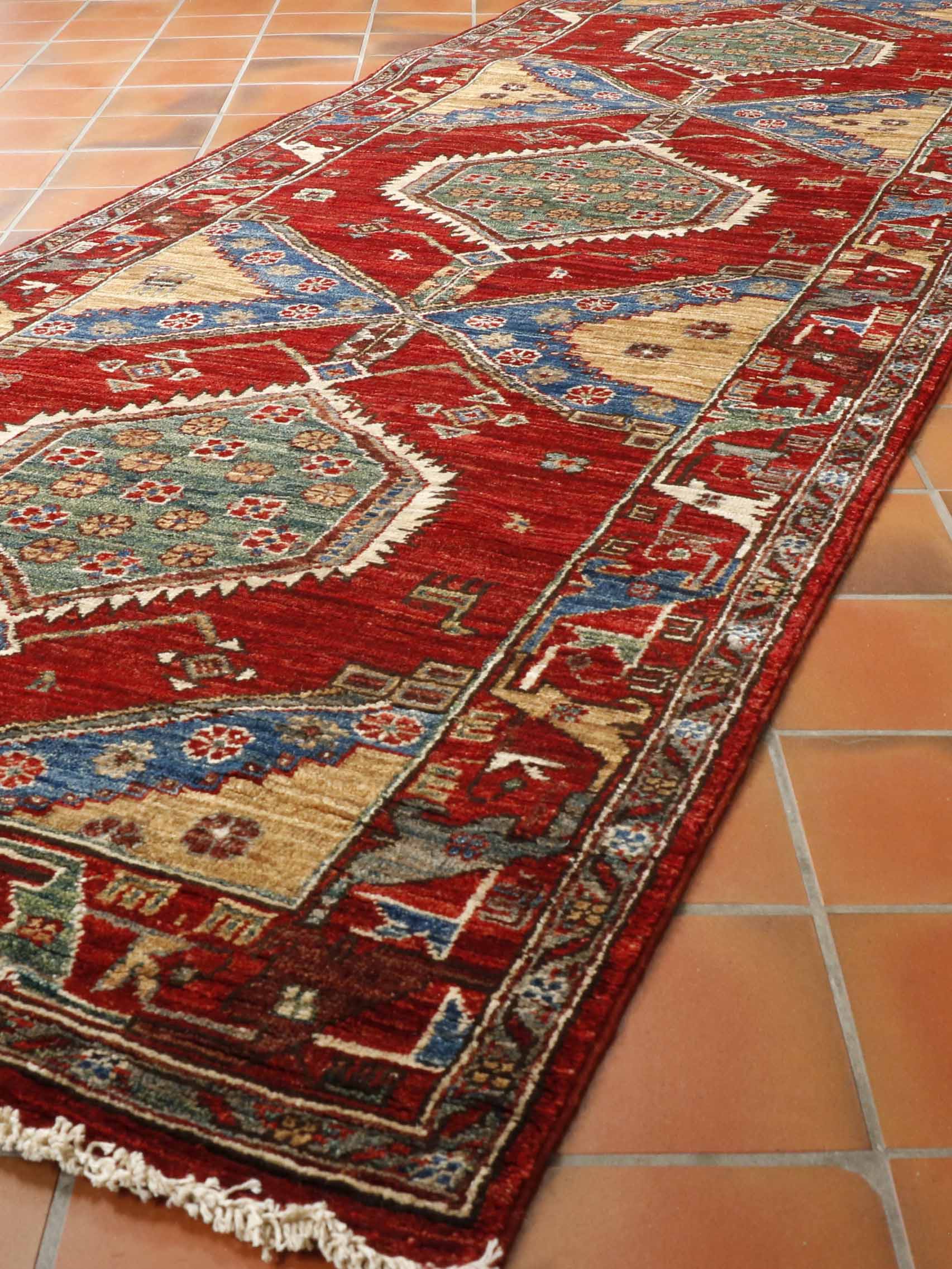 This Afghan Choeb Rang runner is certainly rich in colour, and with its classic design, I am sure it will be very welcoming as you enter your home. Made from handspun vegetable-dyed wool, it will be very practical and hard-wearing for your hallway, corridor, or landing. Runners of this length are always very difficult to find. I just love the additional character created by adding the stylised animals.