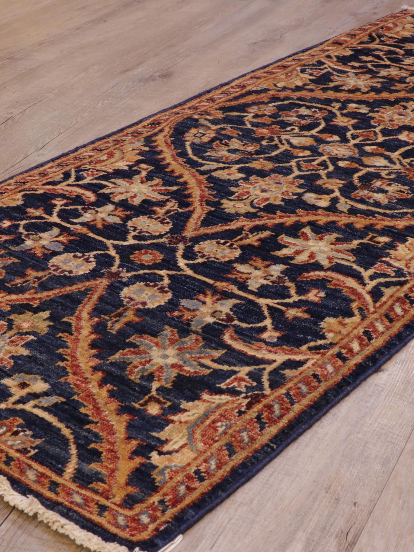 Introducing our Handmade Afghan Choeb Rang short runner. Created by skilled artisans in northwest Afghanistan, it features a navy blue background with rust and gold accents, all made from hand-spun vegetable-dyed wool. Perfect for adding a touch of luxury to your home, this practical and hardwearing runner is ideal for use on your landing or by your bed. Elevate your space with this classic oriental design, handmade in a cottage industry where traditional skills are passed down through the generations.Please click the hyperlinks in gold if you are interested in additional information.This unique and varied collection is produced in northwest Afghanistan and...
