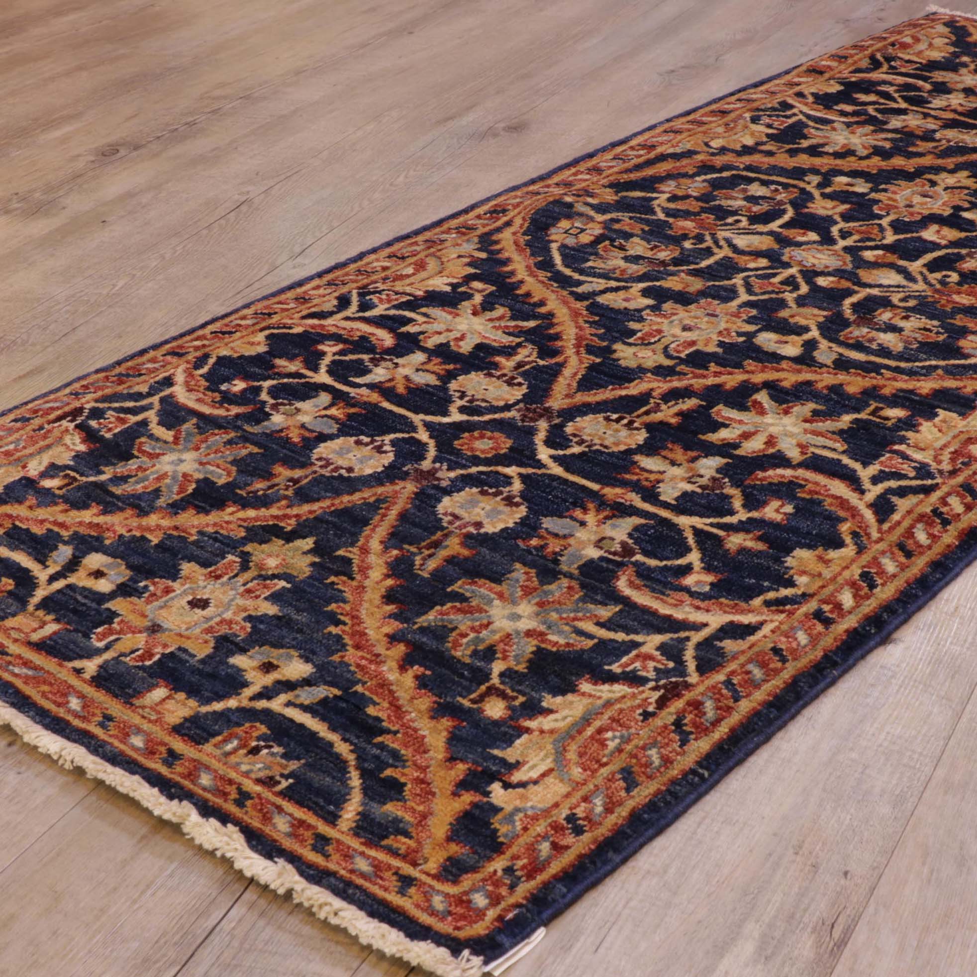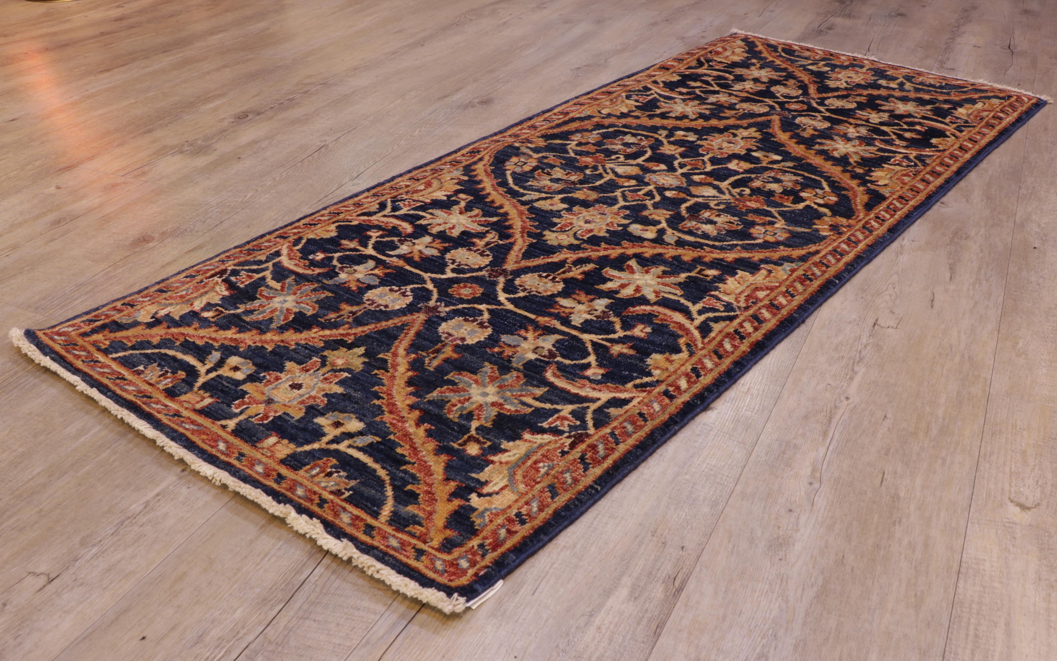 Introducing our Handmade Afghan Choeb Rang short runner. Created by skilled artisans in northwest Afghanistan, it features a navy blue background with rust and gold accents, all made from hand-spun vegetable-dyed wool. Perfect for adding a touch of luxury to your home, this practical and hardwearing runner is ideal for use on your landing or by your bed. Elevate your space with this classic oriental design, handmade in a cottage industry where traditional skills are passed down through the generations.