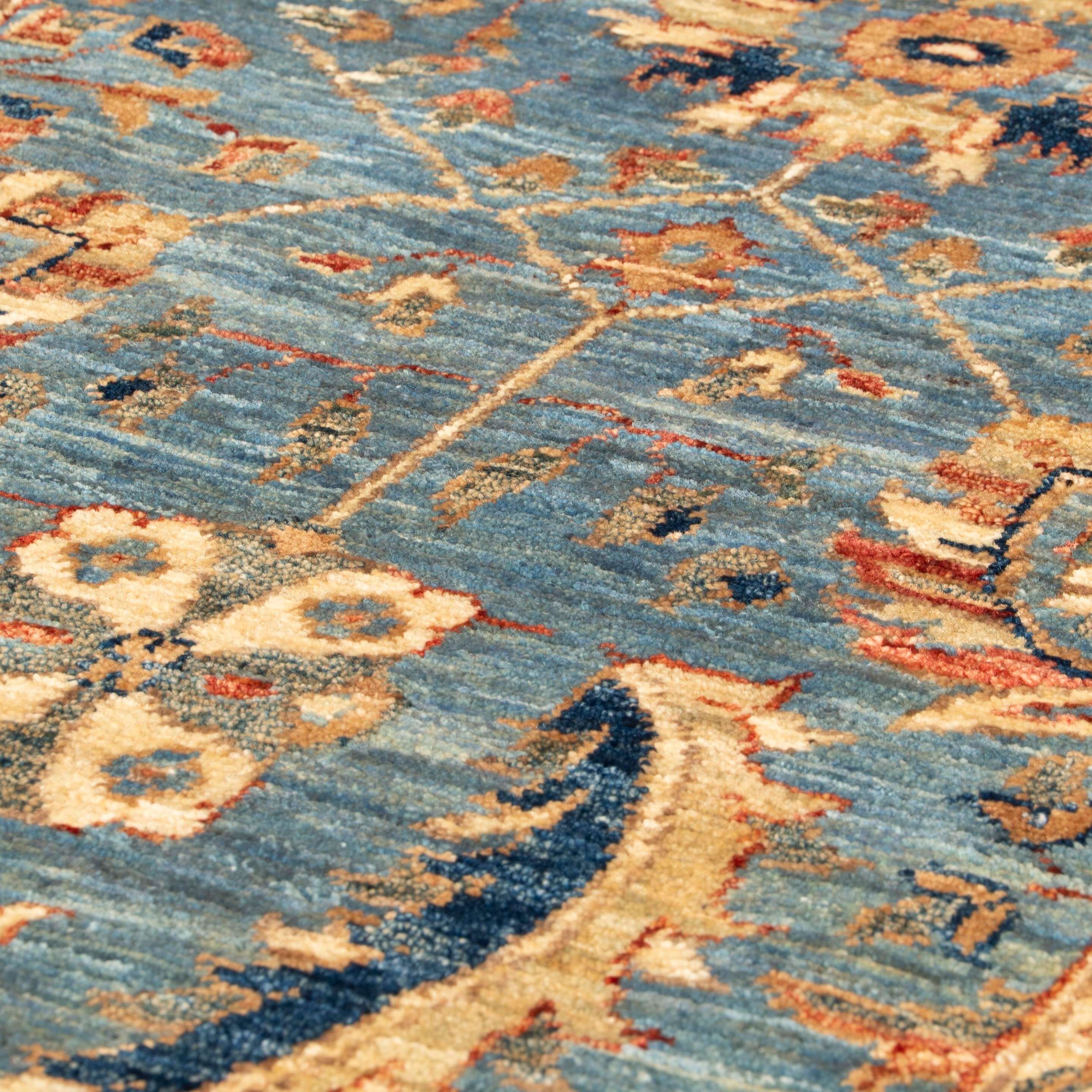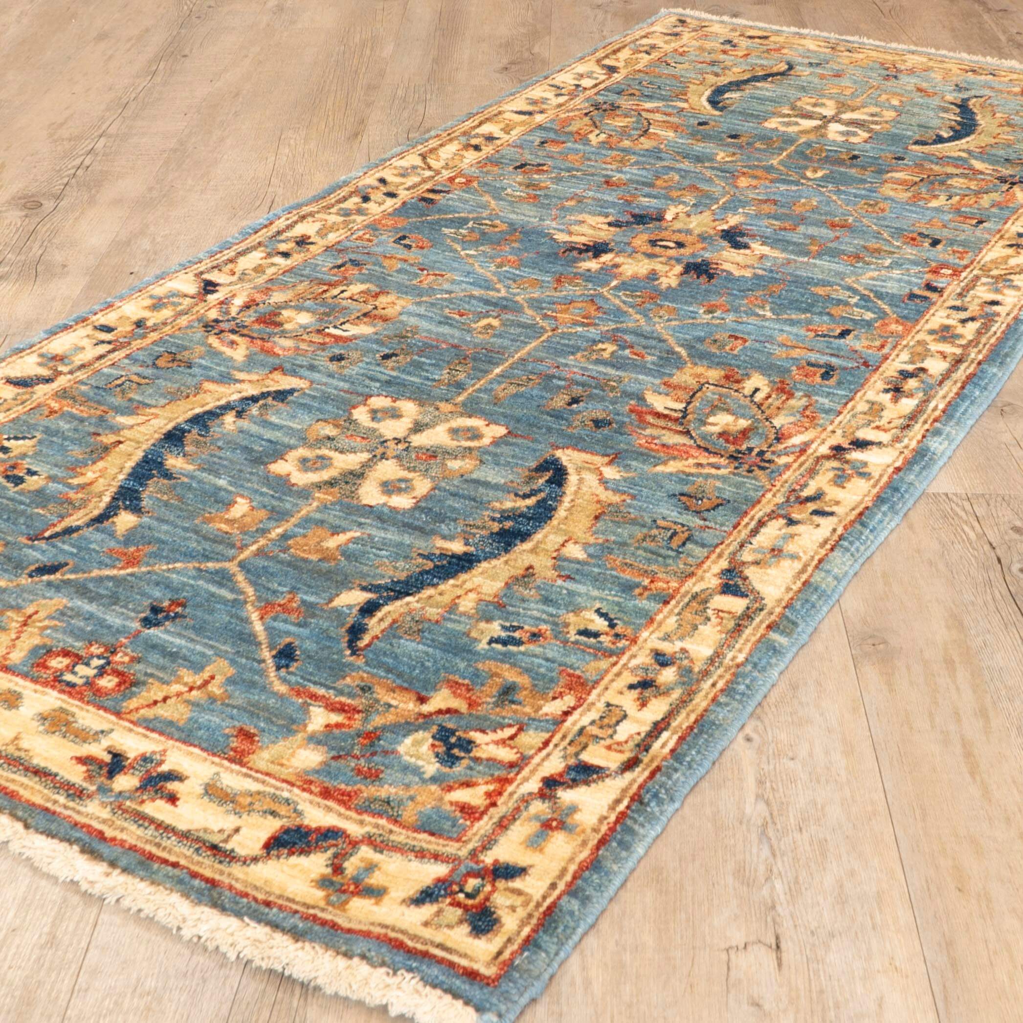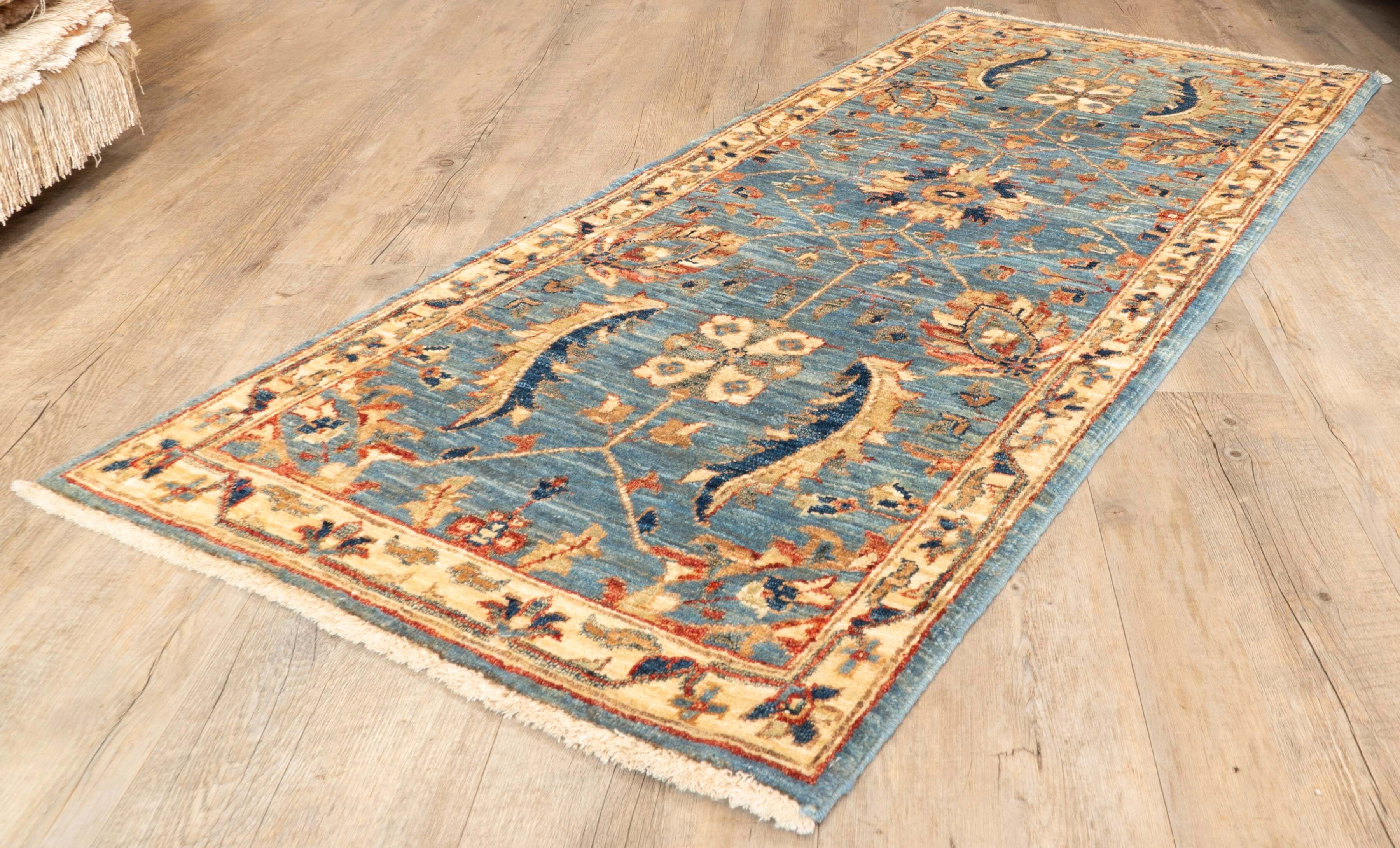 Enhance your living space with this distinctive handmade Afghan Choeb Rang short runner, featuring a pretty design that adds character and charm. The harmonious blend of soft blue and cream offers subtlety, while the durable wool construction ensures lasting quality and durability. Elevate your décor with a piece that combines artistic uniqueness and enduring craftsmanship, moving beyond the ordinary to bring a sophisticated touch to your home. Please click the hyperlinks in gold if you are interested in additional information.This unique and varied collection is produced in northwest Afghanistan and has a similar construction to the Ziegler rugs. The wool is sheared by hand from...