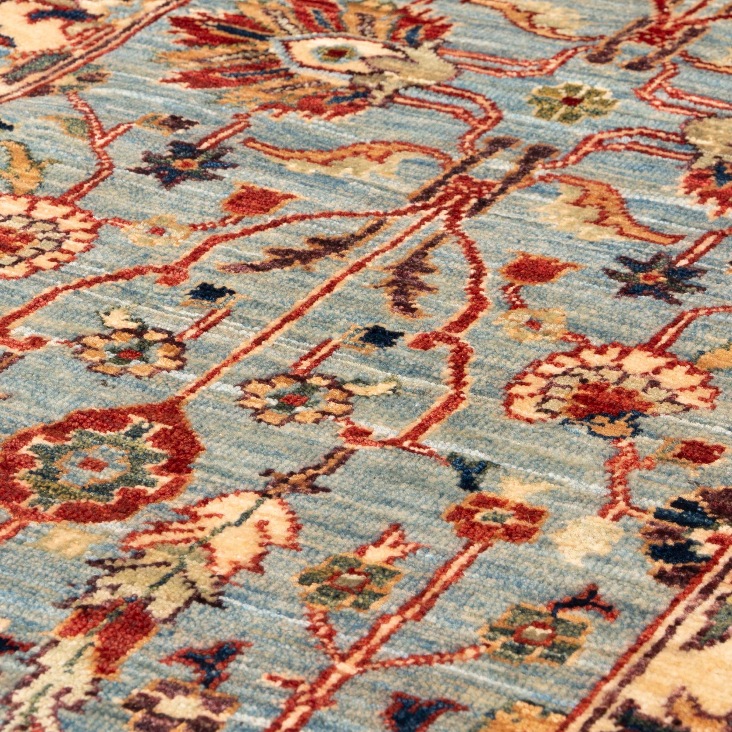 This unique and varied collection, produced in northwest Afghanistan, has a construction similar to that of the Ziegler rugs. The wool is sheared by hand from the indigenous Karukal sheep. It is then handspun and coloured using natural vegetable and mineral dyes. These pieces have utilised attractive old Persian designs and patterns from unusual museum pieces. They are generally more vibrant colours and less muted shades. However, the exciting and uplifting colours remain almost Jewel-like. The final finishing processes are carried out in Pakistan, where some post-production occurs, including alignment corrections, surface clipping and tumbling, and the washing mentioned earlier.