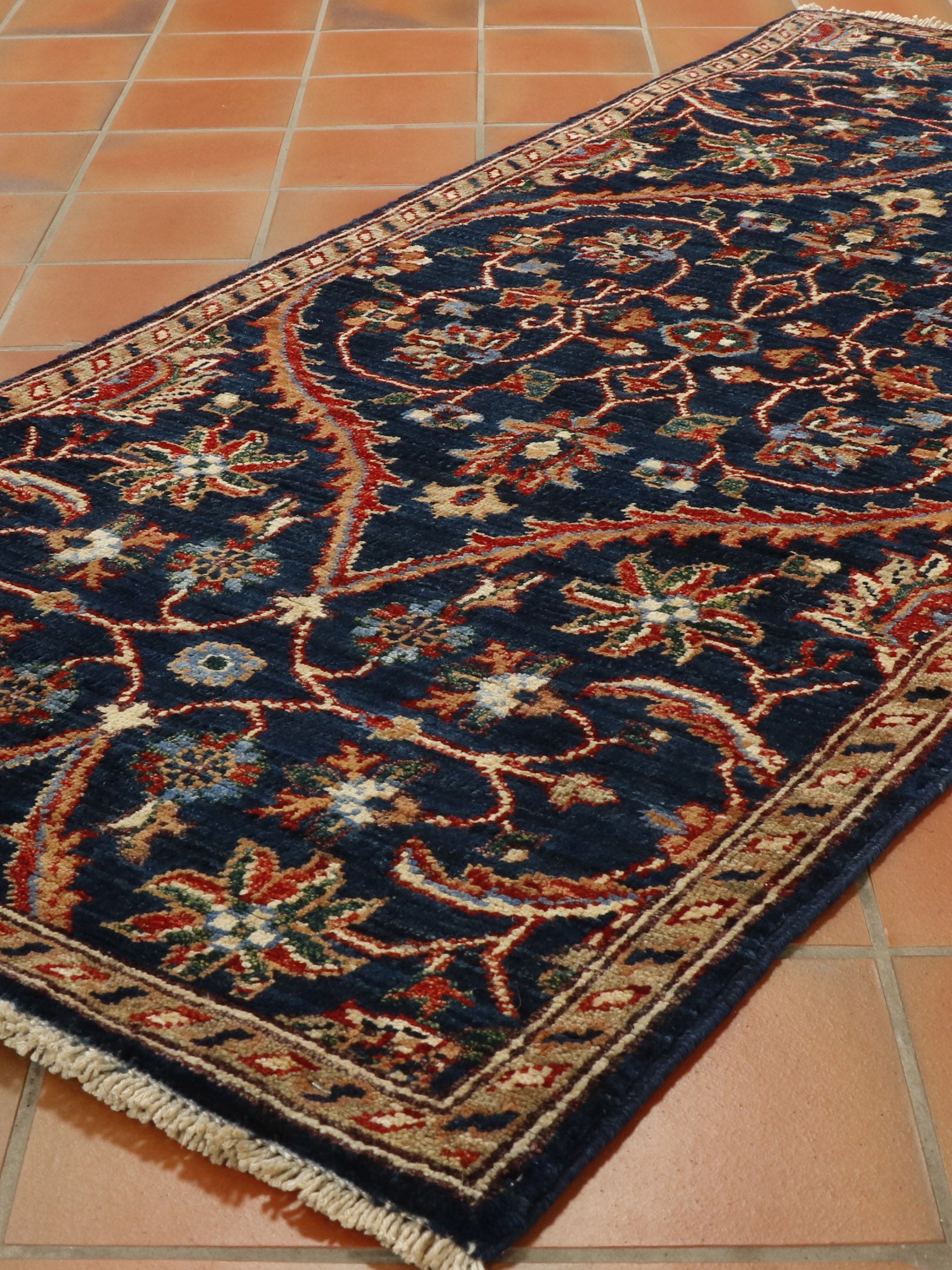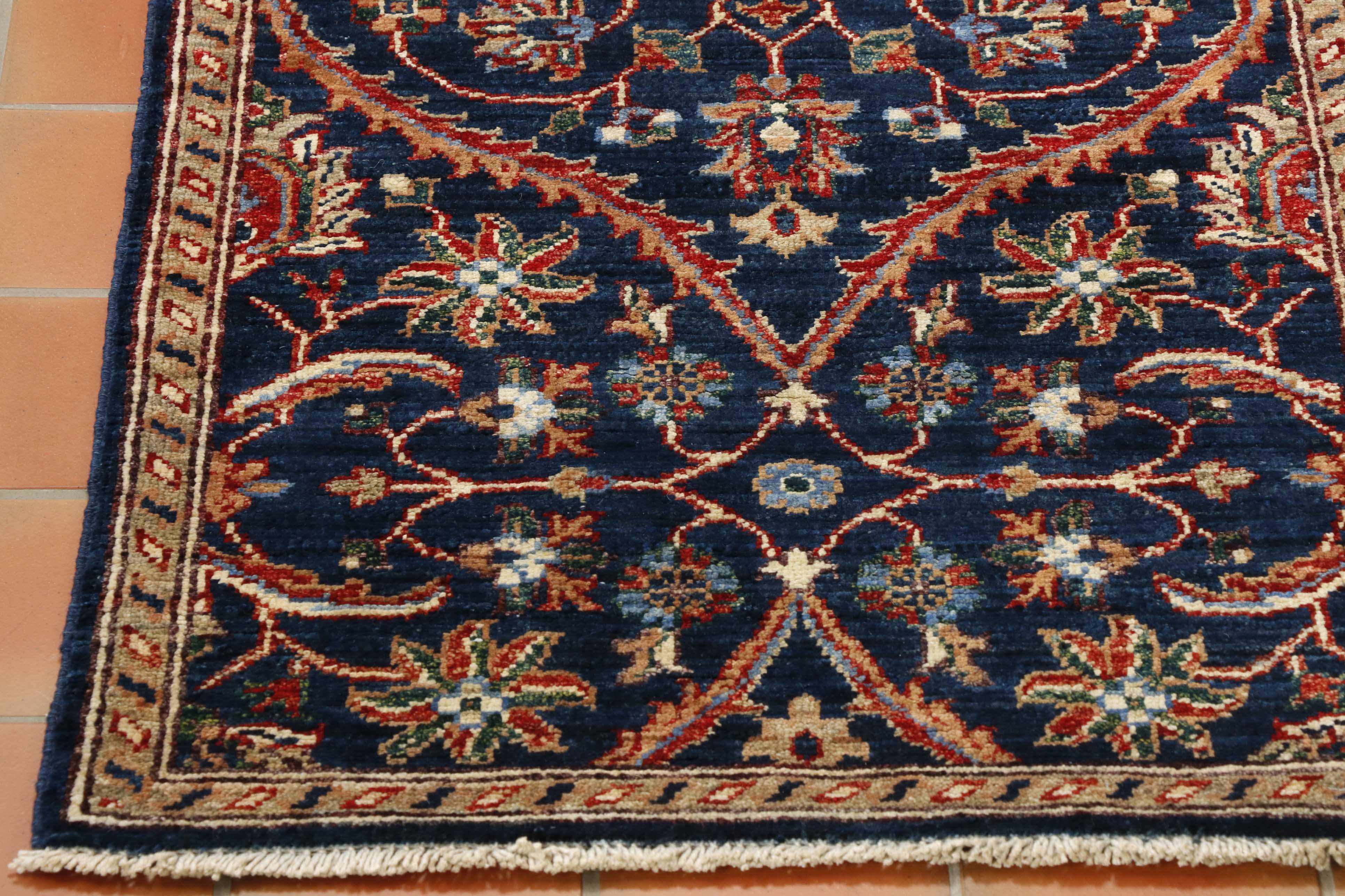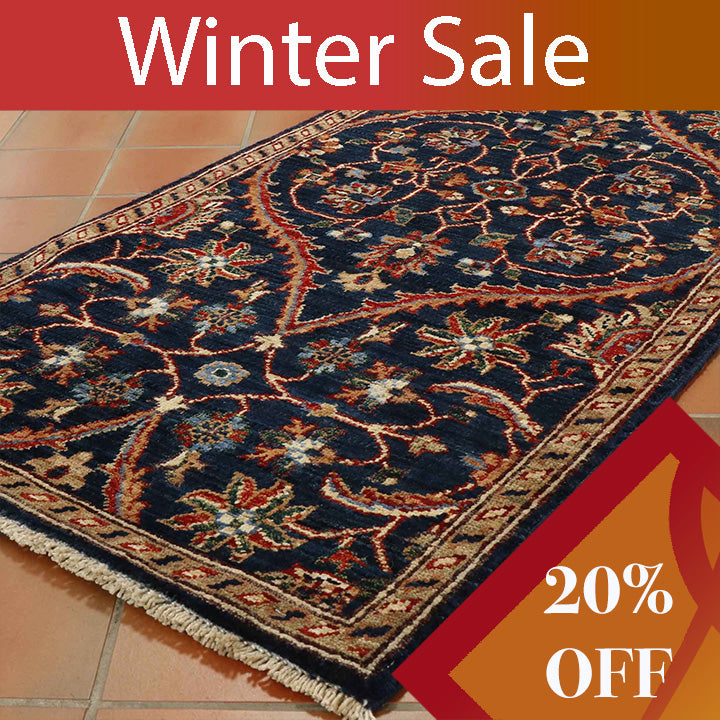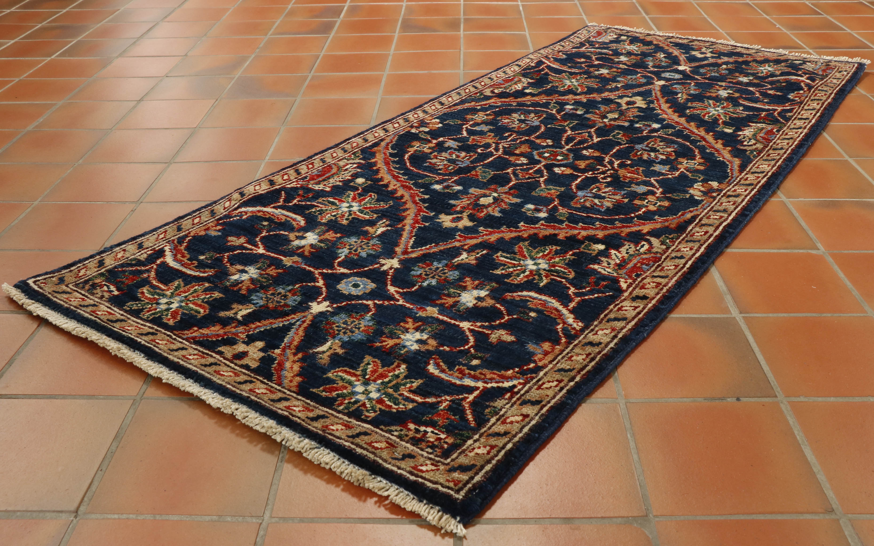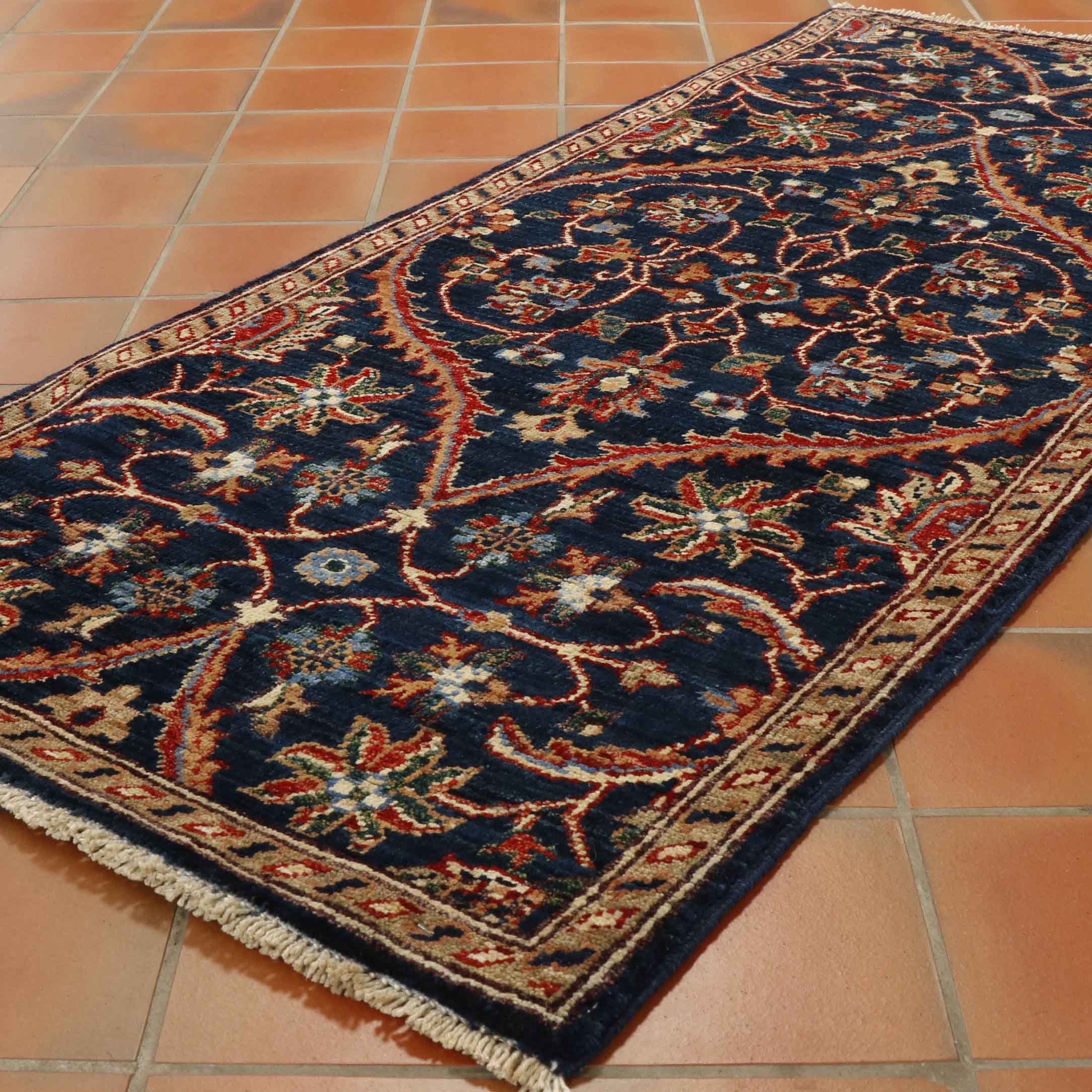 This striking Afghan runner features a classic oriental design, showcased to its best advantage on the dark blue background. A runner like this is useful on a landing or at the foot of the bed. It is a useful size, of excellent quality, practical and hardwearing, suitable for any room in the home.