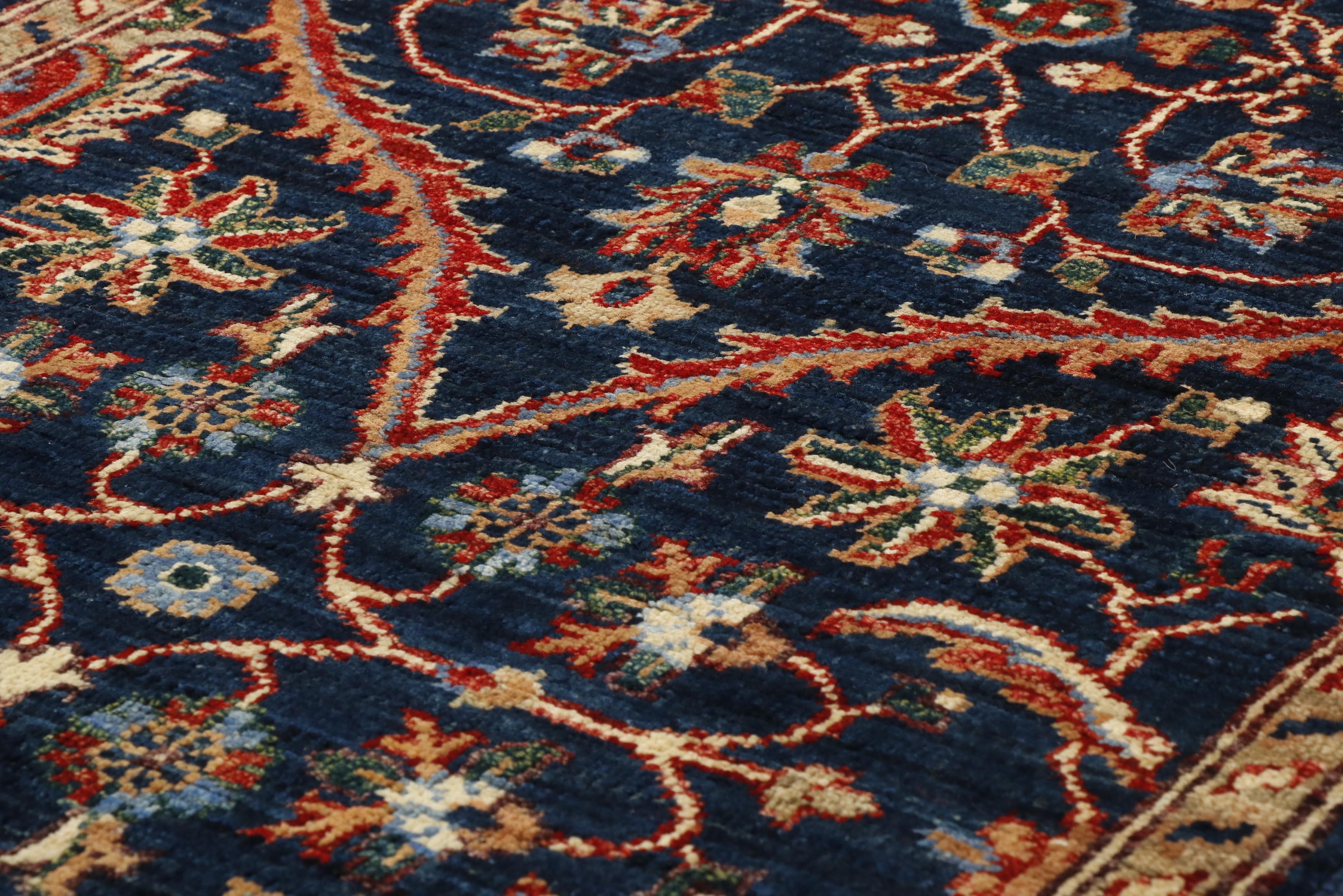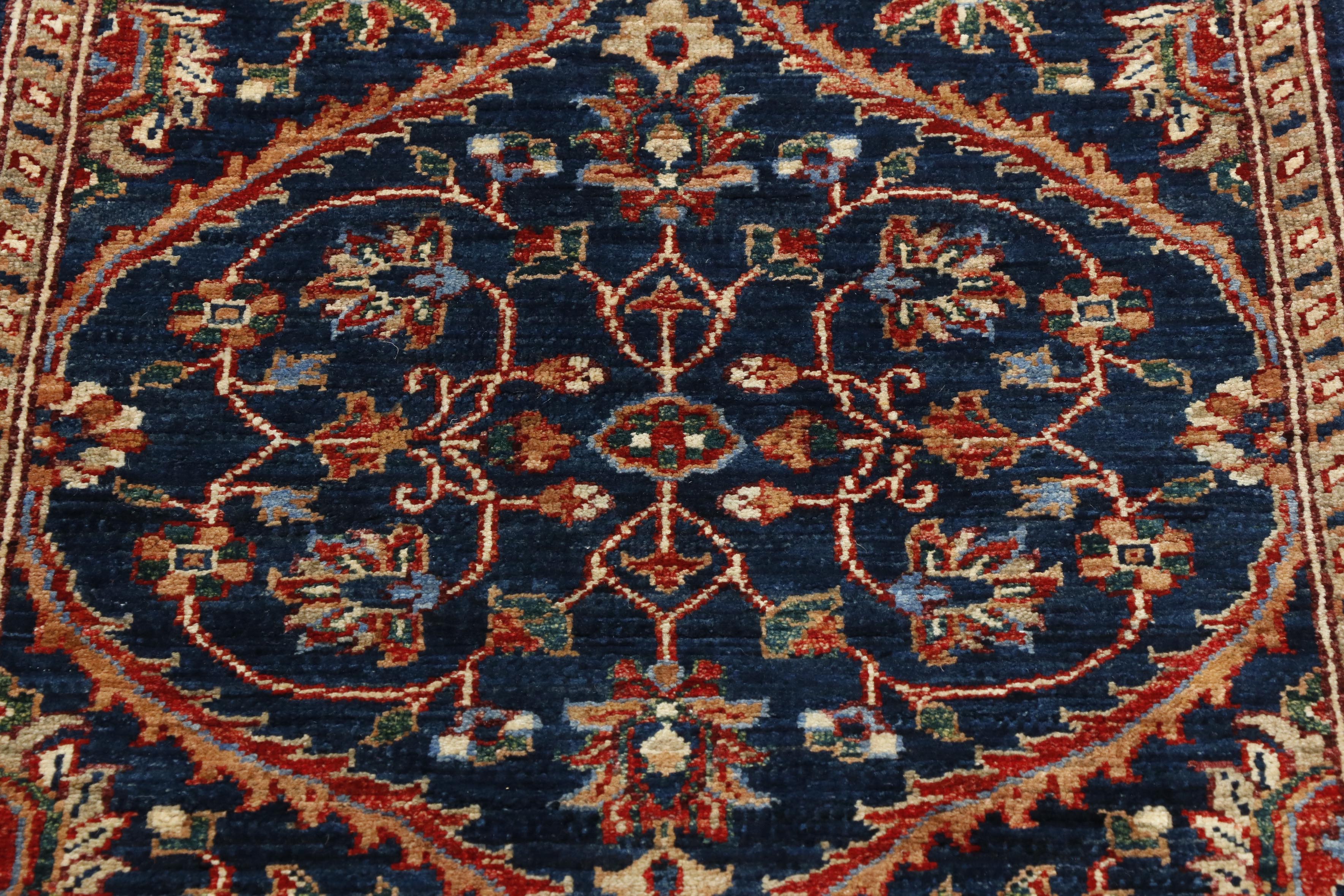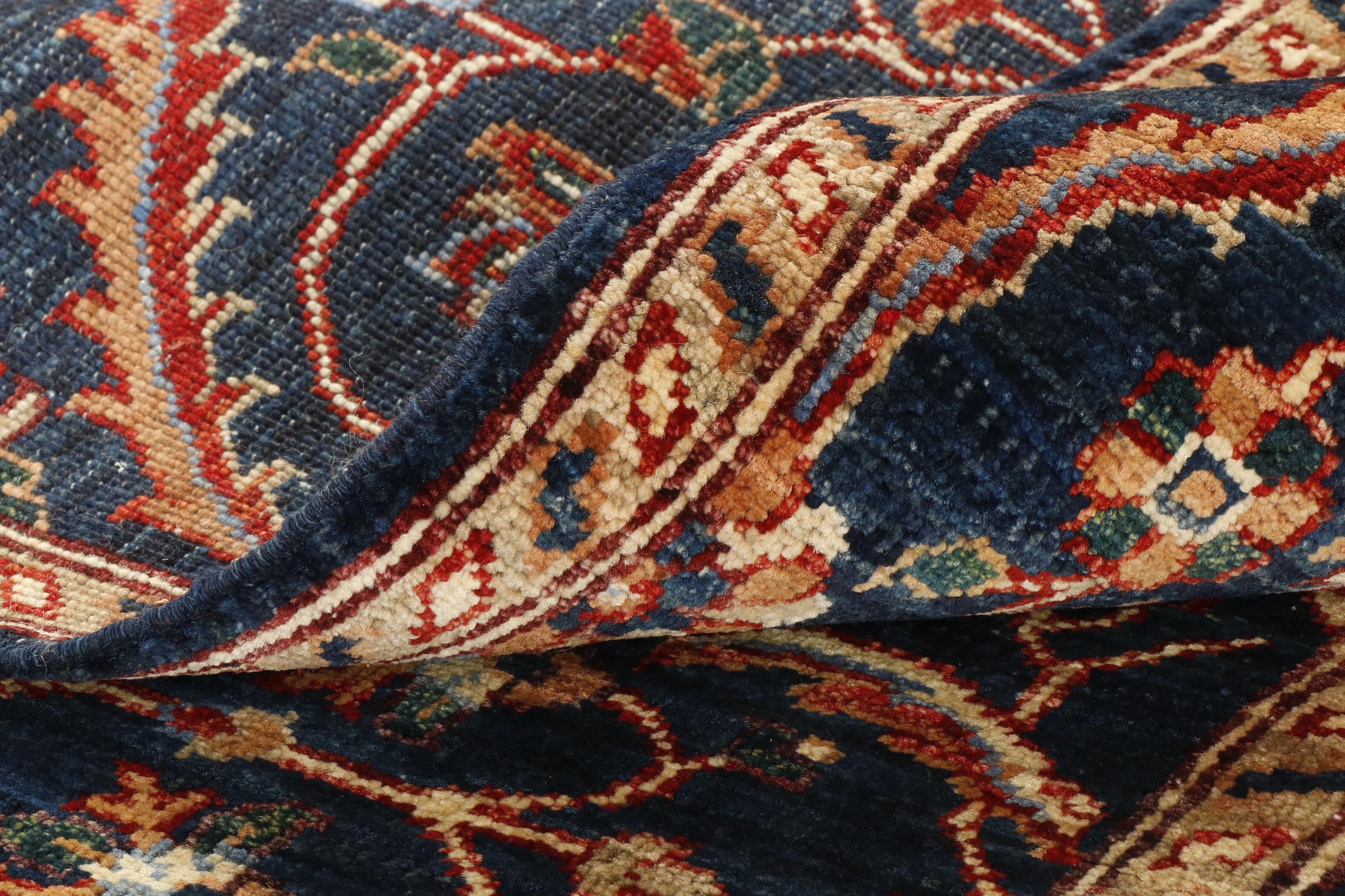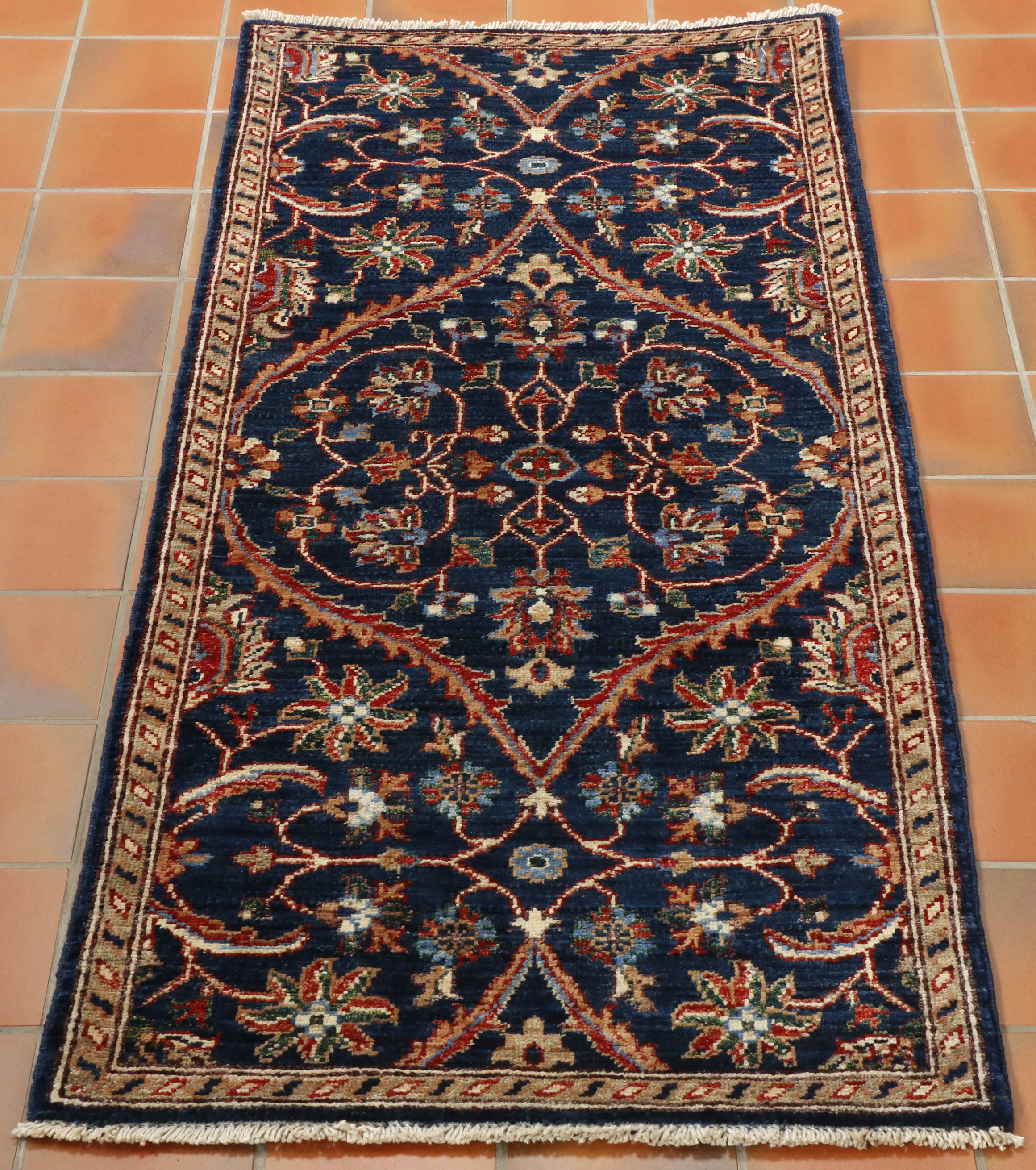 This striking Afghan runner features a classic oriental design, showcased to its best advantage on the dark blue background. A runner like this is useful on a landing or at the foot of the bed. It is a useful size, of excellent quality, practical and hardwearing, suitable for any room in the home.