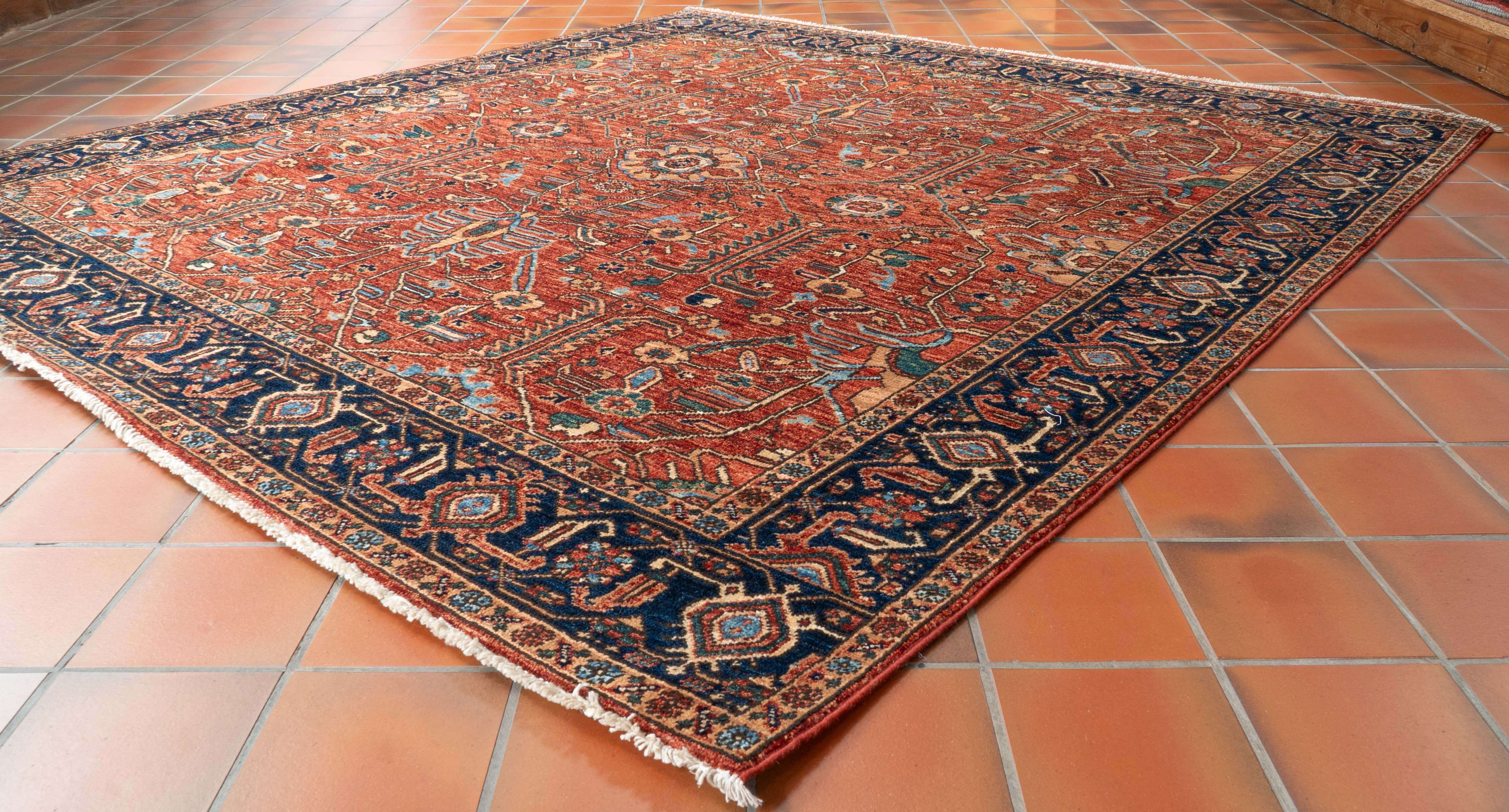 Enhance your living space with this distinctive handmade Afghan Choeb Rang rug, featuring an all-over design with character and charm. The harmonious blend of warm terracotta and navy blue, coupled with the durable wool construction, ensures lasting quality. Elevate your décor with a piece that combines artistic uniqueness and enduring craftsmanship, moving beyond the ordinary to bring a sophisticated touch to your home.