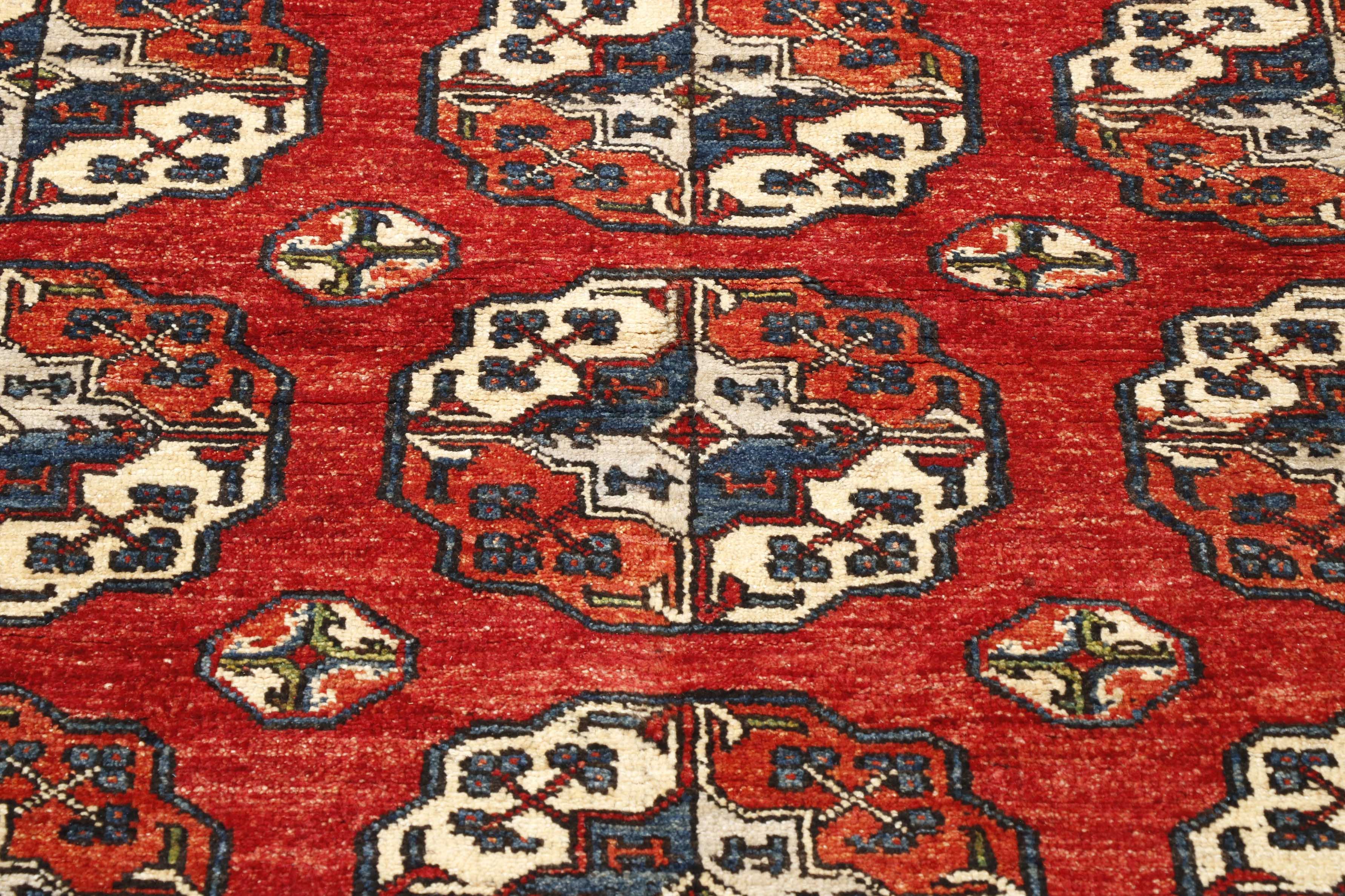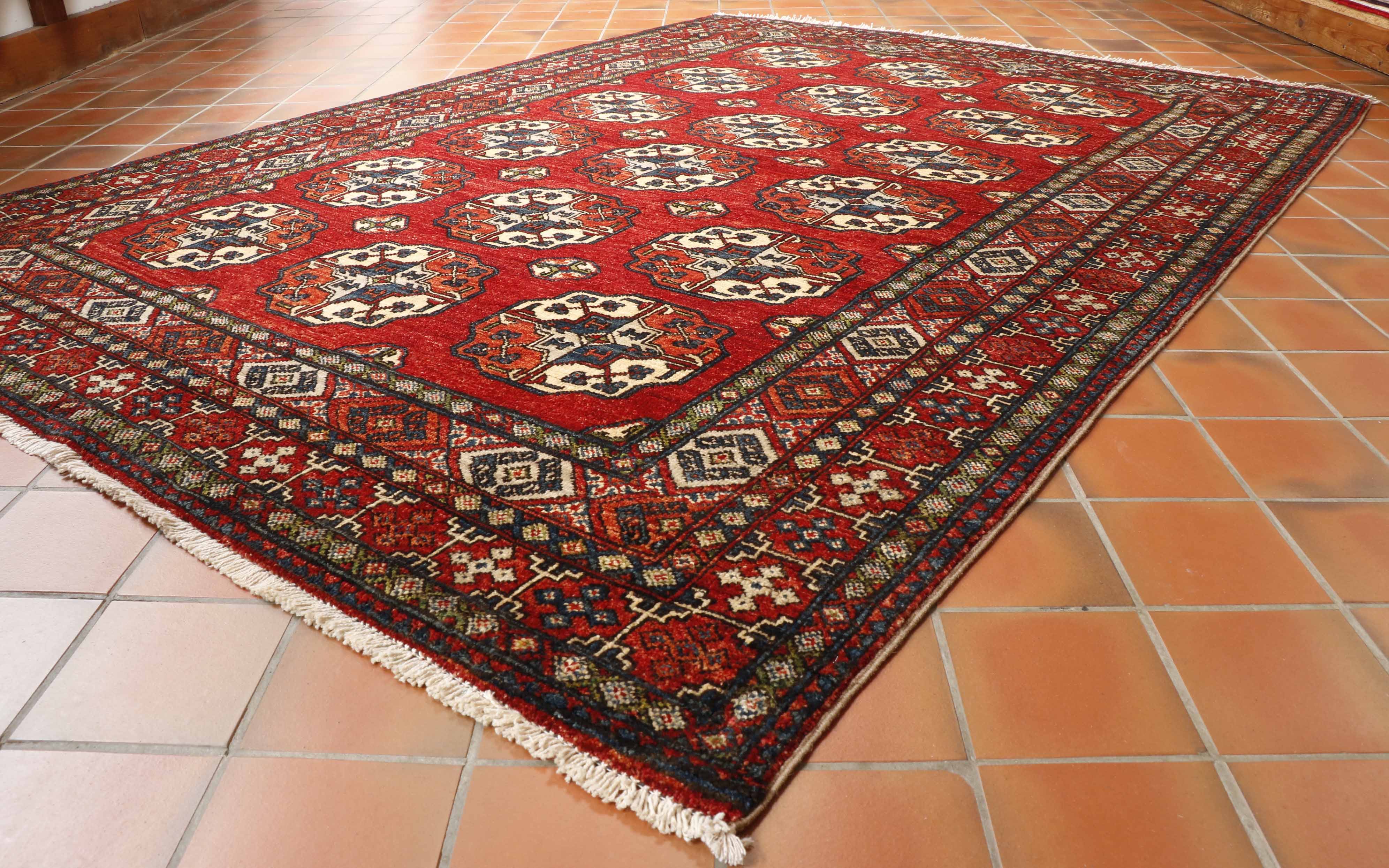 Ersari rugs are hand-knotted using methods passed down from the Turkmen people of Central Asia. The vibrant colours come from vegetable dyes, such as the rich reds produced from boiling the root of the madder plant. These rugs often feature traditional "Gul" (also known as elephant 's-foot) designs.