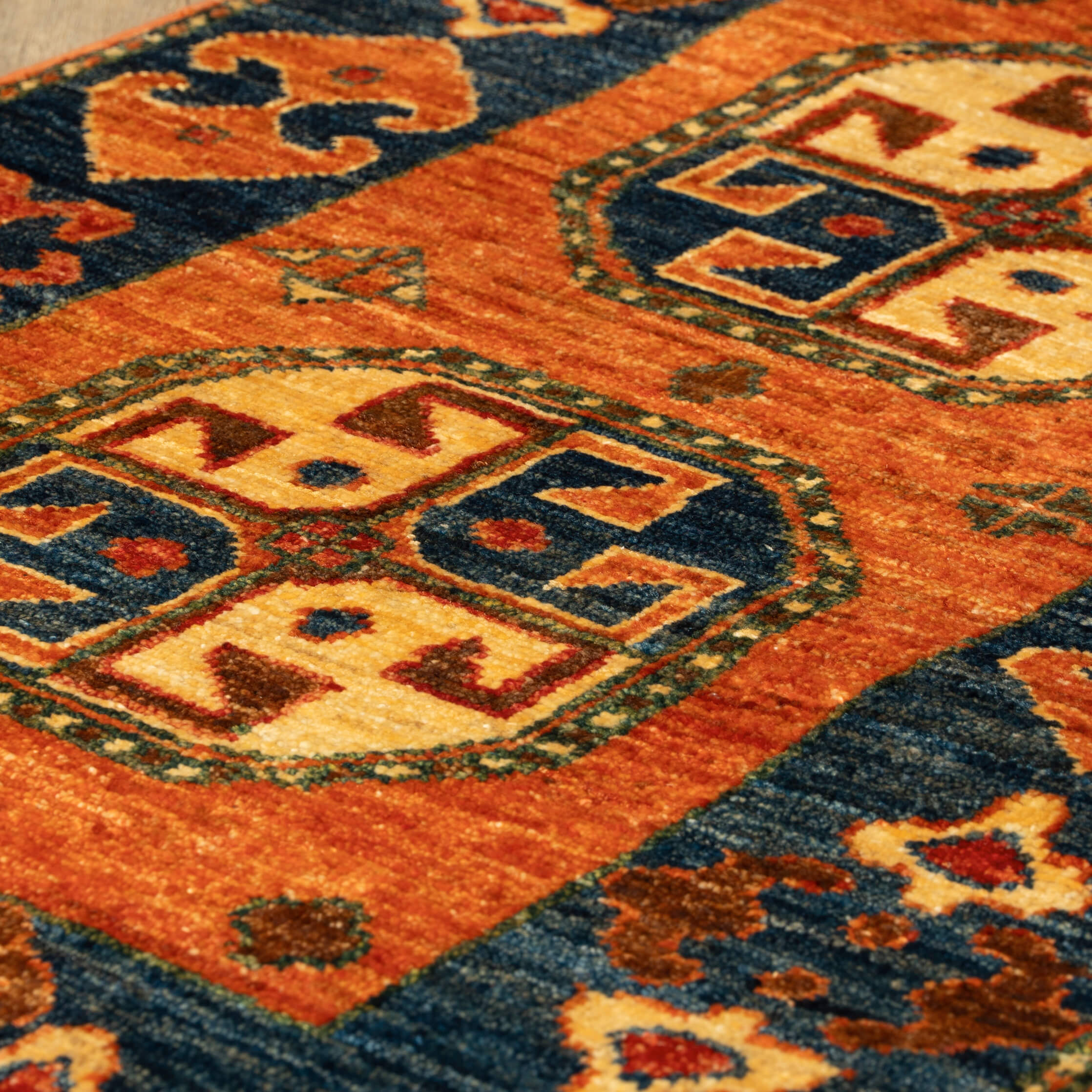 Experience the rich cultural heritage of Afghanistan with our Handmade Afghan Ersari rug. Made by skilled artisan weavers using traditional techniques and vegetable-dyed handspun wool, this practical, hardwearing rug features a beautiful traditional design in a colourful palette, including dark navy blue, soft terracotta, cream, and touches of brown. This timeless piece adds a touch of elegance and quality to your space.