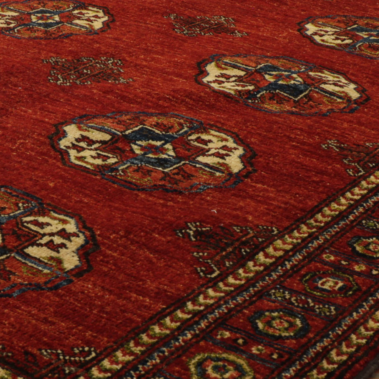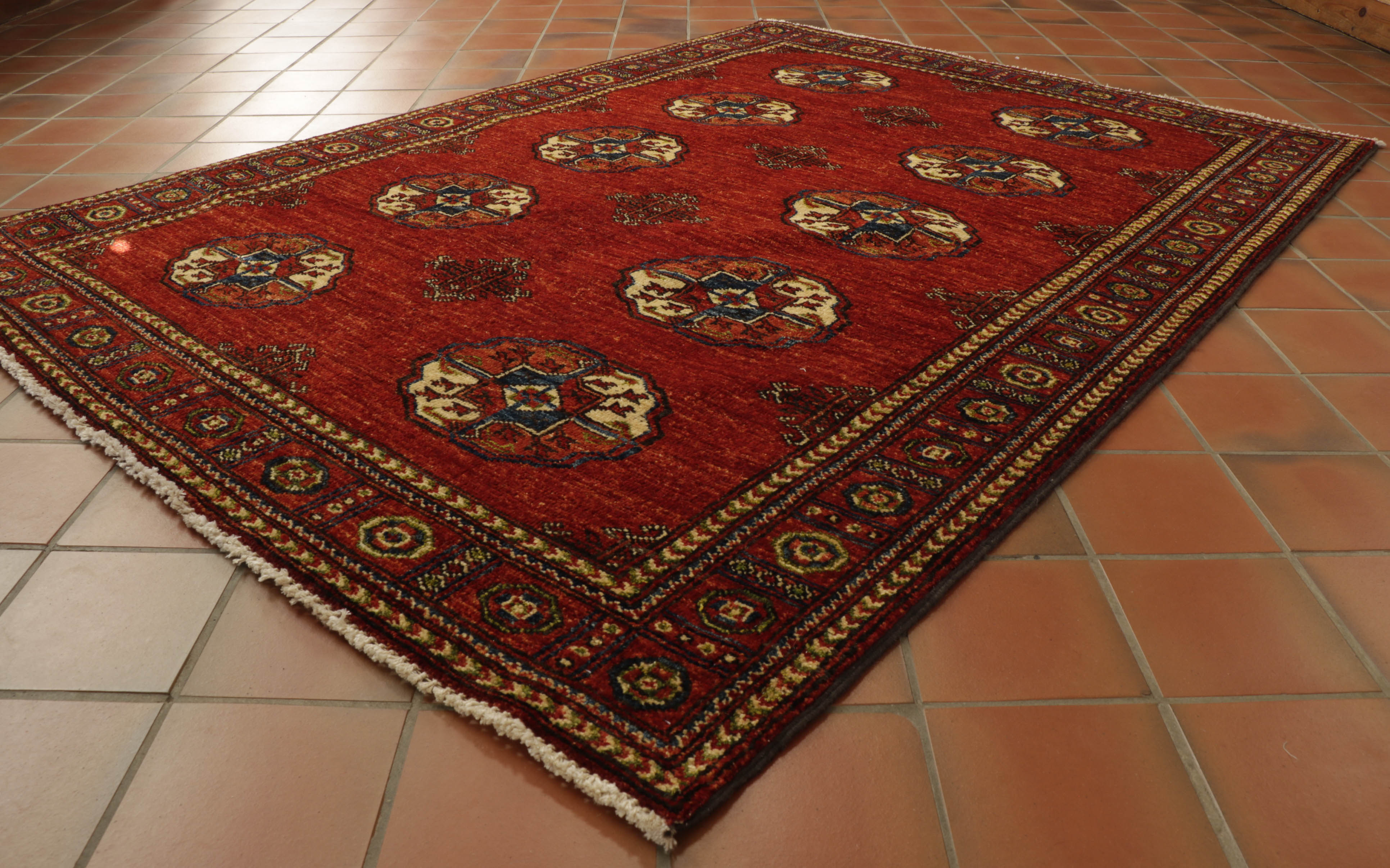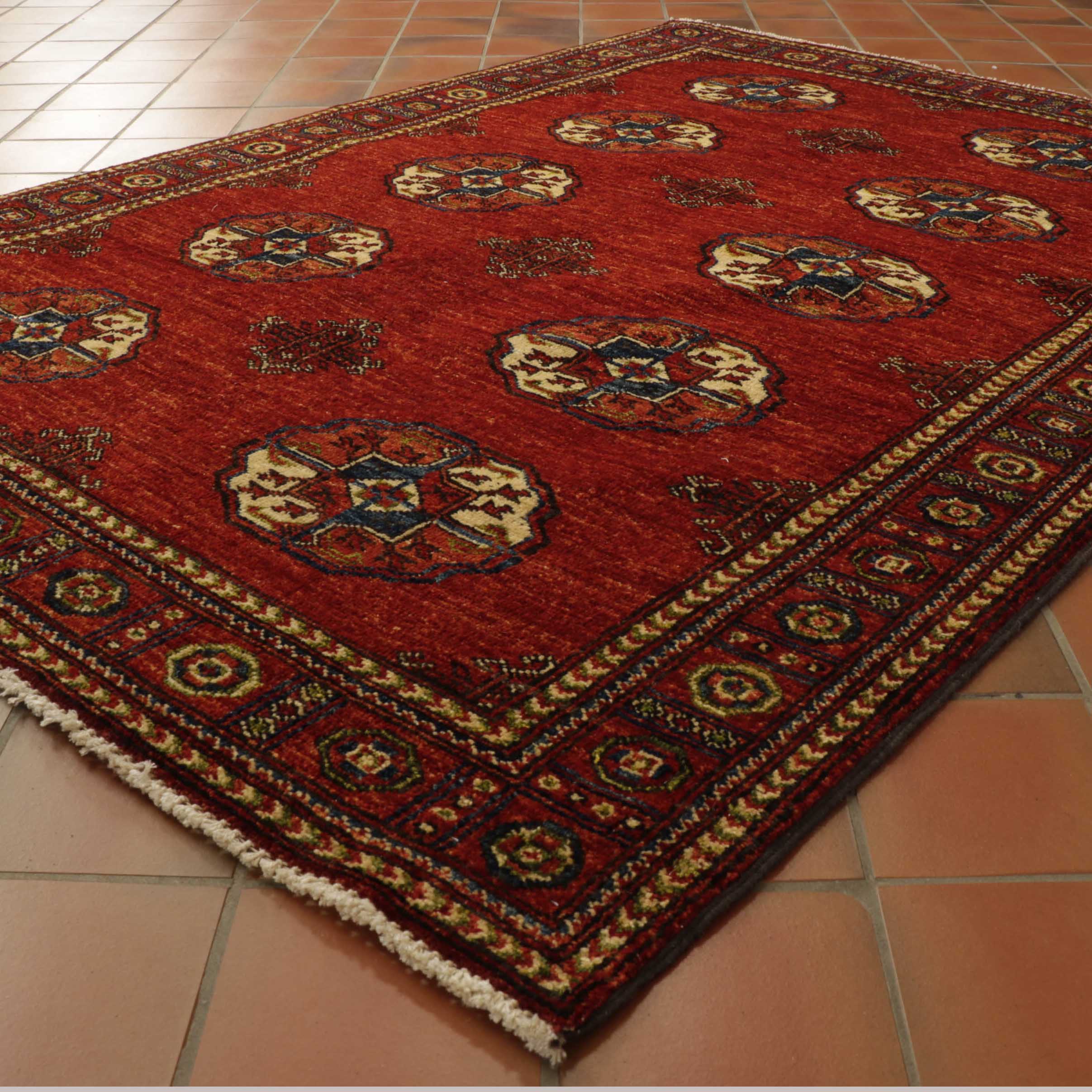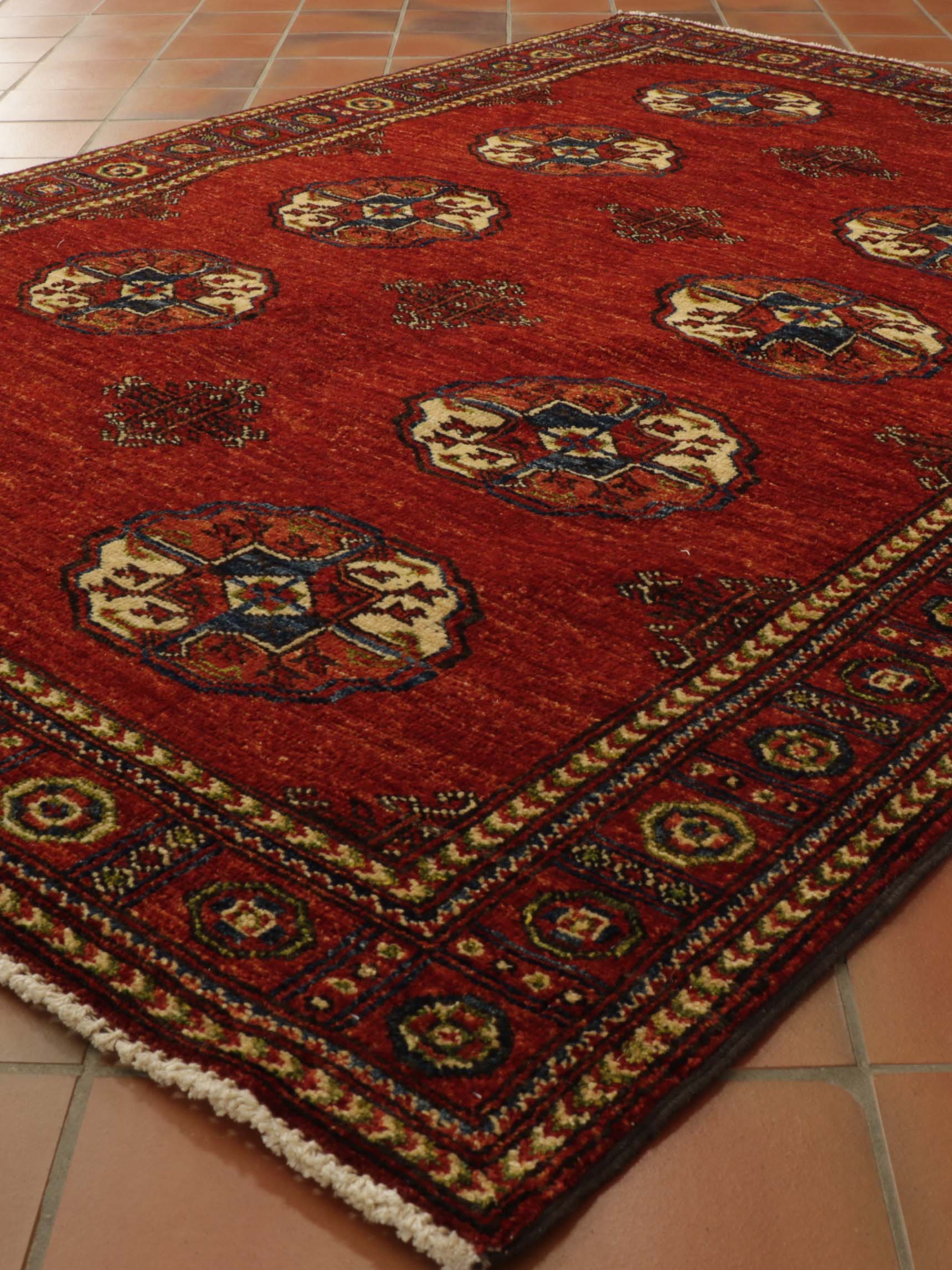 Ersari rugs are hand-knotted using methods passed down from the Turkmen people of Central Asia. The vibrant colours come from vegetable dyes, such as the rich reds produced from boiling the root of the madder plant. These rugs often contain traditional "Gul" (also known as elephant's foot designs).
