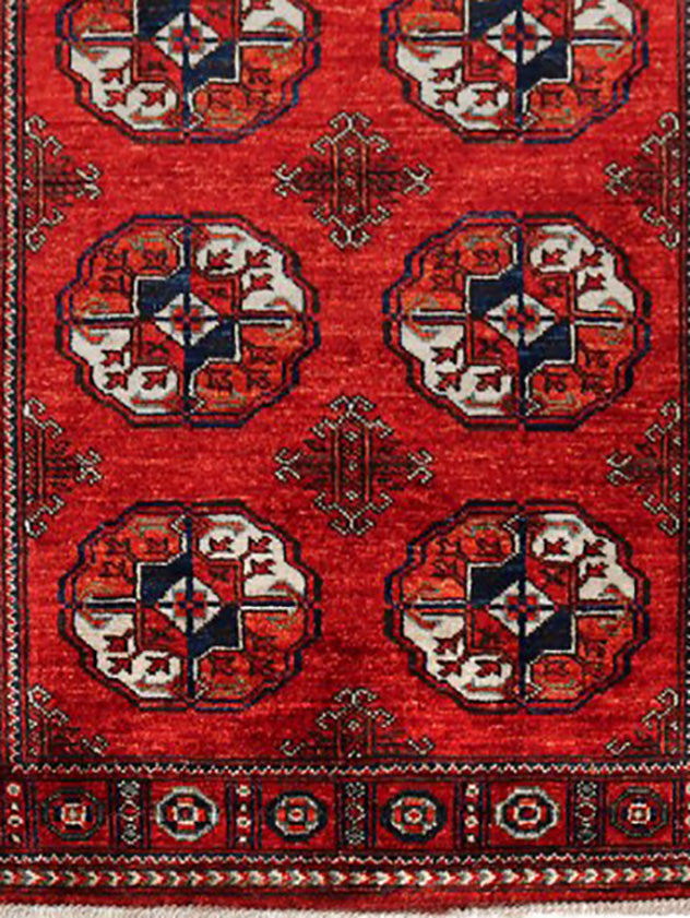 Ersari rugs are hand-knotted using methods passed down from the Turkmen people of Central Asia. The vibrant colours come from vegetable dyes, such as the rich reds produced from boiling the root of the madder plant. These rugs often contain traditional "Gul" (also known as elephant's foot designs).