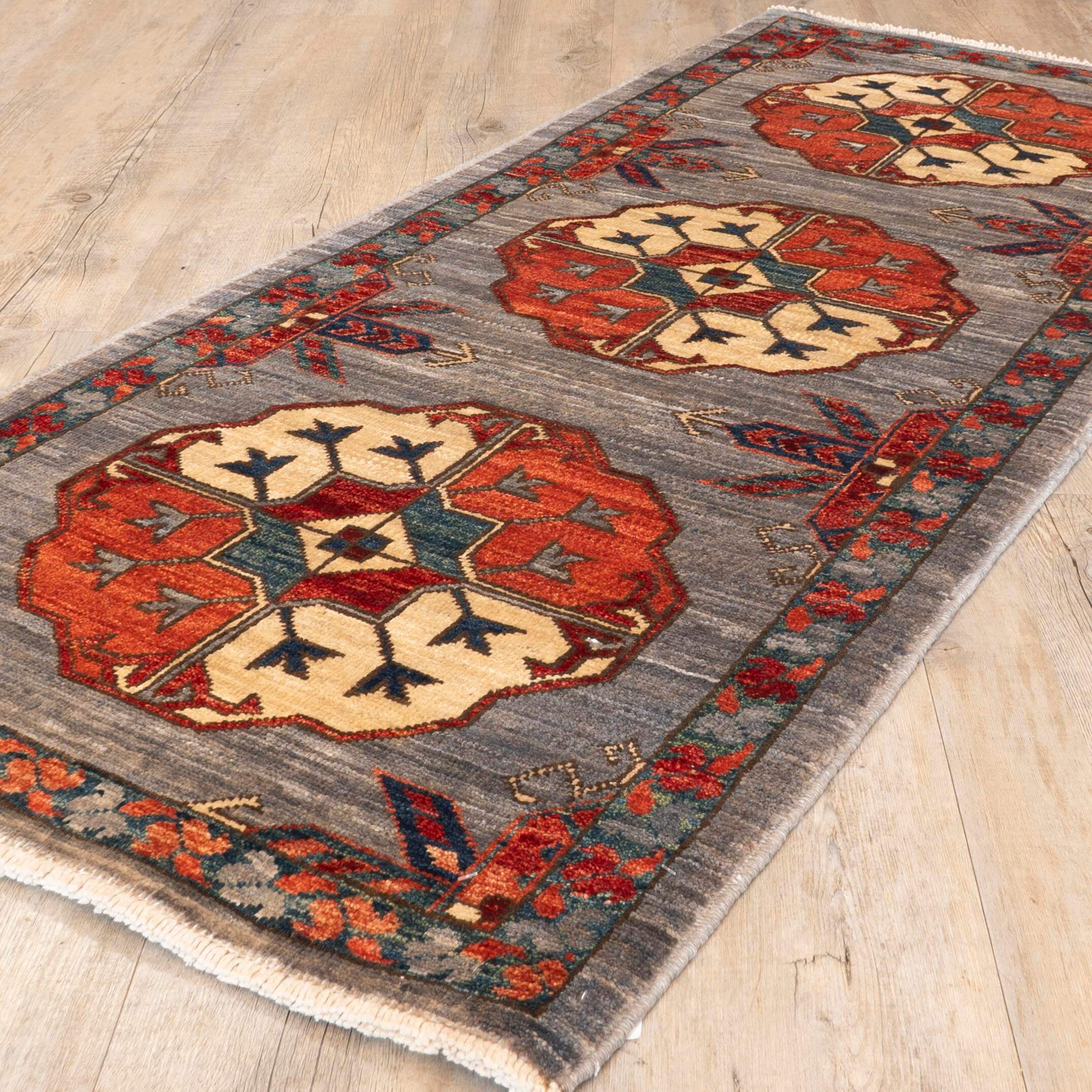 Experience the exquisite craftsmanship of our handmade Afghan Ersari rug. Skilled artisans in northwest Afghanistan weave this traditional design, which has been passed down through generations. Made from vegetable-dyed handspun wool, its beautiful grey, with touches of rust and cream, adds elegance and practicality to any space. With a beautiful lustre and fine quality, this short runner is durable and timeless.