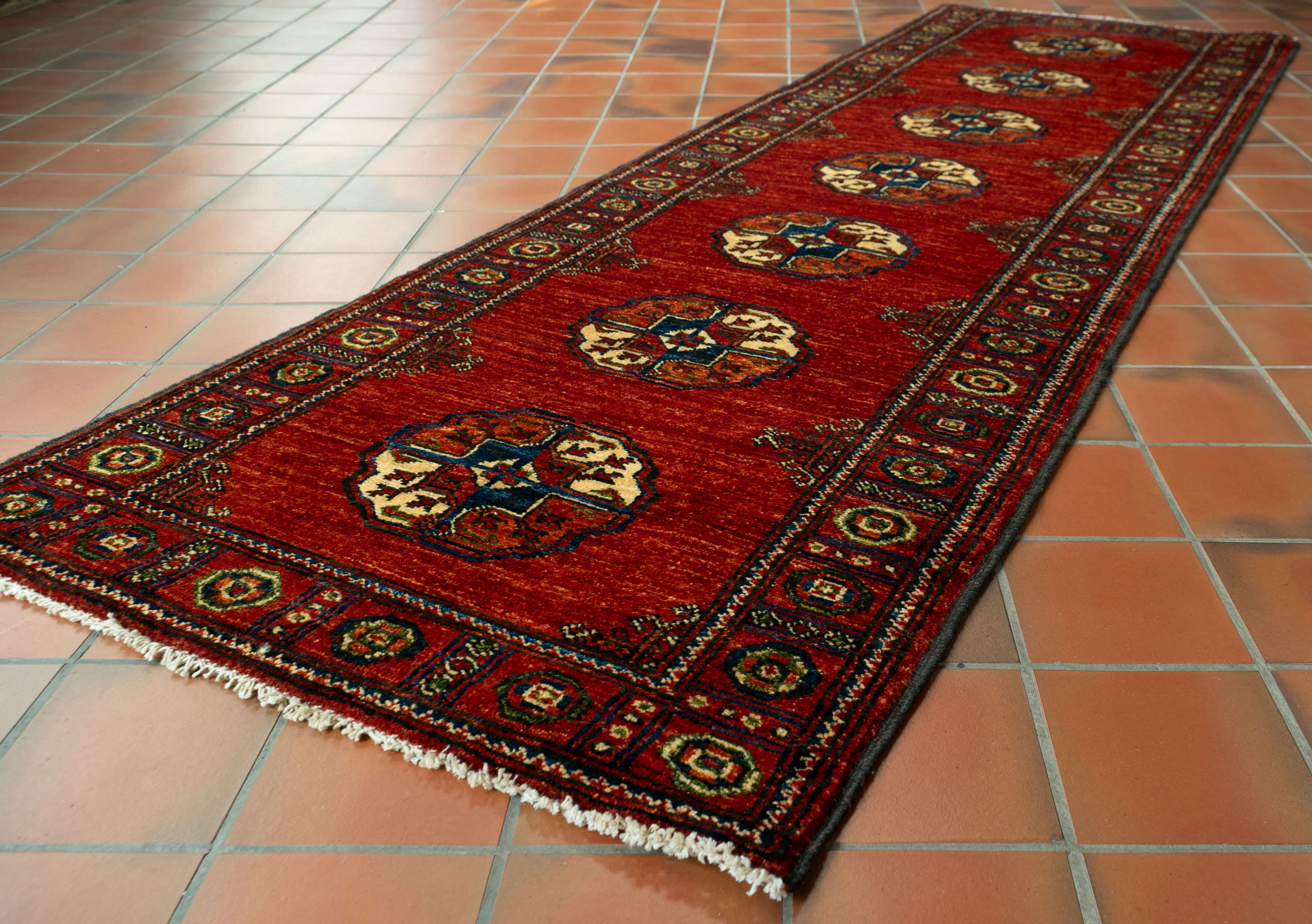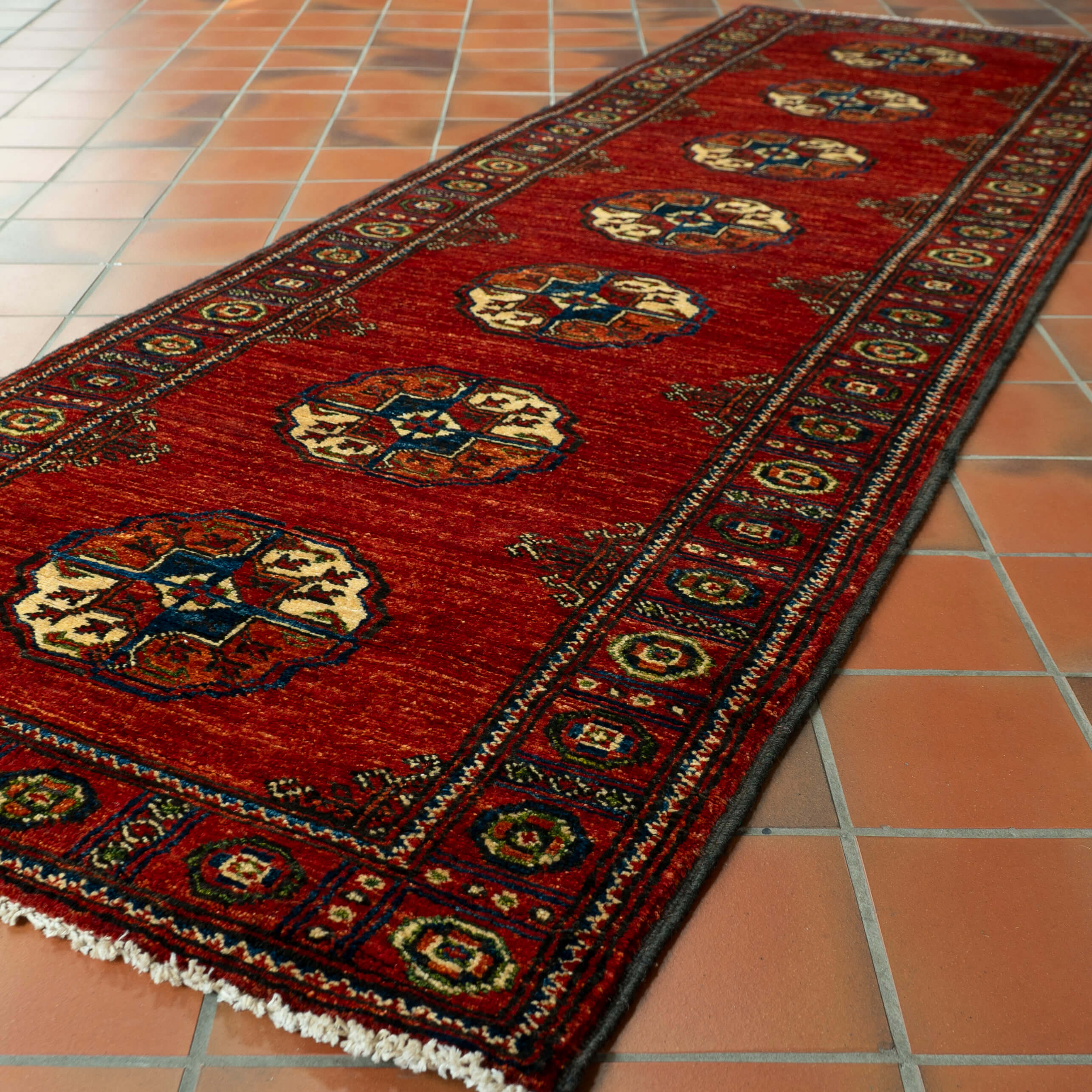 Ersari rugs are hand-knotted using methods passed down from the Turkmen people of Central Asia. The vibrant colours come from vegetable dyes, such as the rich reds produced from boiling the root of the madder plant. These rugs often feature traditional "Gul" (also known as elephant's-foot) designs.