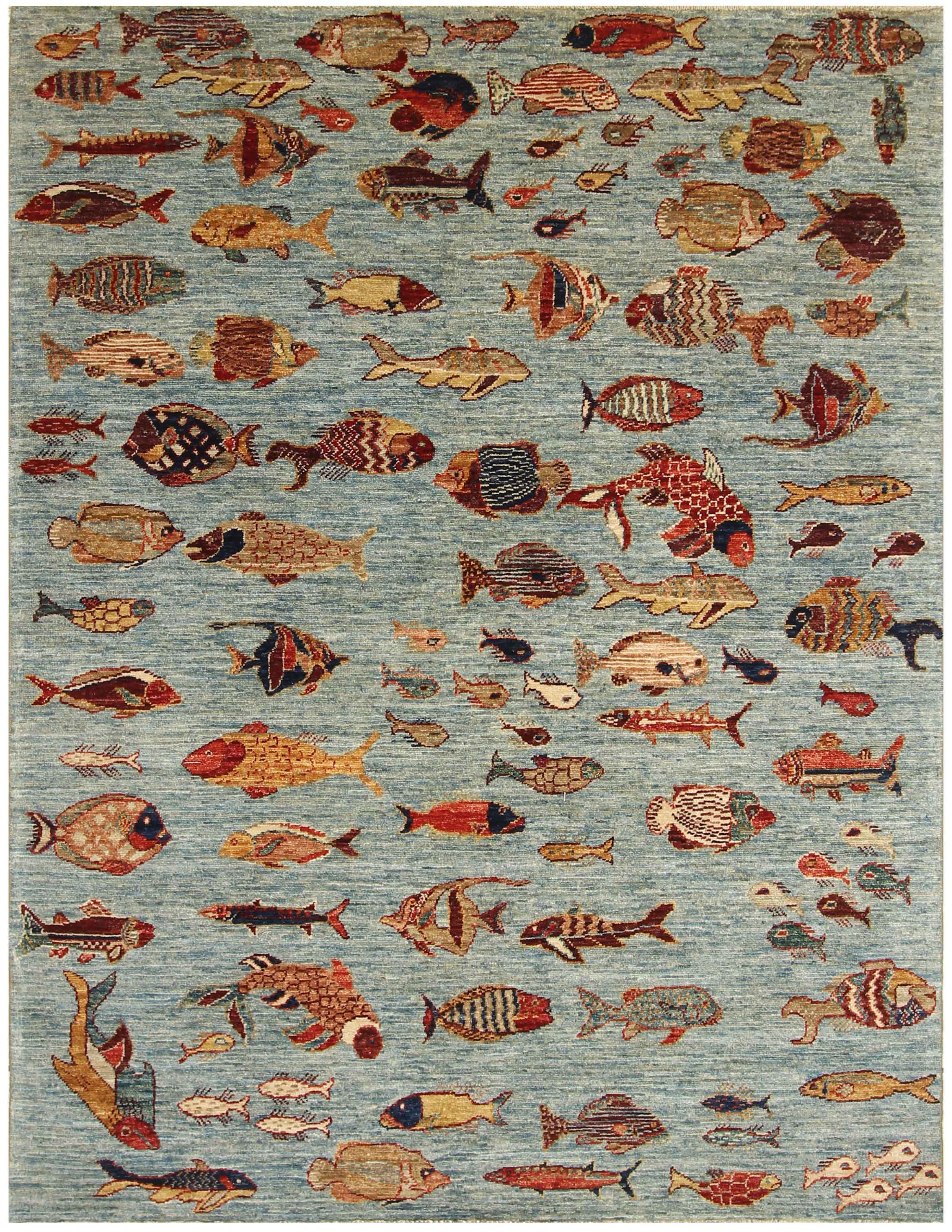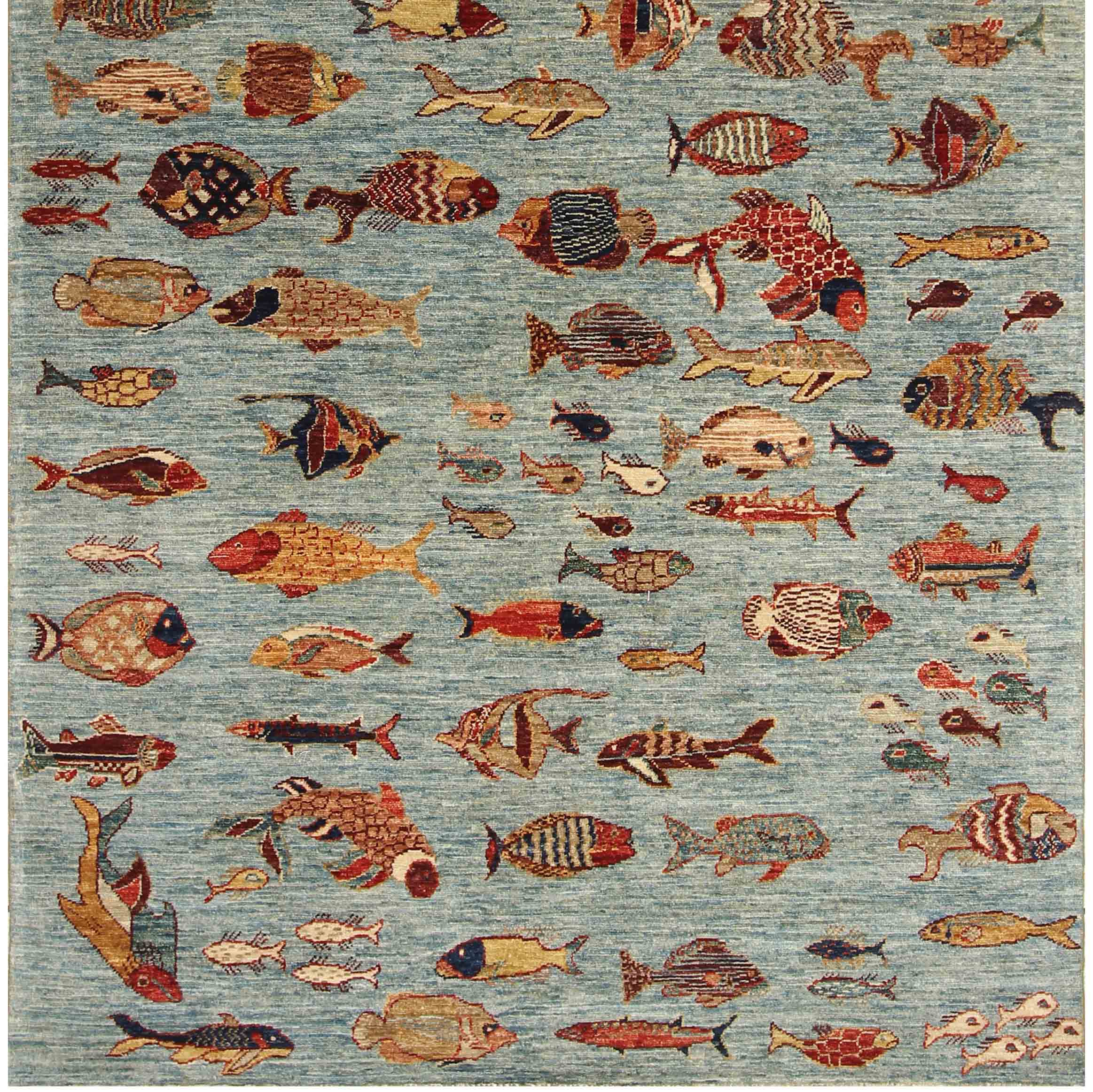 This unique and varied collection is produced in Afghanistan using the Ziegler weave. The traditional methods of shearing wool from the indigenous Karukal sheep, which is then hand-spun and coloured using natural vegetable and mineral dyes, apply. These pescatarian designs of carpets and rugs, which are hand-knotted, have the most exotic fish species, real or imagined; they are quite wonderful. They generally are more vibrant and less 'old' looking. With reduced washes, the exciting and uplifting colours remain almost Jewel-like. The final finishing processes are carried out in Pakistan, where some post-production occurs. This will mean alignment corrections, surface clipping and tumbling, and the washing mentioned earlier.