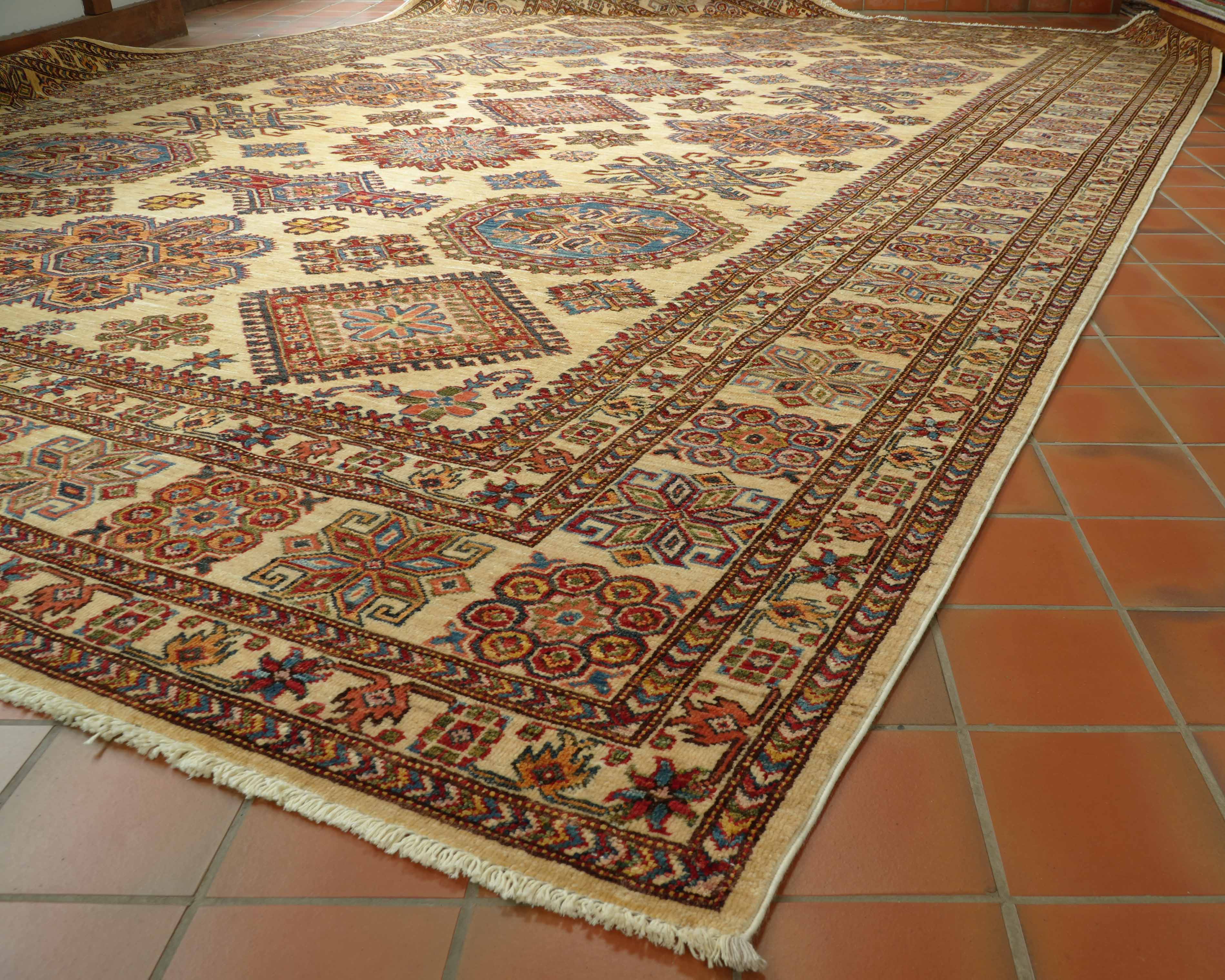 Although Kazaks are hand-knotted in Afghanistan, the design originates from the Caucasus. The short pile emphasises the pattern's sharpness. Each piece is made using excellent Afghan wool, usually spun in Ghazni. Afghan wool is generally slightly coarser and curlier than other wools, making it perfect for carpet weaving. Afghan Kazak carpets are traditionally made with bold geometric designs in intense, vibrant colours such as rich reds, warm terracottas, and shades of blues with soft golds and creams.