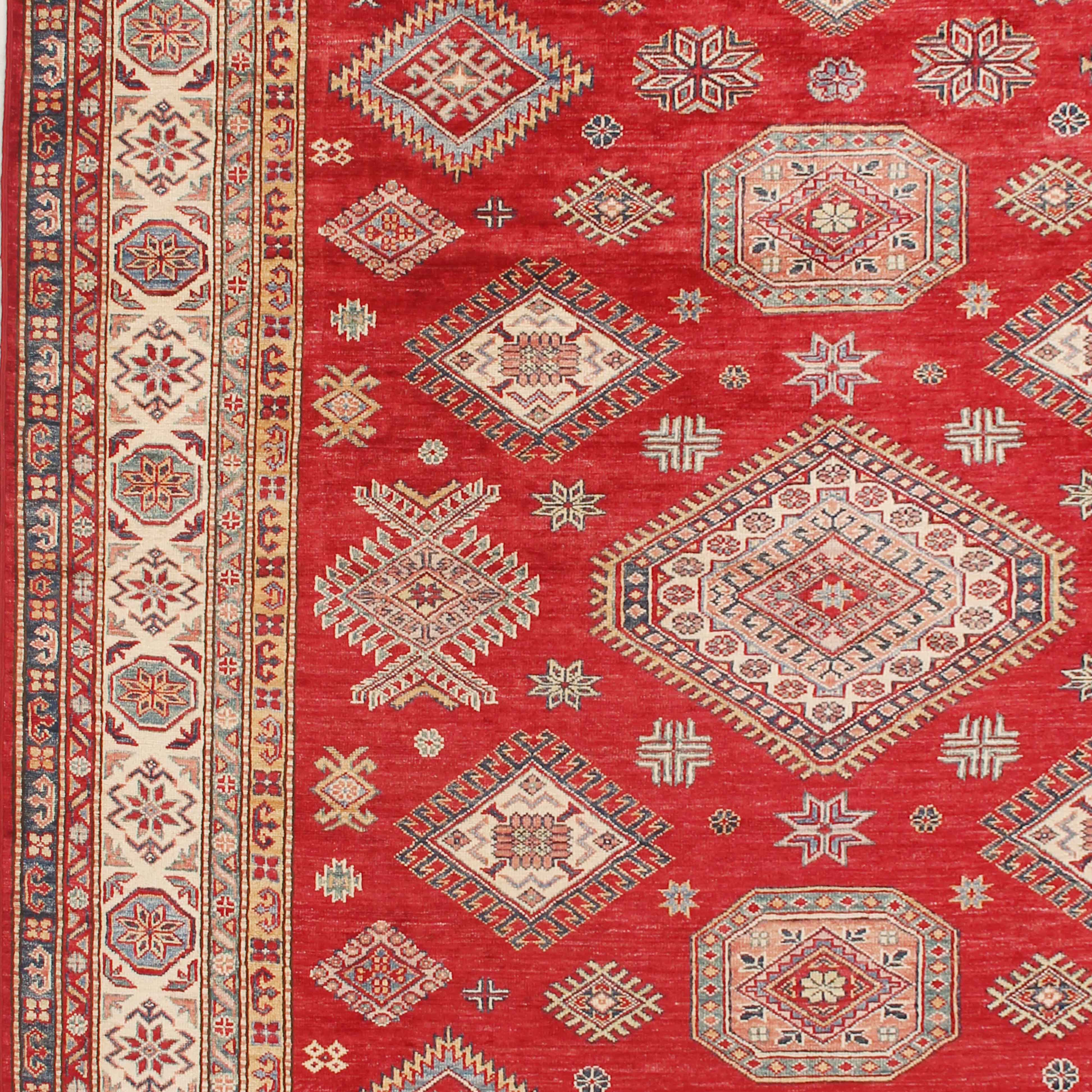 This beautiful handmade wool Afghan Kazak Rug features traditional medallions on a bright red ground and cream border. An intricate pattern adds intricate detailing to this stunning rug, making it the perfect statement piece for any room.
