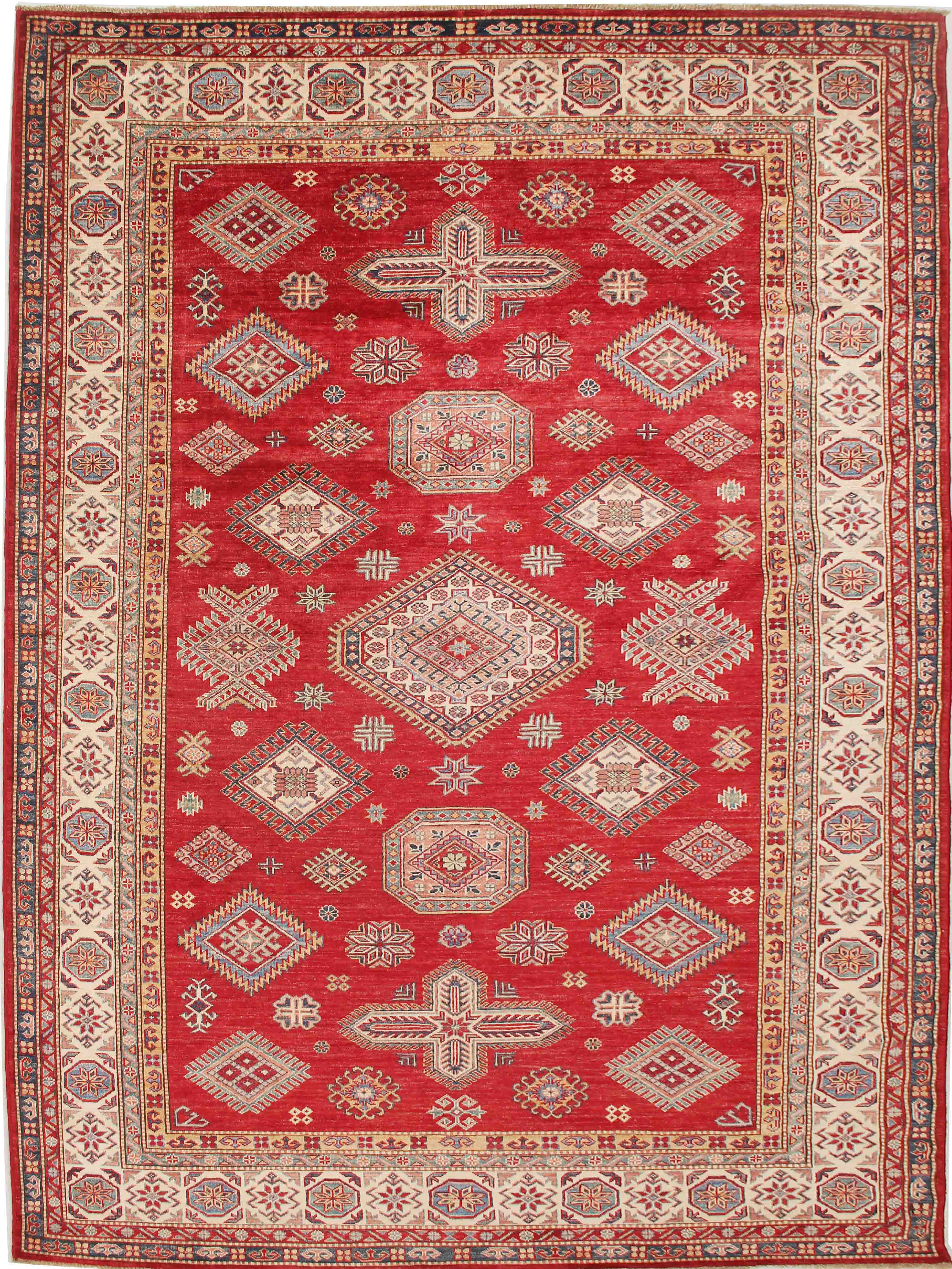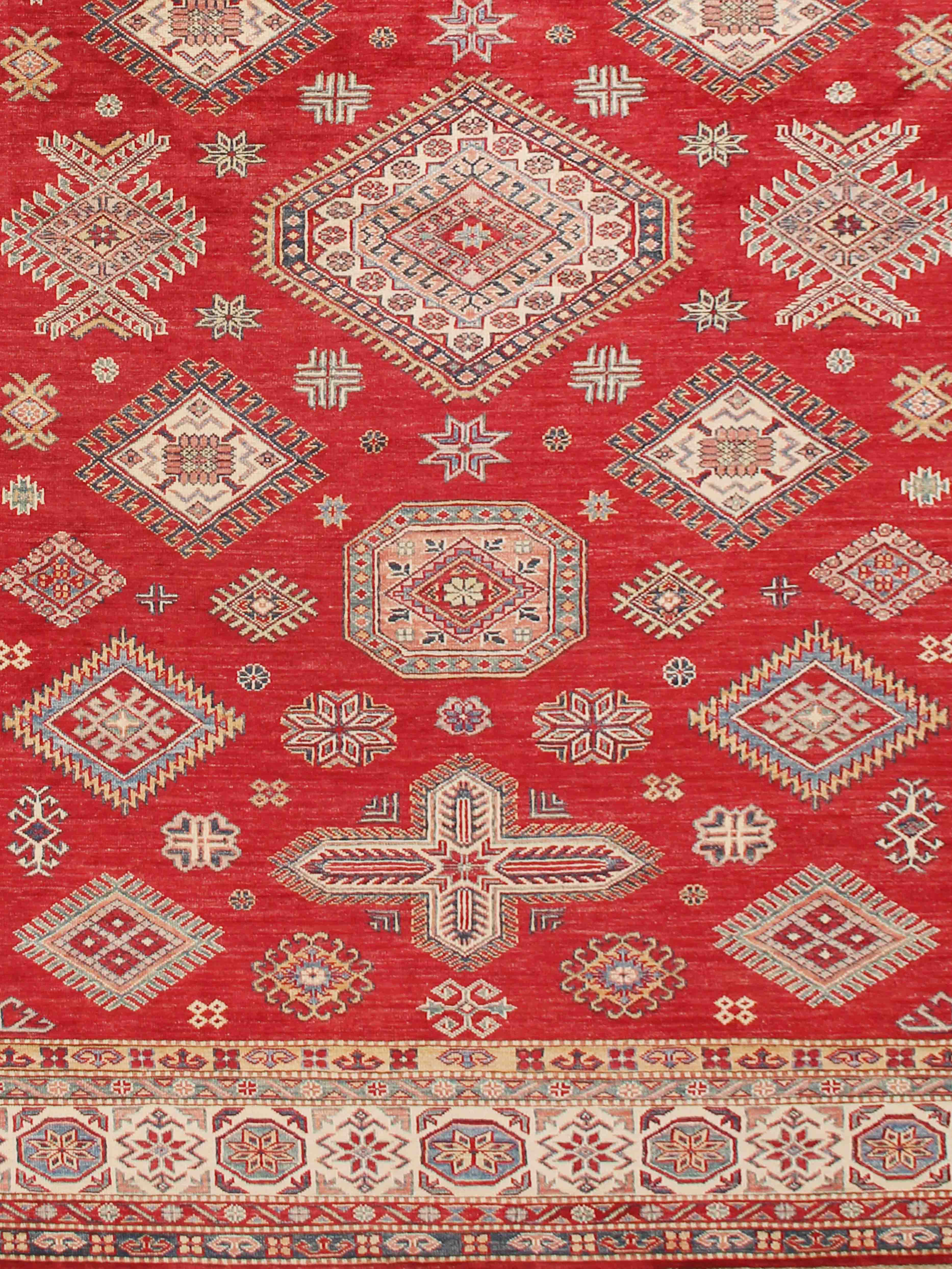 Although Kazaks are hand-knotted in Afghanistan, the design originates from the Caucasus. The short pile emphasises the sharpness of the pattern. Each piece is made using excellent Afghan wool, usually spun in Ghazni. The Afghan wool is generally slightly coarser and more curly than other wools and is perfect for carpet weaving. Afghan Kazak carpets are traditionally made with bold geometric designs in intense, vibrant colours such as rich reds, warm terracottas, and shades of blues with soft golds and creams.