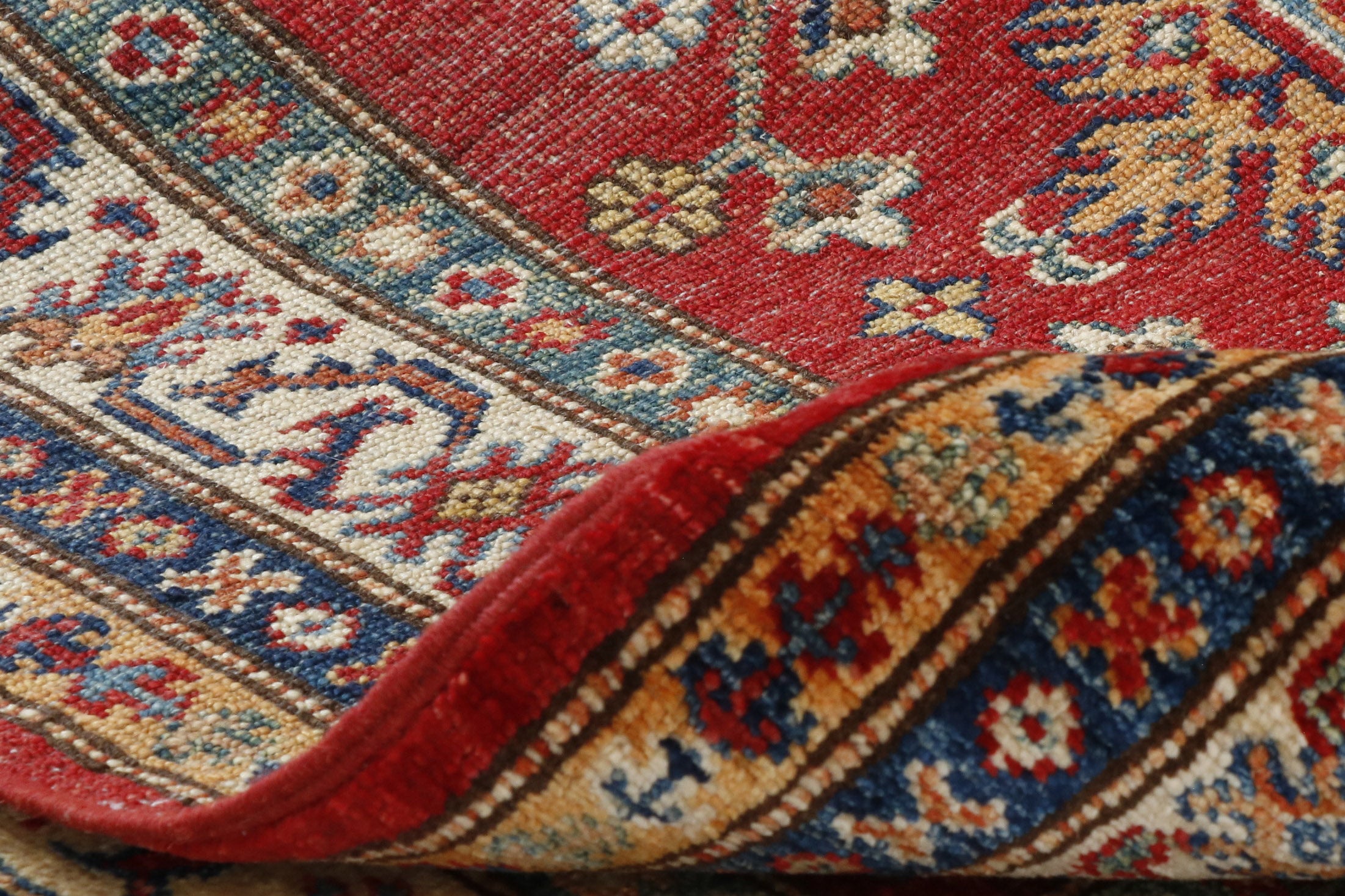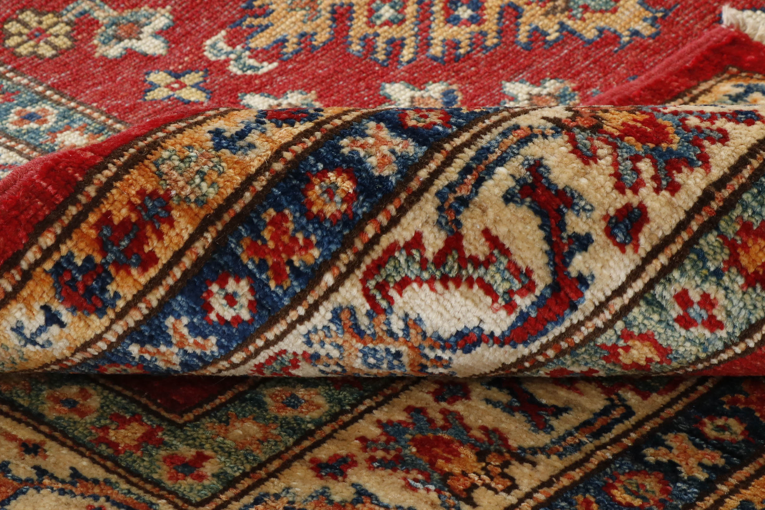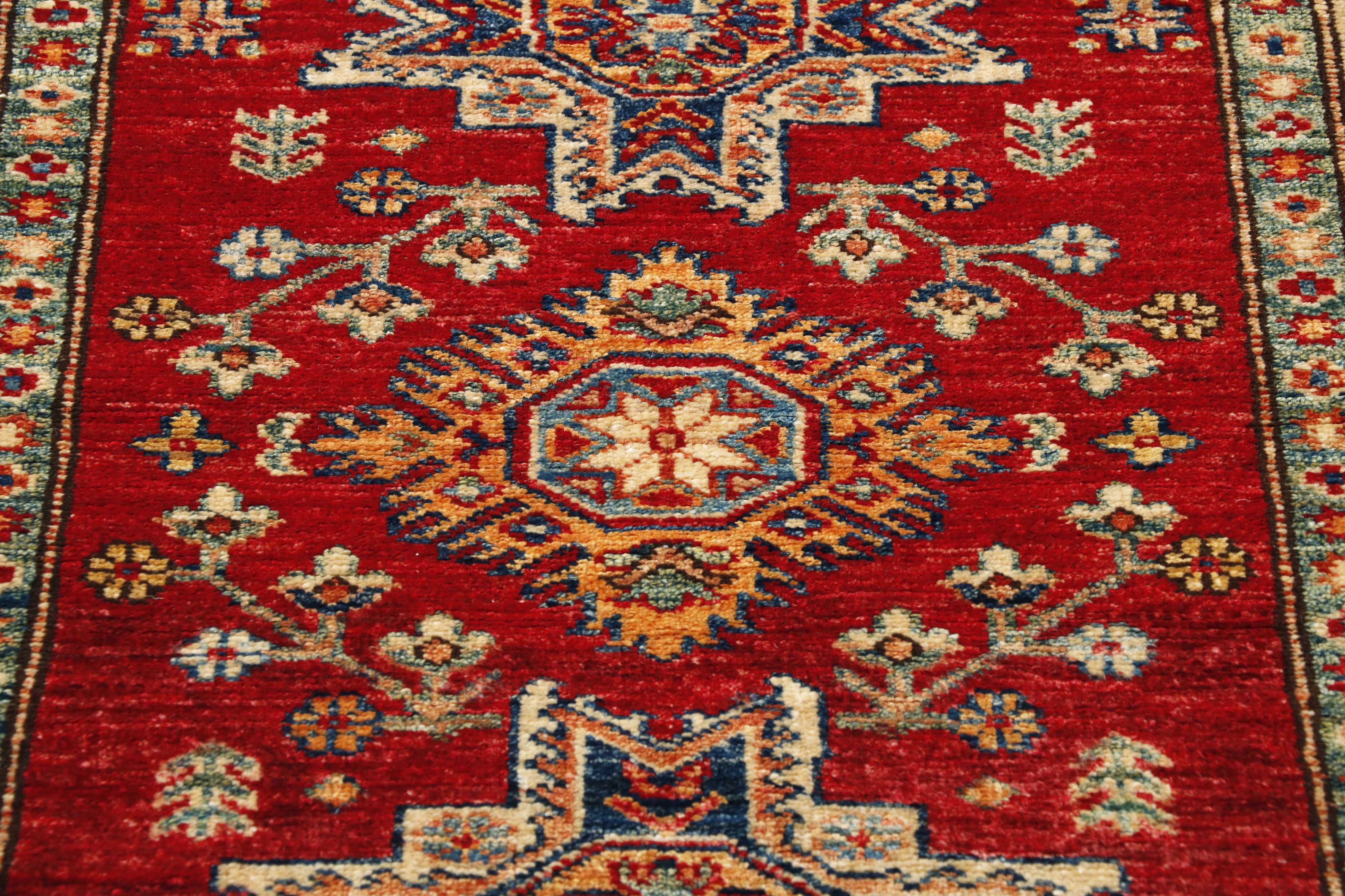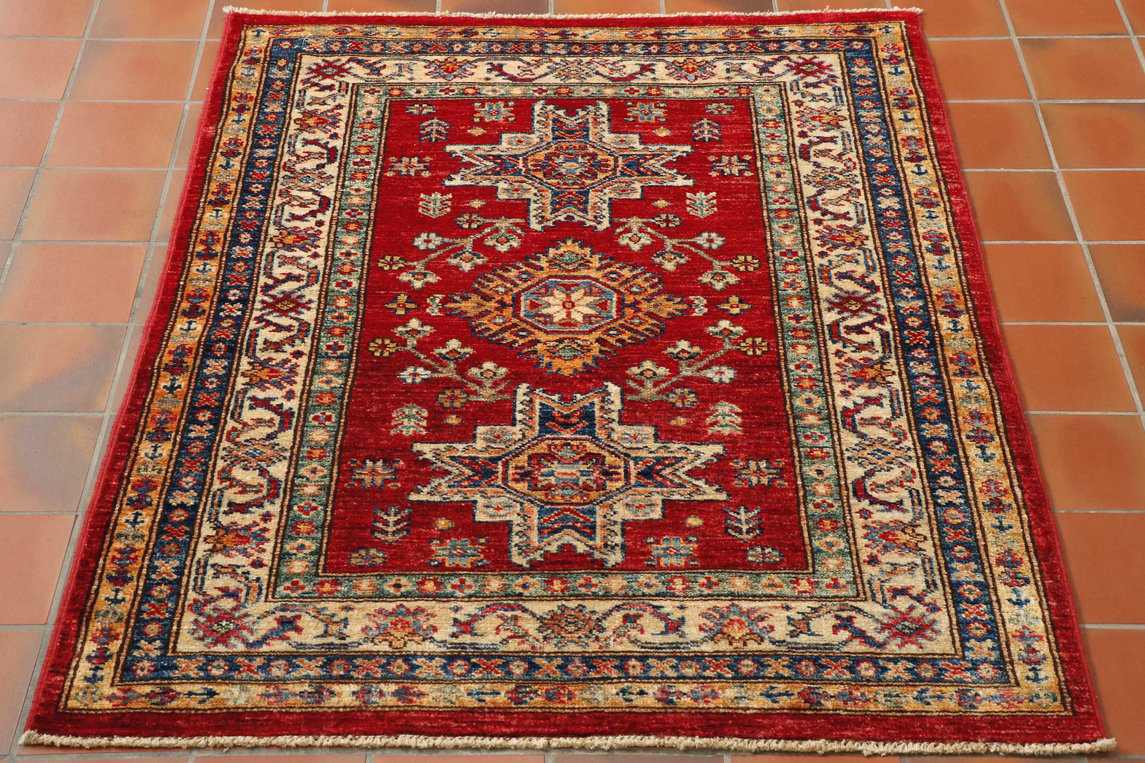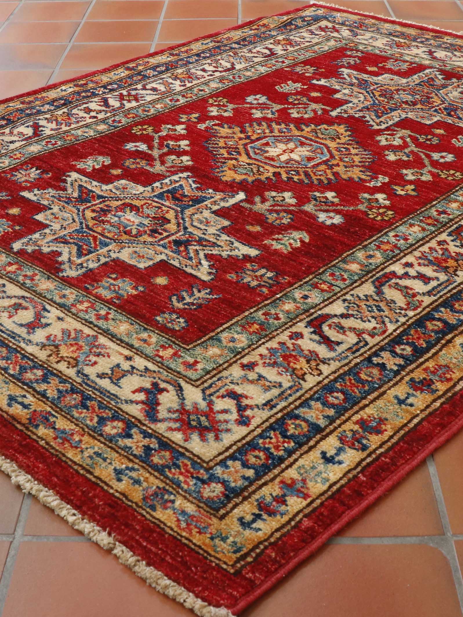 Although Kazaks are hand-knotted in Afghanistan, the design originates from the Caucasus. The short pile emphasises the sharpness of the pattern. Each piece is made using excellent Afghan wool, usually spun in Ghazni. Afghan wool is generally slightly coarser and curlier than other wools, making it ideal for carpet weaving. Afghan Kazak carpets are traditionally made with bold geometric designs in intense, vibrant colours such as rich reds, warm terracottas, and shades of blues with soft golds and creams.