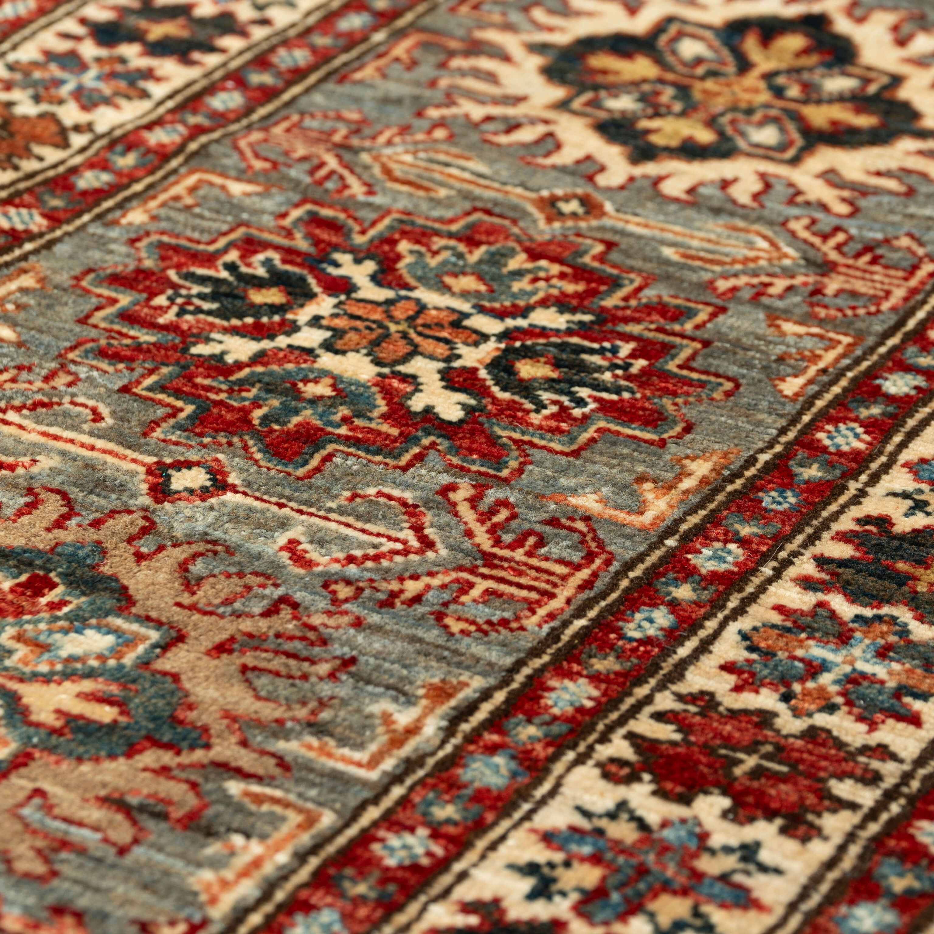 Although Kazaks are hand-knotted in Afghanistan, the design originates from the Caucasus. The short pile emphasises the sharpness of the pattern. Each piece is made using excellent Afghan wool, usually spun in Ghazni. Afghan wool is generally slightly coarser and curlier than other types of wool and is perfect for carpet weaving. Afghan Kazak carpets are traditionally made with bold geometric designs in intense, vibrant colours such as rich reds, warm terracottas, and shades of blues with soft golds and creams.
