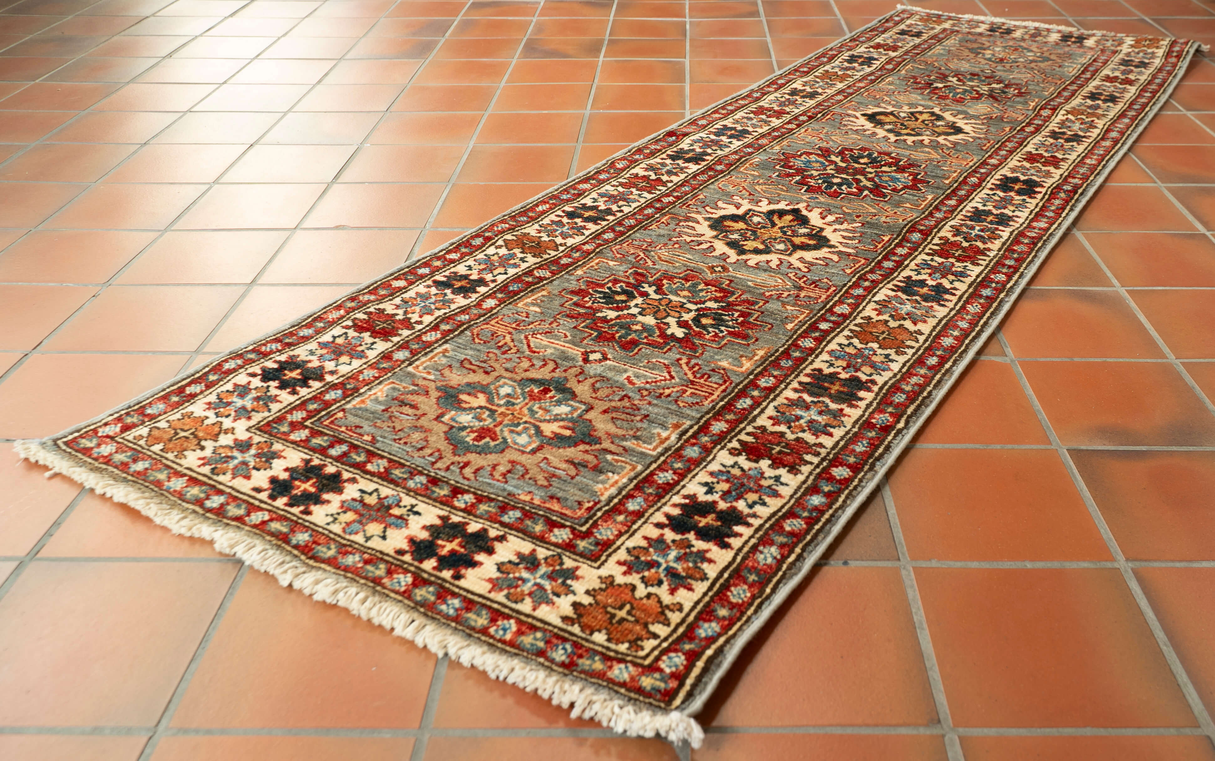 Indulge in the traditional design of this handmade Afghan Kazak runner, skillfully handknotted by artisans in north west Afghanistan. Made with handspun vegetable-dyed wool, this runner is not only practical and hardwearing, but also adds a touch of cultural elegance to any hallway, corridor, or landing.