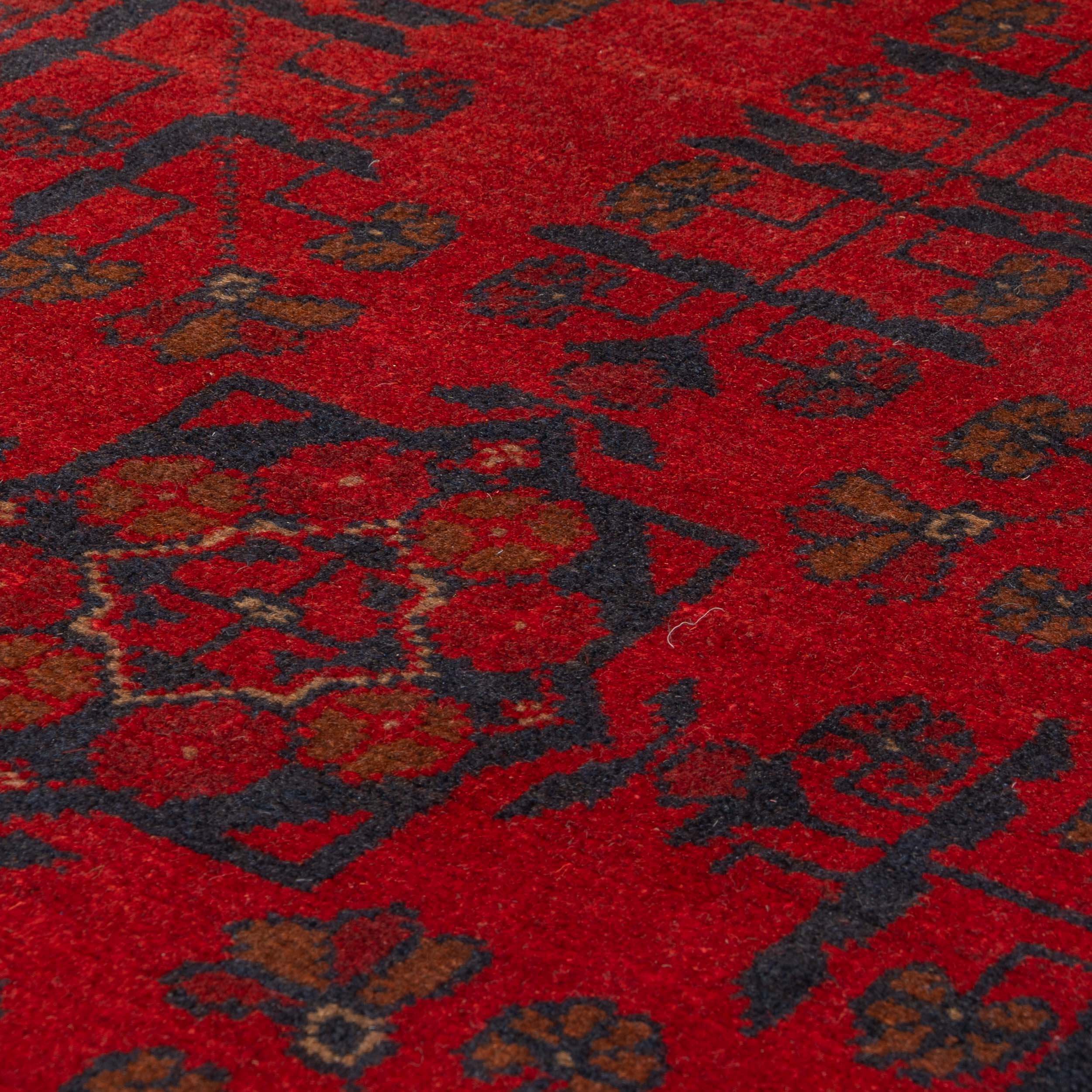 Discover the magic of authentic craftsmanship with this stunning handmade Afghan Khal Mohammadi rug. Woven from pure wool on a sturdy cotton base, it showcases a vibrant red canvas adorned with intricate dark blue patterns. Every thread tells a story, coloured using time-honoured natural vegetable dyes that bring warmth and character to any room. This isn't just a rug—it's a conversation starter that brings genuine artistry and cultural heritage straight into your home.