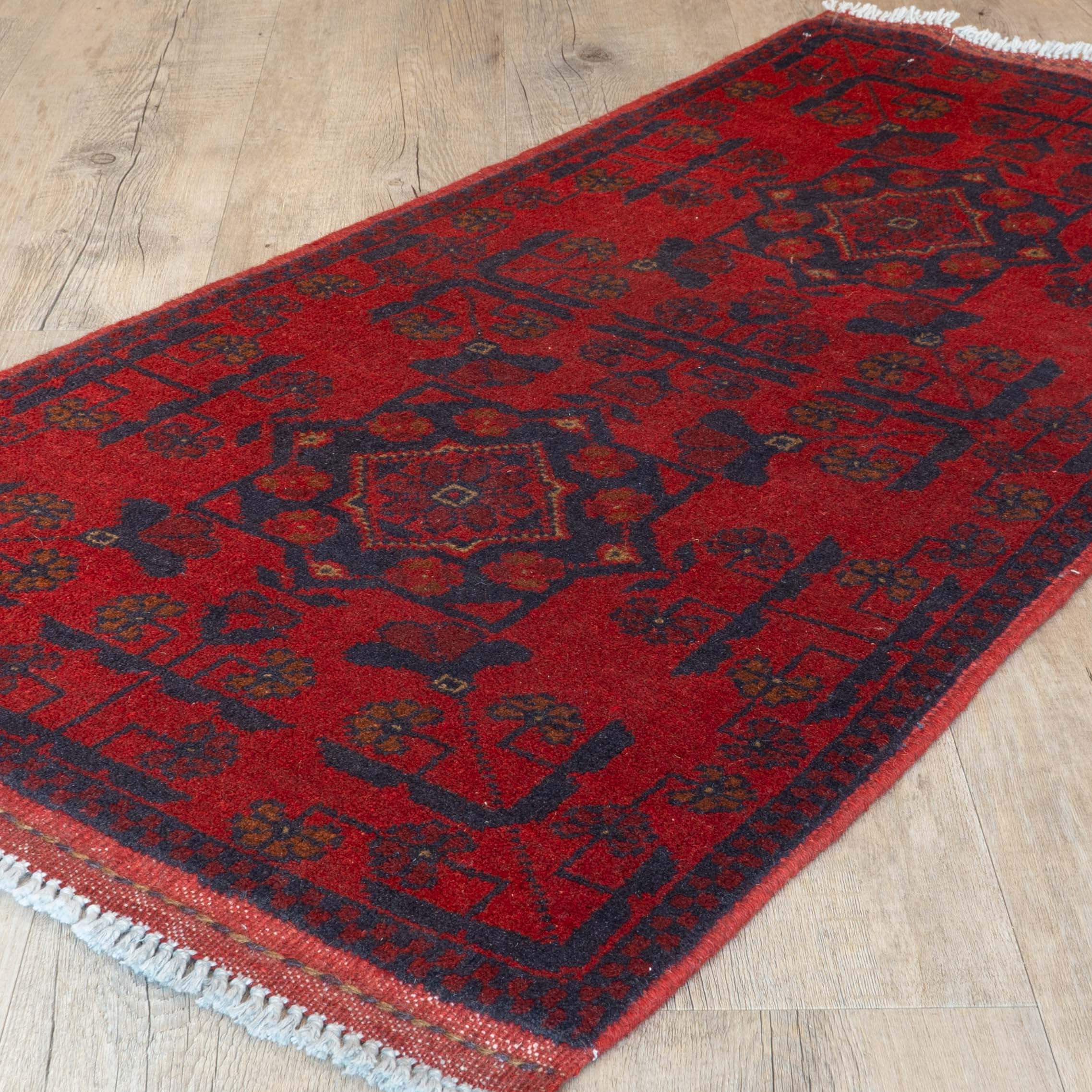 The rich red of these rugs is created from boiling the madder plant's root, which grows wild in that part of the world. They are finely knotted from wool of the Karakul sheep, which graze the mountainous terrain. The colour and design make them very practical. Some recurring motifs are guls (elephant-foot patterns and octagonal, often curvilinear flowers in dark blue, ochre, and beige. We have an extensive collection of handmade Afghan Khal Mohammadi rugs and carpets in various sizes, available online and in-store. Why not come to Tewkesbury and find a beautiful carpet that suits your needs?