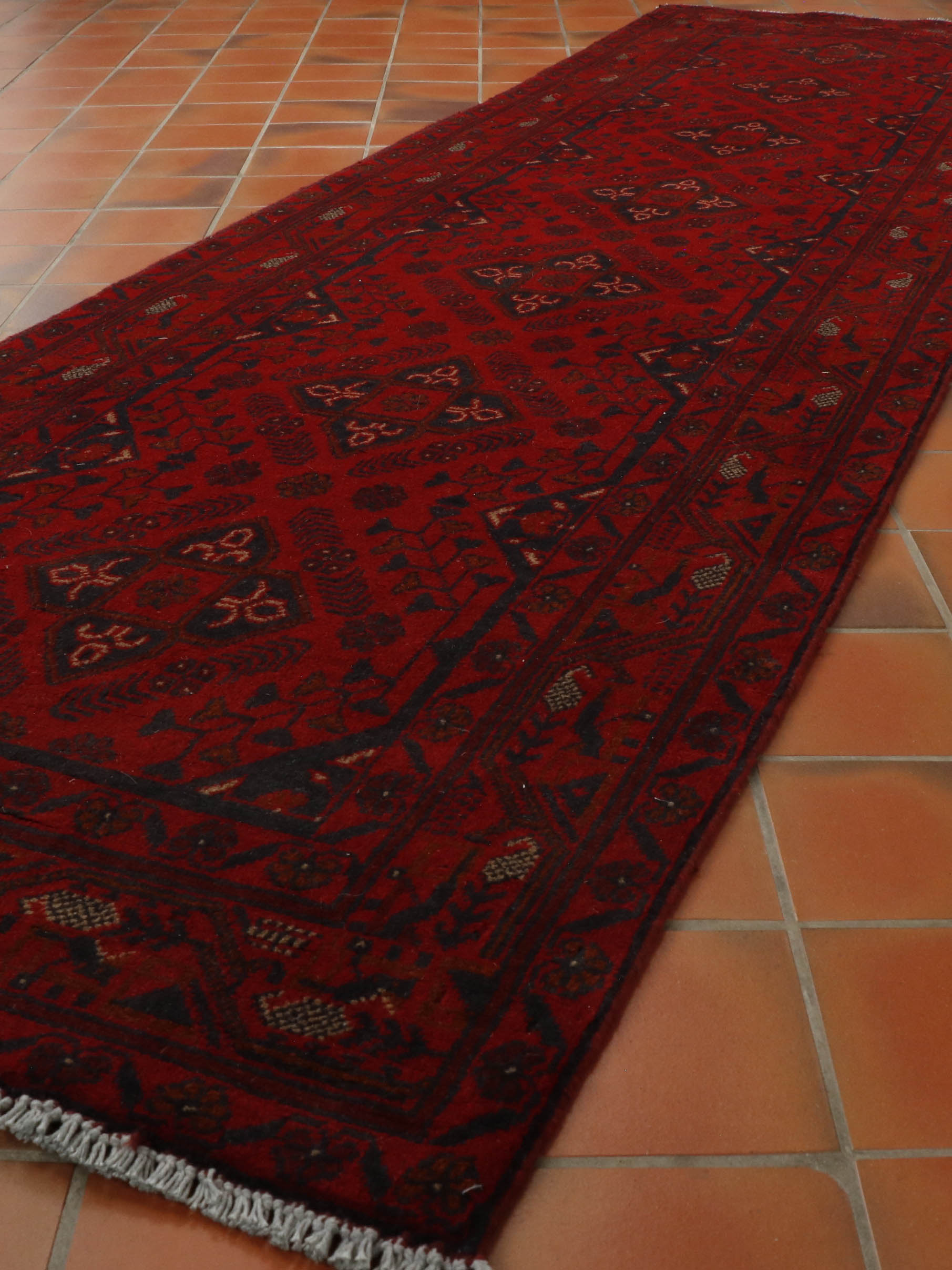 The rich red of these rugs is created from boiling the madder plant's root, which grows wild in that part of the world. They are finely knotted from wool of the Karakul sheep that graze the mountainous terrain. The colour and design make them very practical. Some recurring motifs include guls (elephant-like patterns) and octagonal, often curvilinear, flowers in dark blue, ochre, and beige. We have an extensive collection of handmade Afghan Khal Mohammadi rugs and carpets for sale in a wide range of sizes, available online and in-store. Why not visit Tewkesbury to find a beautiful rug that suits your needs?