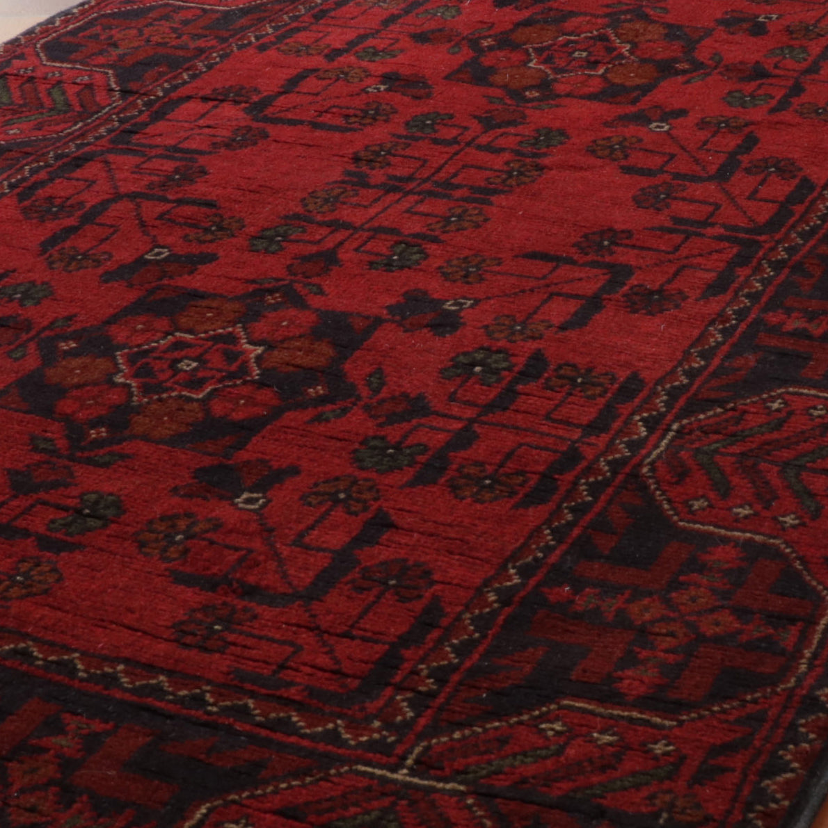 The rich red of these rugs is created from boiling the madder plant's root, which grows wild in that part of the world. They are finely knotted using wool from the Karakul sheep who graze the mountainous terrain. The colour and design make them very practical. Some occurring motifs are guls (elephant's foot pattern) and octagonal, often curvilinear flowers in dark blue, ochre and beiges. We have an extensive collection of handmade Afghan Khal Mohammadi rugs and carpets for sale in various sizes, available in our shop online and in-store. So why not come to Tewkesbury and find a beautiful carpet that suits your needs?