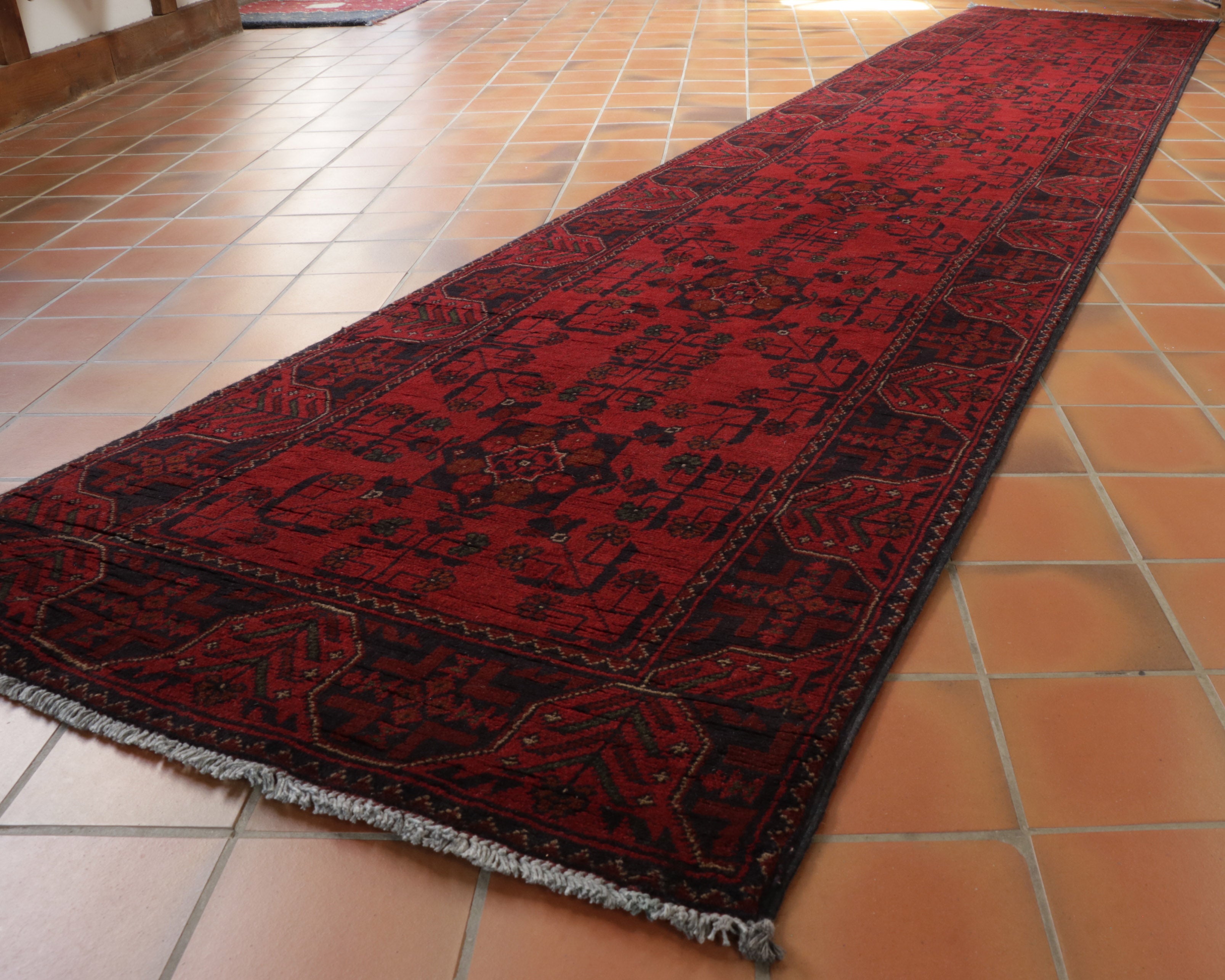 This beautiful handmade Afghan Khan Mohammadi long runner is classic craftsmanship and artistry. Handwoven with vegetable-dyed hand-spun wool by skilled artisans from northwest Afghanistan in an elegant traditional design, it's a great statement piece for residential and commercial environments. Practical and hardwearing, it's the perfect addition to adding a traditional touch to any hallway or corridor.