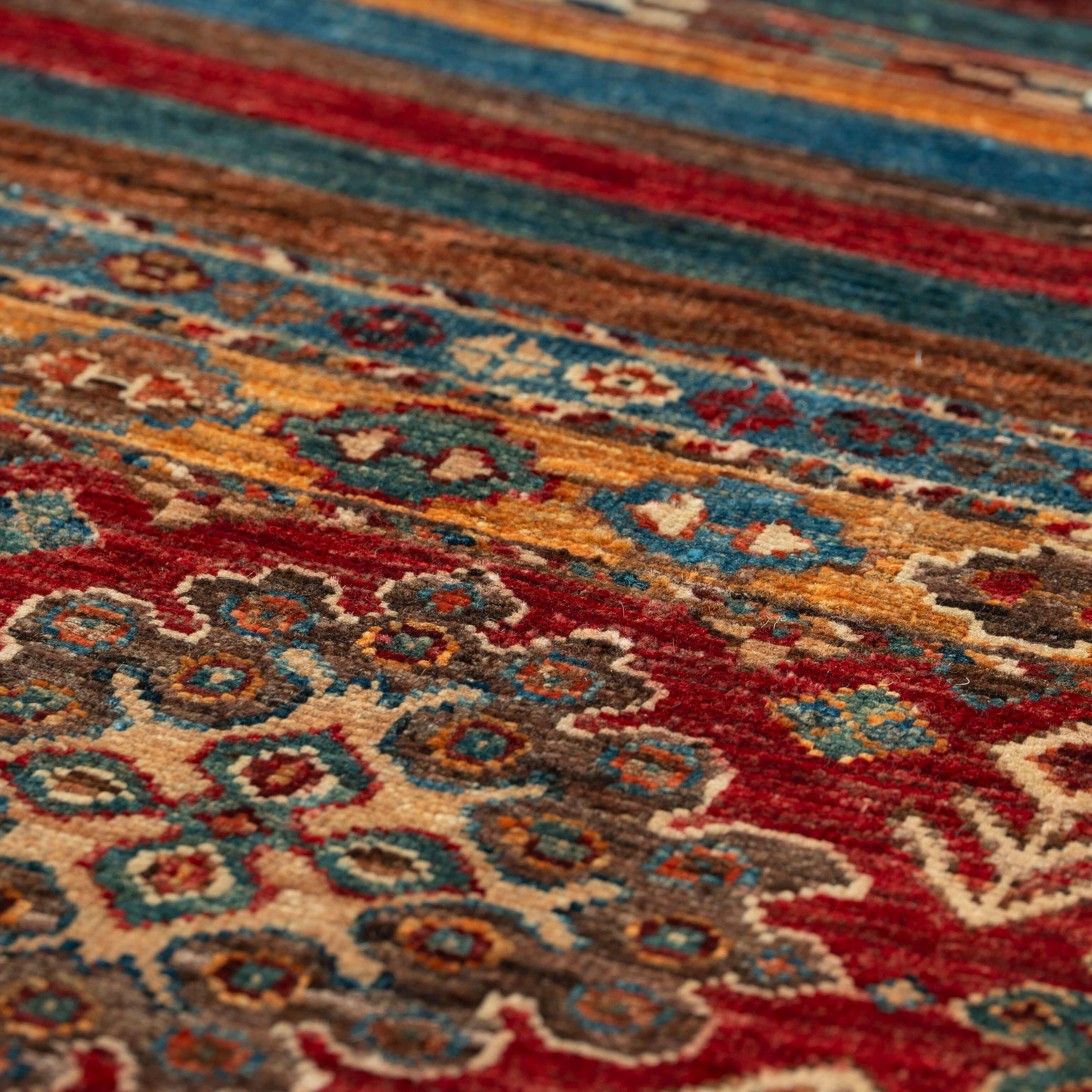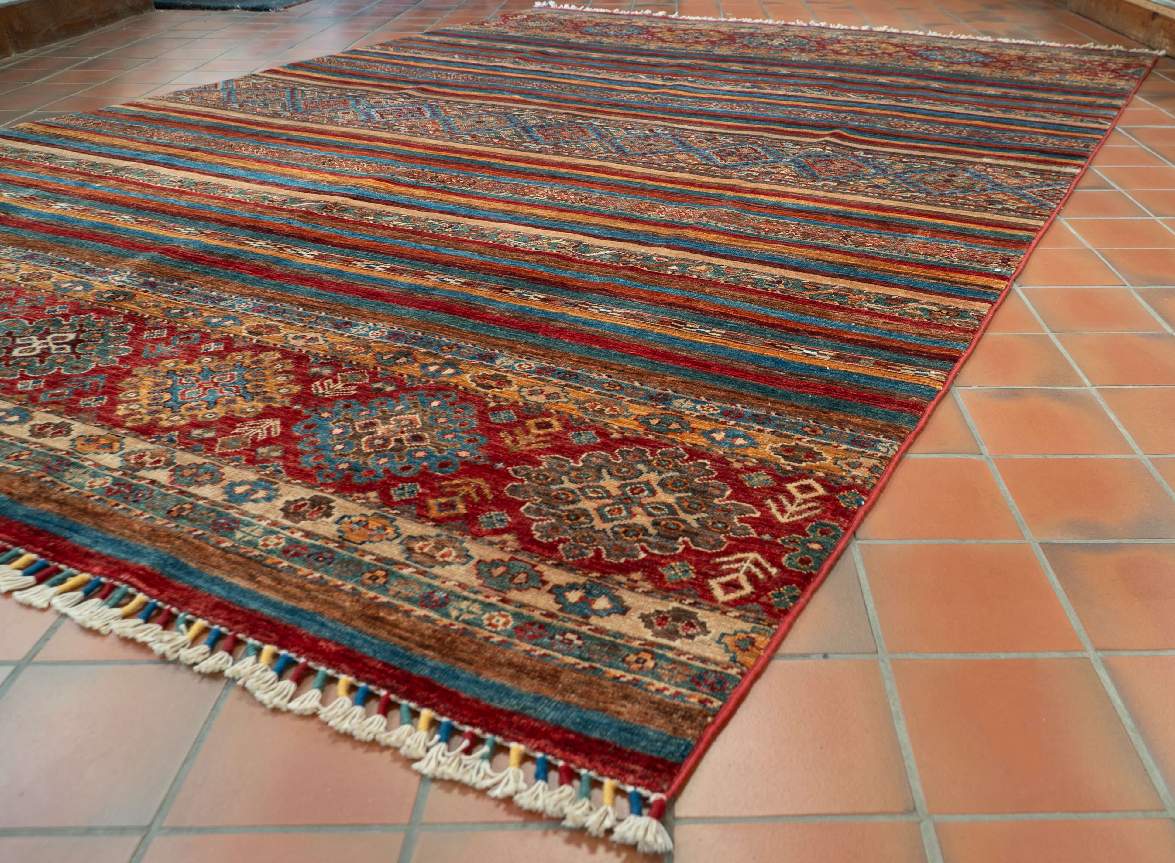 This stunning handmade Afghan Kharjeen carpet, with its vibrant colours and striking design, is a true testament to the skilled craftsmanship of northwest Afghanistan. Made from high-quality, vegetable-dyed handspun wool, it not only adds a touch of beauty to any room but is also a practical and hardwearing piece. Its traditional motifs and contemporary stripes make for a unique and timeless addition to any home.
