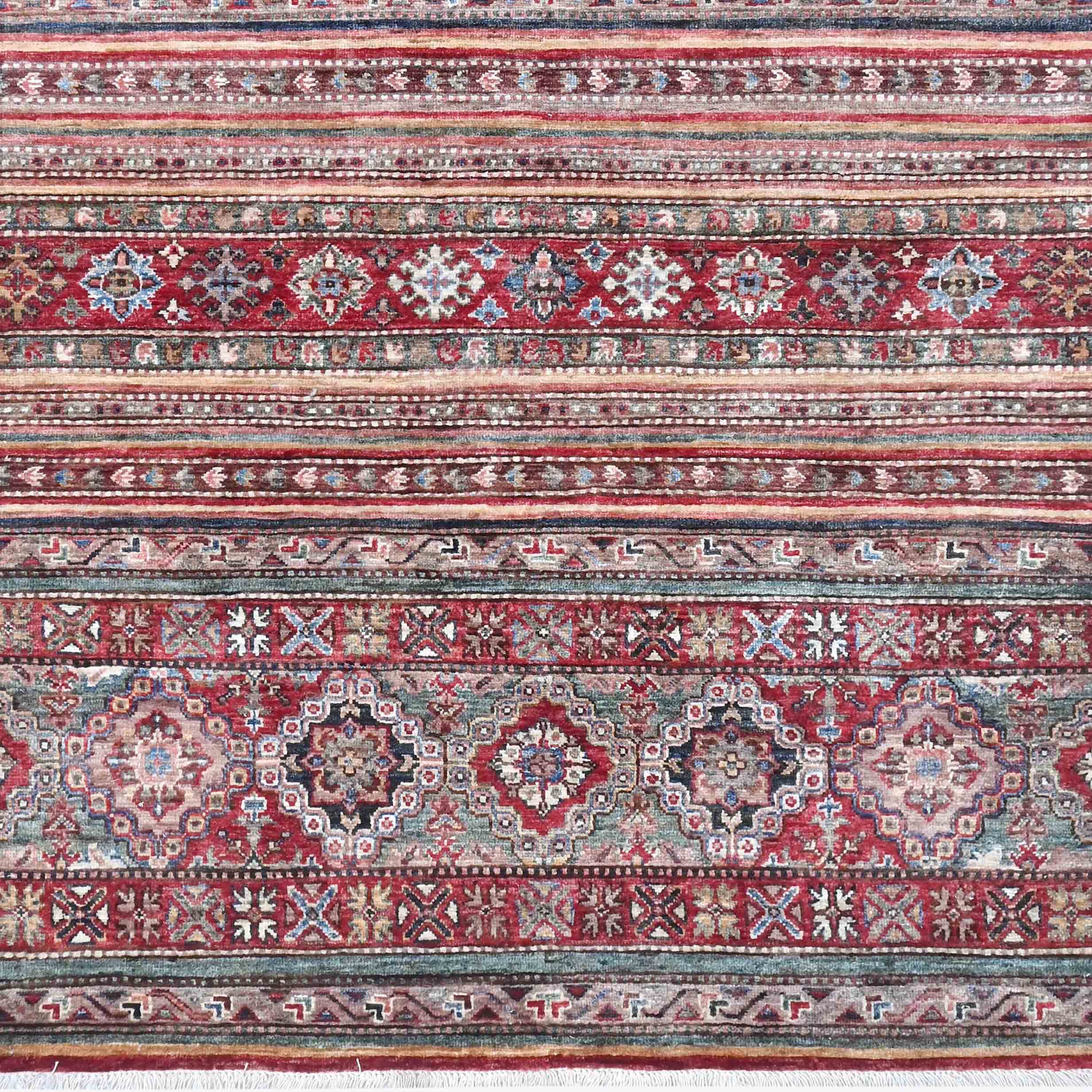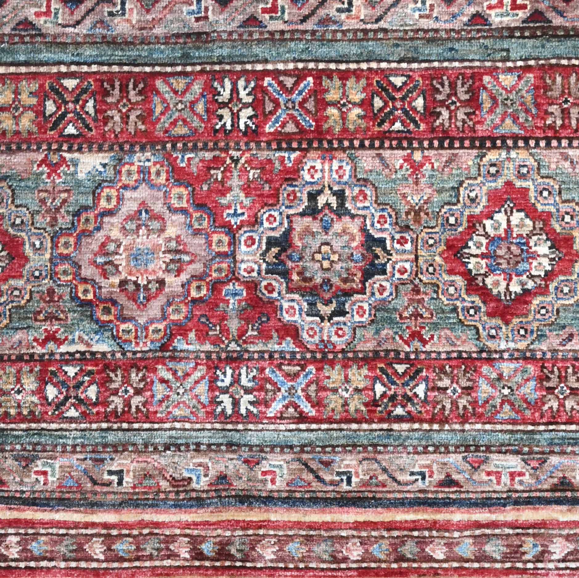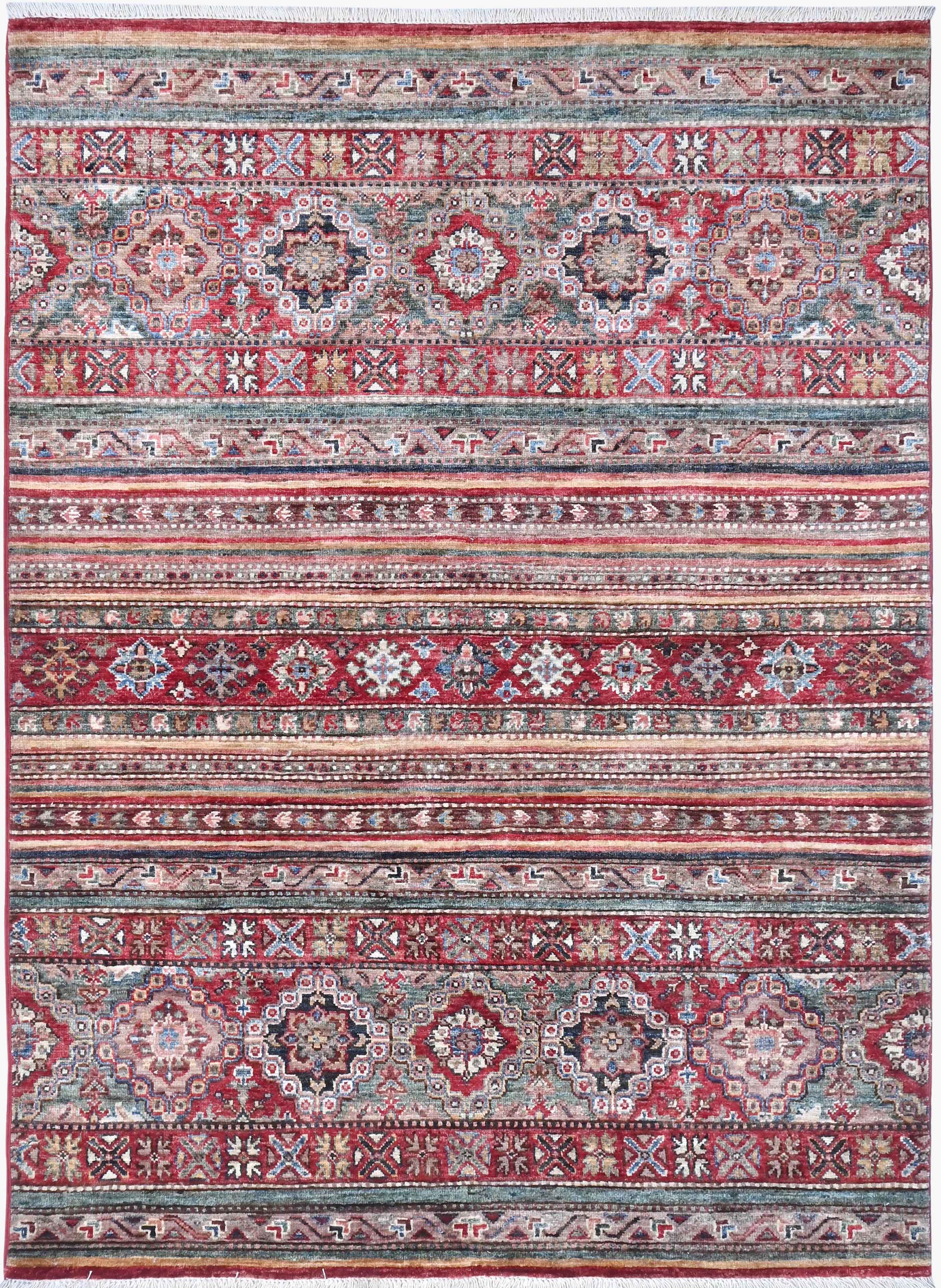 This stunning handmade Afghan Kharjeen carpet, with its vibrant colours and striking design, is a true testament to the skilled craftsmanship of northwest Afghanistan. Made from high-quality, vegetable-dyed handspun wool, it not only adds a touch of beauty to any room but is also a practical and hardwearing piece. Its traditional motifs and contemporary stripes make for a unique and timeless addition to any home.