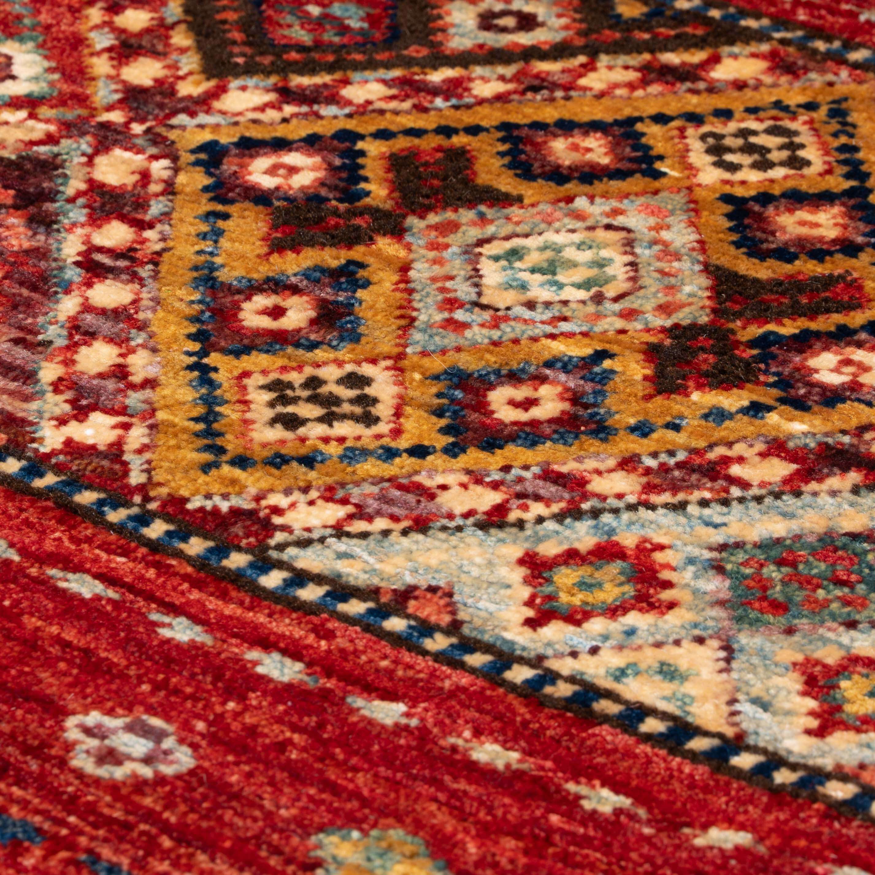 Kharjeen (Khorjin) rugs, runners, and carpets are still hand-knotted, and the wool is dyed with vegetable dyes. The Kharjeen (also known as Khurjeen) rug designs can be reminiscent of Gabbeh designs. The colours of the Kharjeen rugs and carpets are similar in many ways to those used in our Samarkand and Loribaft collections. Some Kharjeen pieces do not have fringes and are finished with a plain kilim end or binding secured to prevent fraying. The other rugs are generally produced like the Samarkand carpets with an unusual bobbin wind on the warps.