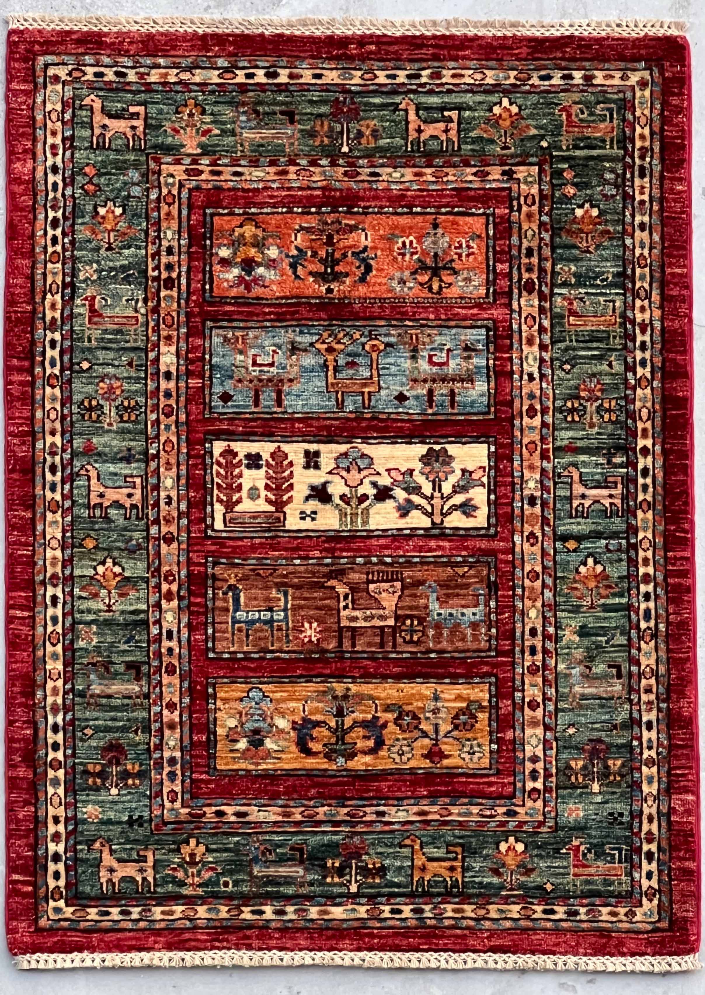 Kharjeen (Khorjin) rugs, runners and carpets are still hand-knotted, and the wool is coloured with vegetable dye. The Kharjeen (also known as Khurjeen) rug designs can be reminiscent of Gabbeh designs. The colours of the Kharjeen rugs and carpets are similar to those used in our Samarkand and Loribaft collections—the other rugs, like the Samarkand carpets with an unusual bobbin wind on the warps.