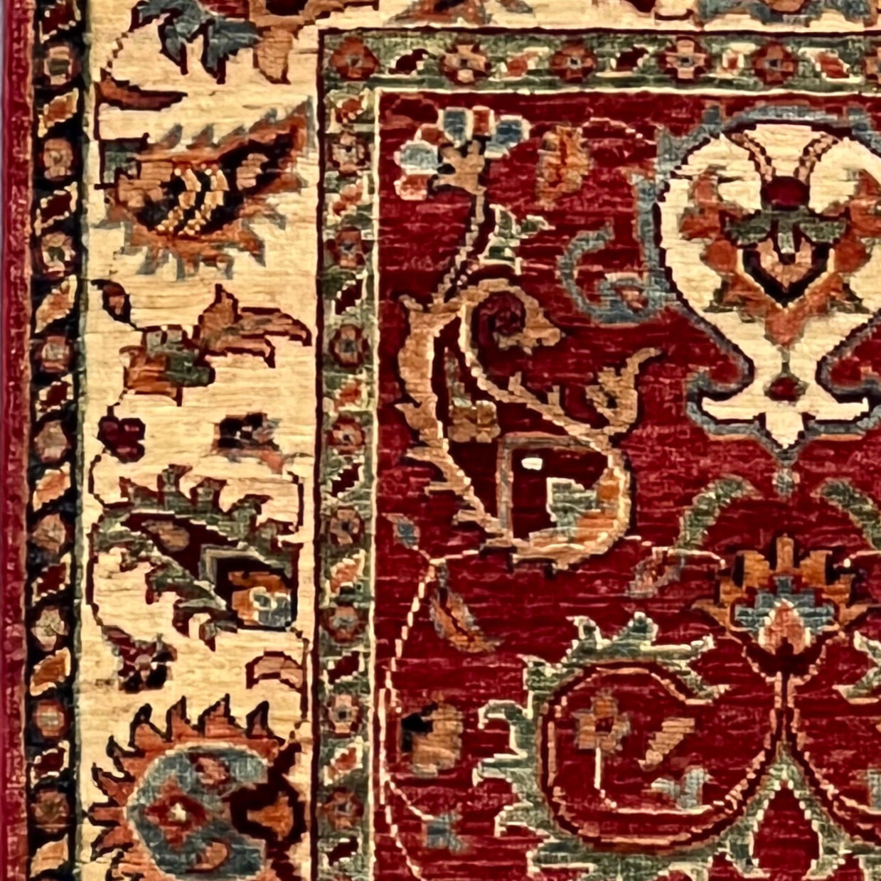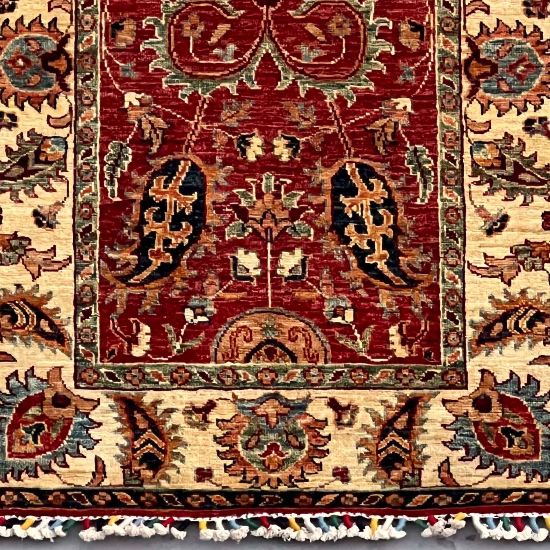 You can buy this handmade carpet before it arrives in our Tewkesbury showroom. As the rug has not yet been received into our stock at Tewkesbury, it has yet to be properly photographed; the images are not as good as our normal images. However, they are actual photographs of the finished rug. Once the rug has been transferred from our warehouse, we will rephotograph it.  This Afghan Kharjeen is a classic design in traditional colours but with a modern way of finishing the fringes. The vegetable-dyed Afghan wool is tough, as the Karakul sheep have to rough it in the mountainous terrain,...