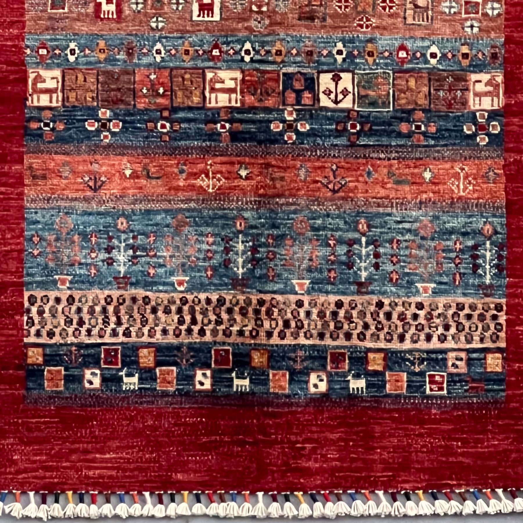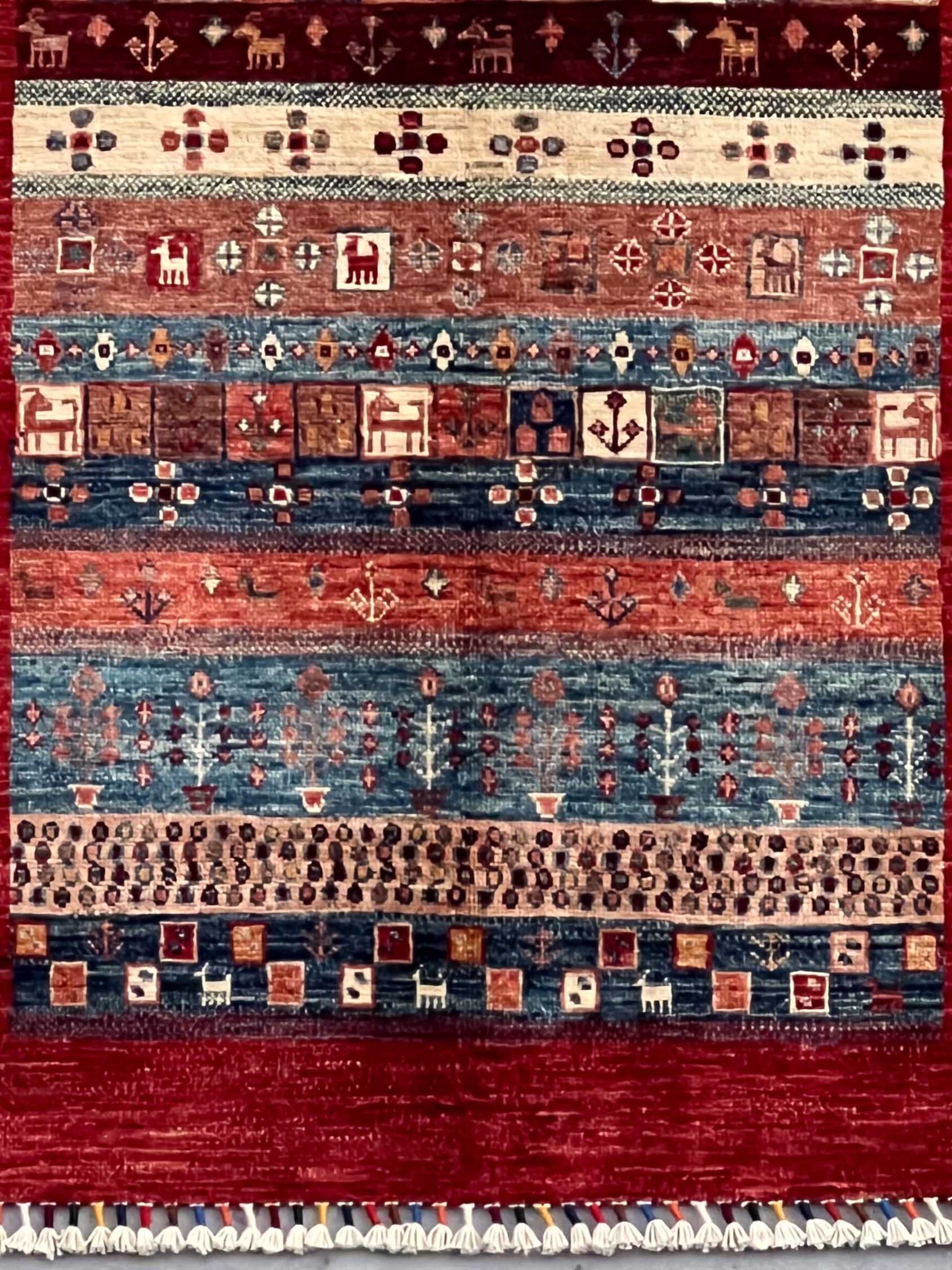 This multi-co-multicoloured Kharjeen rug is ideal for the contemporary lifestyle. The plain red border frames the stripe design, scattered with random stylised goats. This rug is fun, colourful, interesting, practical, and hard-wearing.