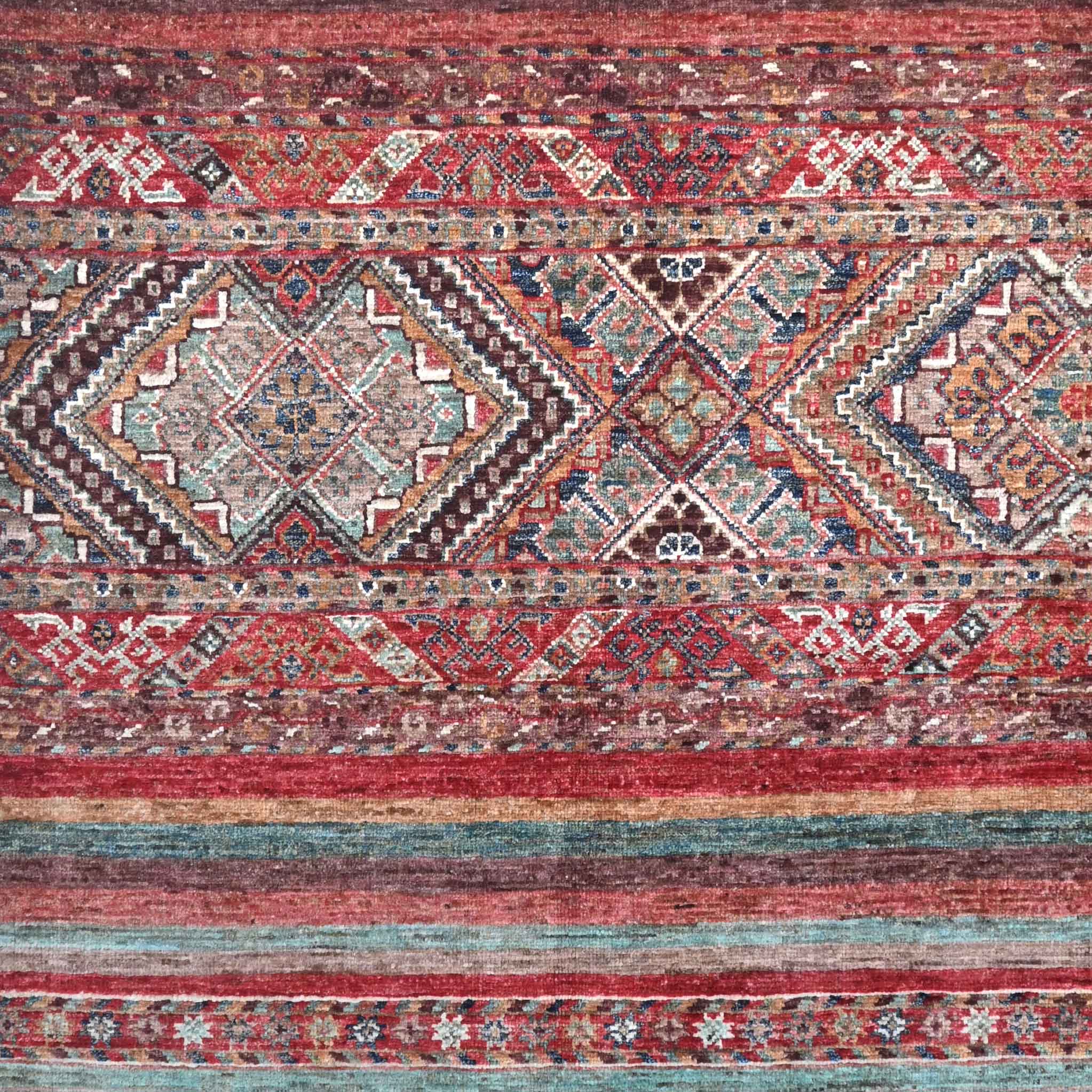Kharjeen (Khorjin) rugs, runners and carpets are still hand-knotted, and the wool is coloured with vegetable dye. The Kharjeen (also known as Khurjeen) rug designs can be reminiscent of Gabbeh designs. The colours of the Kharjeen rugs and carpets are similar in many ways to those used in our Samarkand and Loribaft collections. Some Kharjeen pieces do not have fringes and are finished with a plain kilim end or binding secured to prevent fraying. The other rugs are generally produced like the Samarkand carpets with an unusual bobbin wind on the warps.