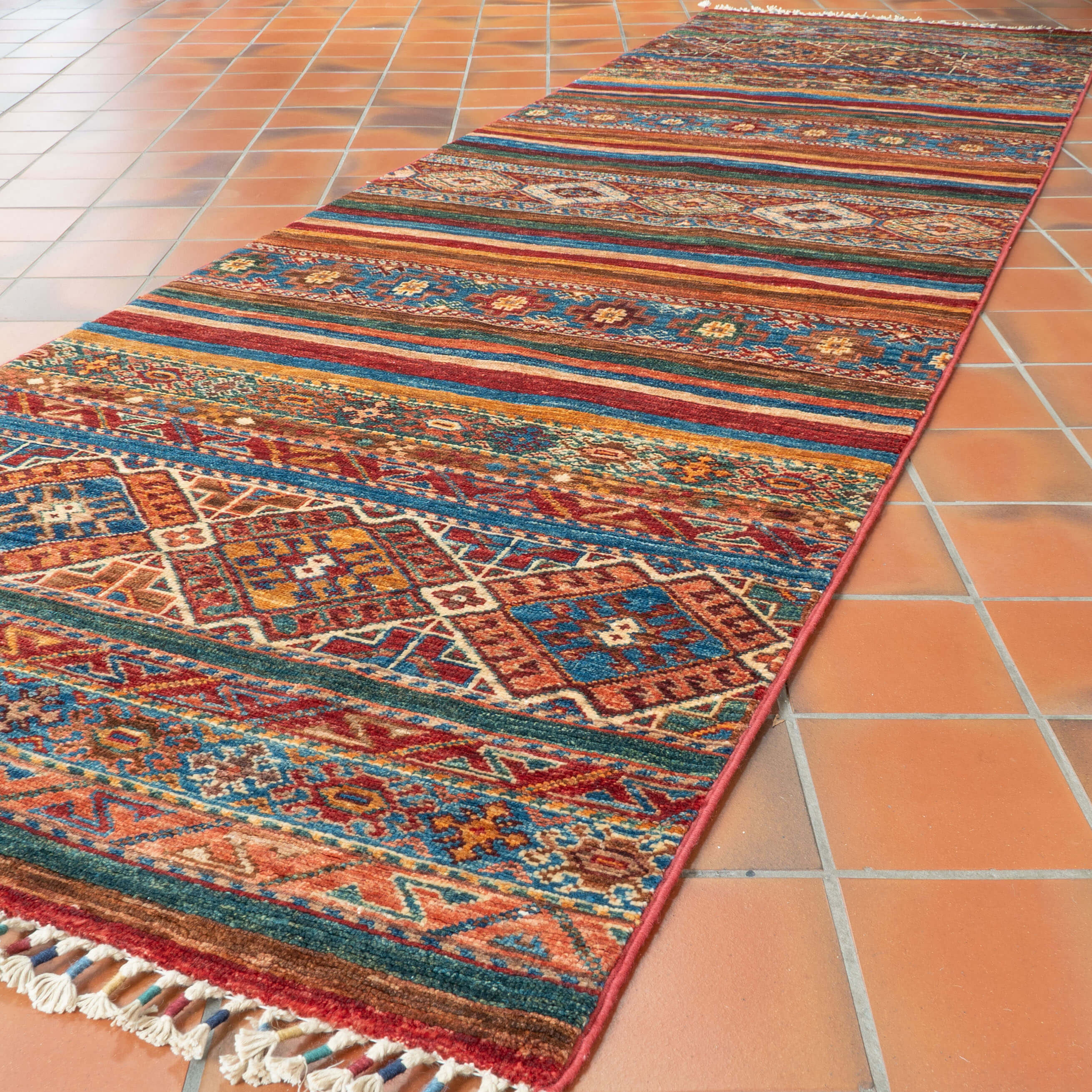 Say hello to instant happiness with this delightful handmade Afghan Kharjeen runner! Packed with eye-catching multicoloured stripes that practically sing with joy, it's a masterpiece of traditional craftsmanship. The playful bobbin fringes bounce along the edges like confetti, while the sturdy construction ensures it'll brighten your space for years to come. Each runner is uniquely handwoven, making it a one-of-a-kind companion for your home. Perfect for adding a cheerful pop of colour and authentic character to any room that deserves a little extra impact. Please click the hyperlinks in gold if you are interested in additional information. Afghan handmade carpets are...
