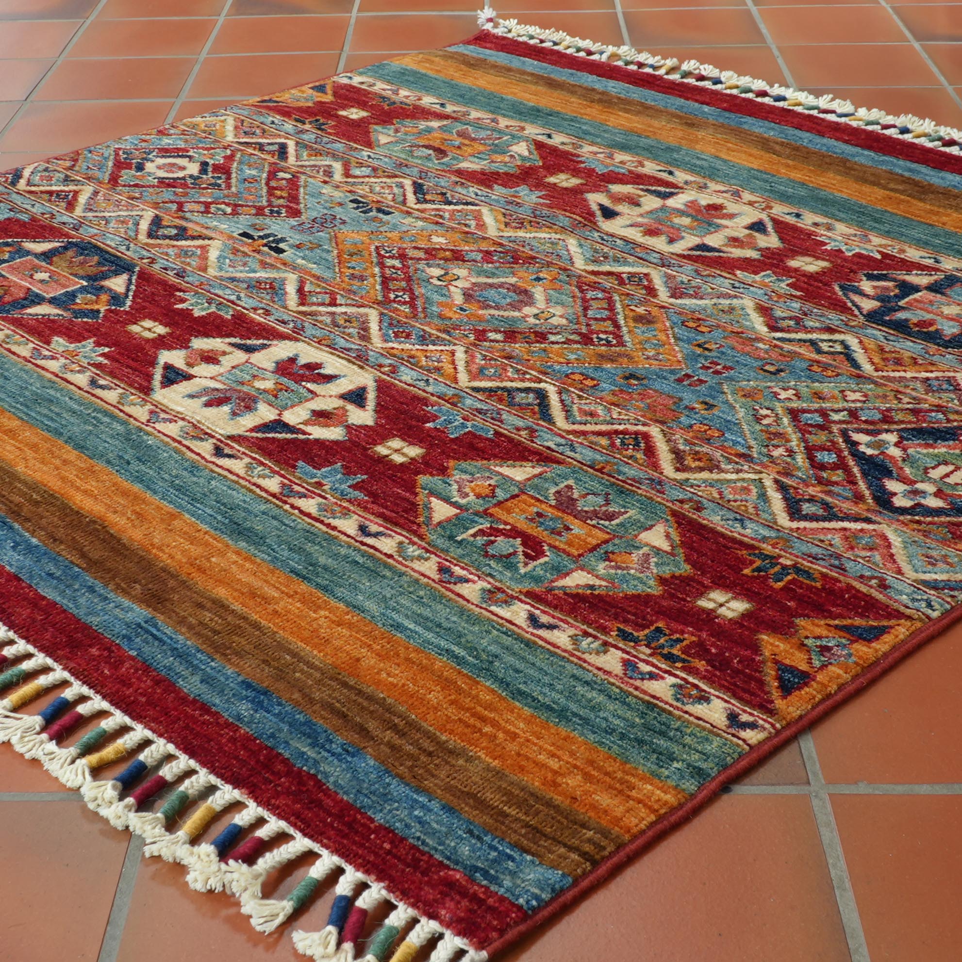 Afghan handmade carpets are becoming very well regarded. This market has been growing quite fast in recent years, emphasising higher quality knotting and Pakistan's influence in many finishing processes. For example, initial tensioning is needed to correct alignment issues where the weaver has drifted the wefts, causing the pattern to run out. Next, adjustments may follow surface clipping, herbal washing, and tumbling. This combination of Afghan weaving and finishing in Pakistan has succeeded. These carpets are tightly knotted and usually finished with a unique and unusual bound multicoloured fringe.