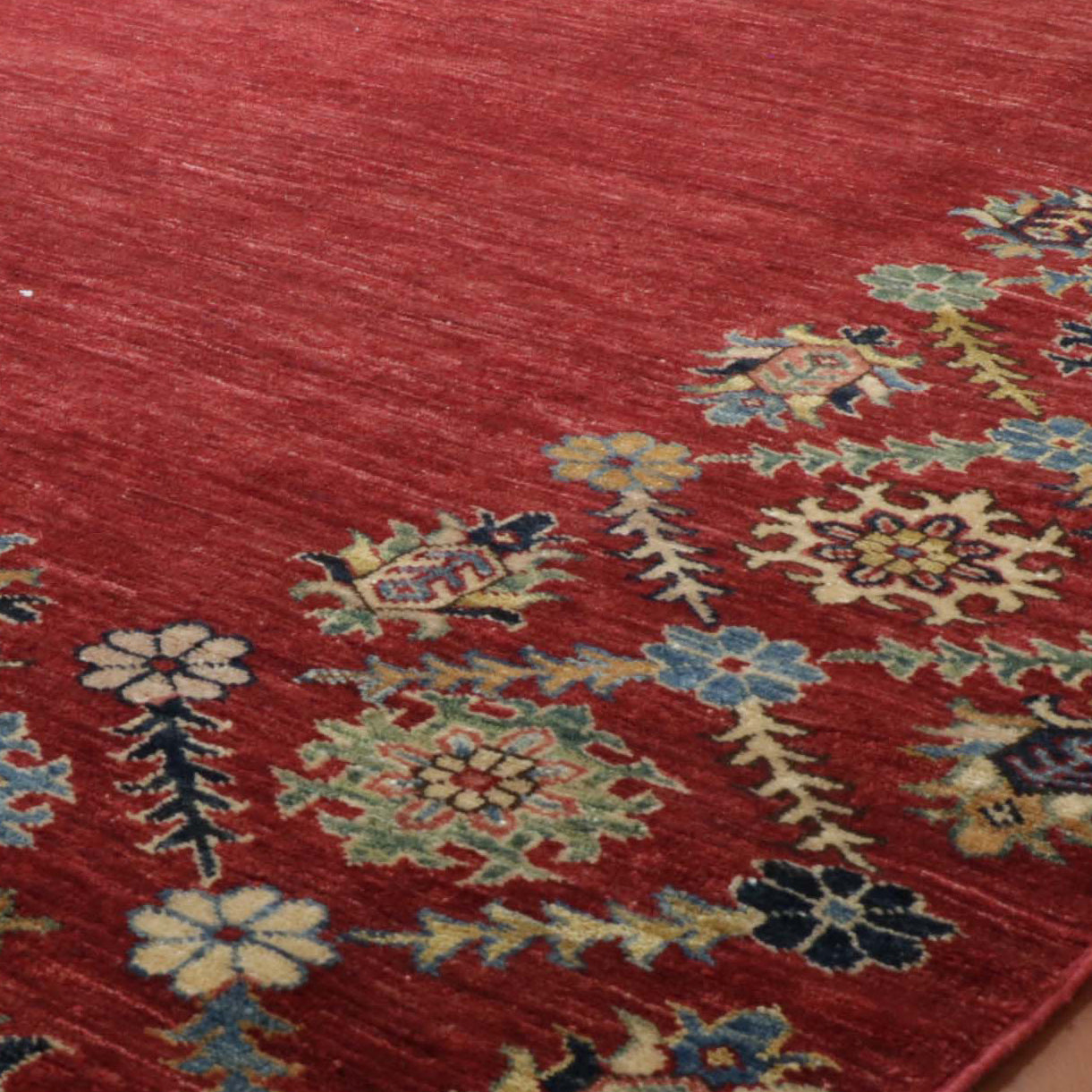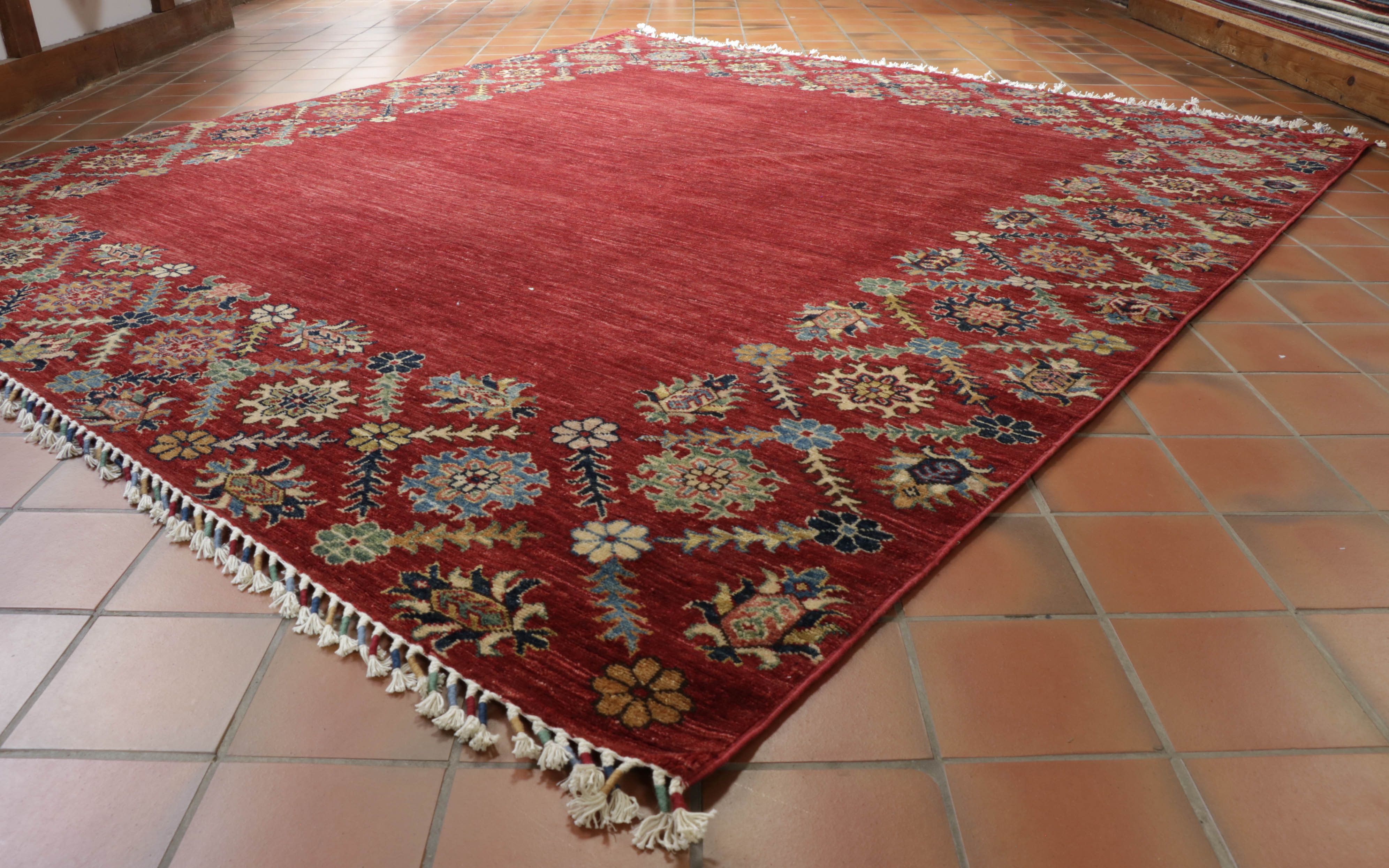 This handmade Afghan Kharjeen square will bring a touch of luxury and traditional craftsmanship to the interiors. Crafted from vegetable-dyed hand-spun wool from Northwest Afghanistan by skilled artisan weavers, it features a practical, hardwearing design with a plain centre, trellis border, and a rich red background. This unique, handmade piece adds luxury and exclusivity to your home.  Please click the hyperlinks in gold if you are interested in additional information. Afghan handmade carpets are increasingly well-regarded. This market has been growing rapidly in recent years, with greater emphasis on higher-quality knotting and Pakistan's influence in many finishing processes, such as...