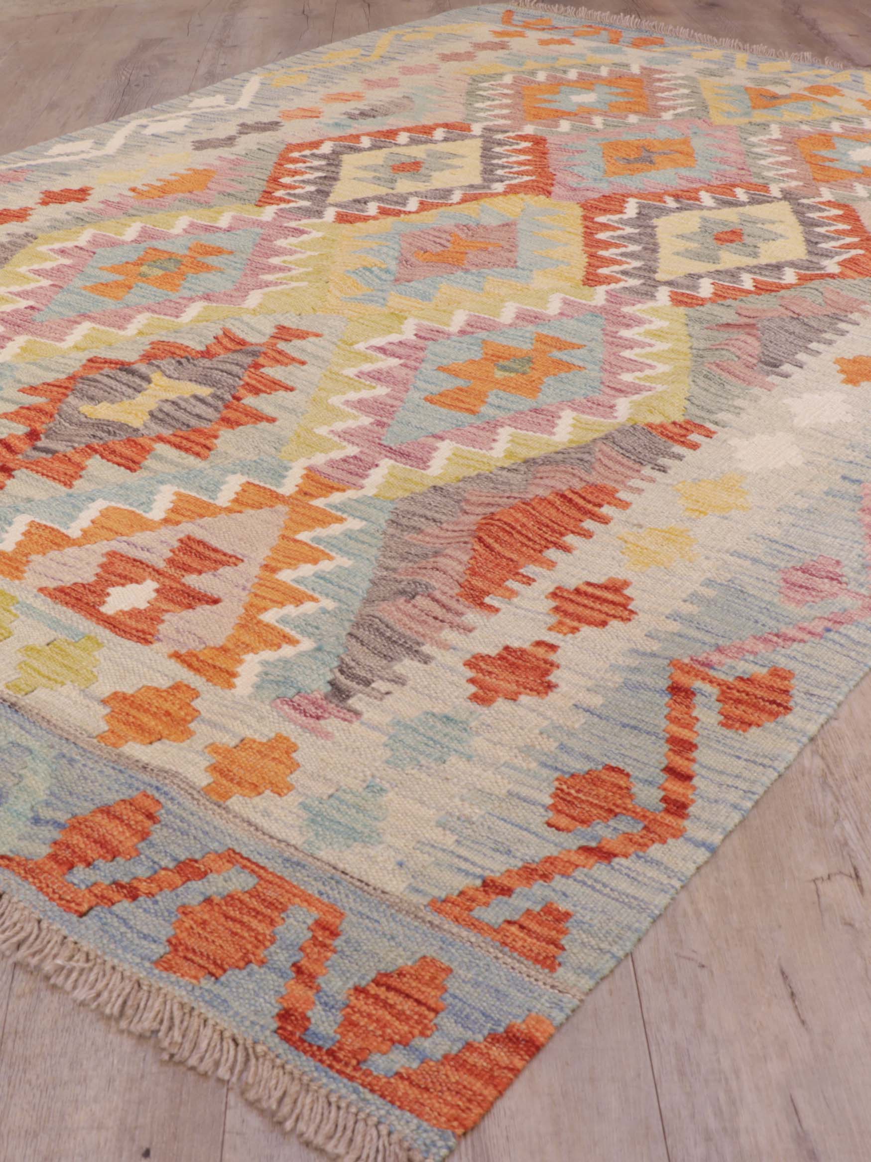This handmade Afghan Kilim is a unique and versatile piece, hand woven in northwest Afghanistan using vegetable-dyed wool. With traditional geometric designs and soft colours, it adds a touch of elegance to any room. Its dual-sided use and ability to be used as a wall hanging make it a great value for money. Please click the hyperlinks in gold if you are interested in additional information.Kilim rugs are serviceable and practical, giving the owner the advantage of being made from one of the most beautiful natural yarns, 'wool' and are often completely reversible. The vegetable-dyed wool is a beautiful natural fibre that usually...