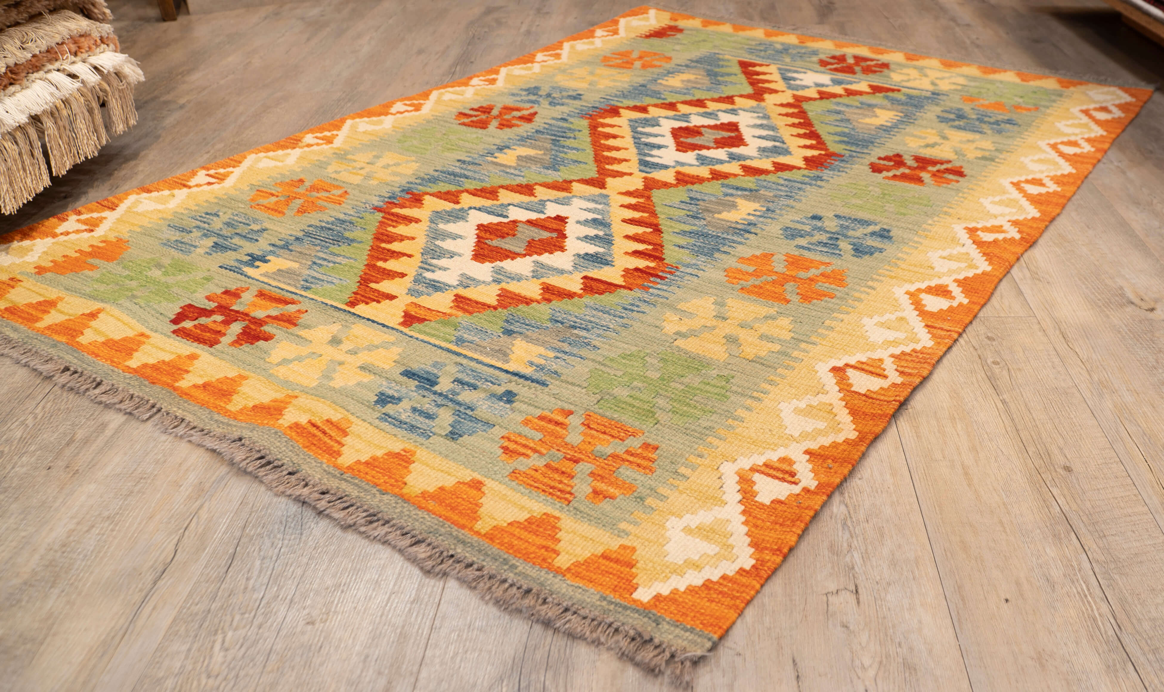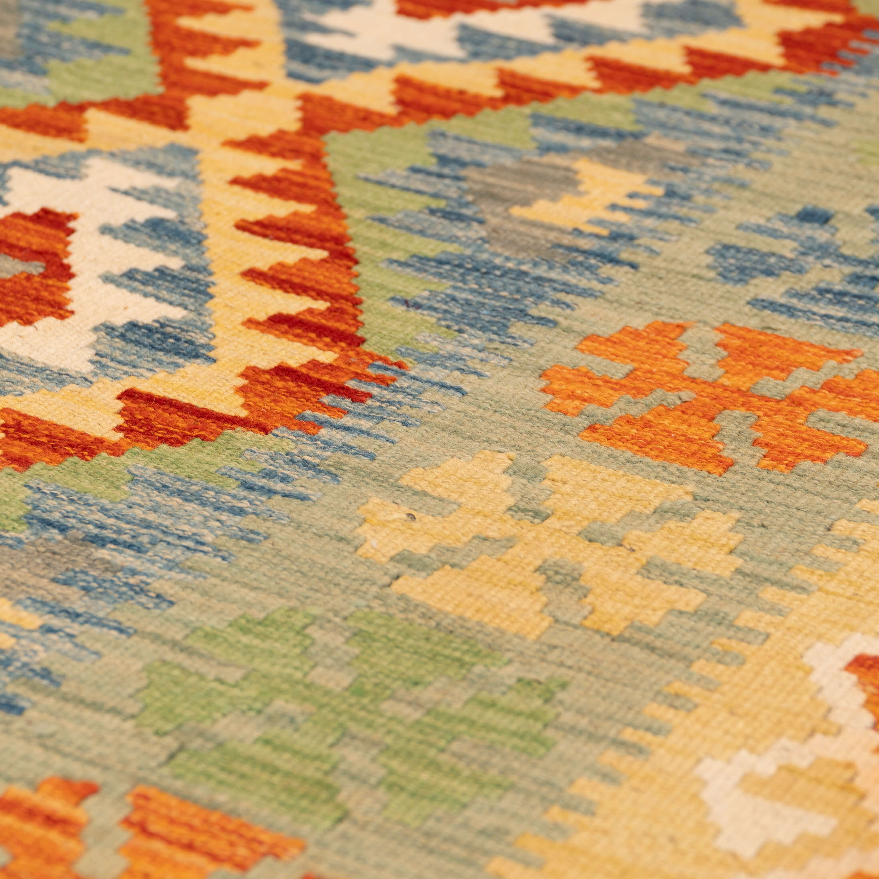 Experience the quality and tradition of Afghan craftsmanship with our colourful handmade Kilim in soft green, sandy yellow, denim blue, and pale terracotta. This flat-weave Kilim is woven with traditional vegetable-dyed wool, making it durable and perfect for use with underfloor heating. Its colourful and striking design is reversible, allowing it to be used as a floor covering, wall hanging, or throw. Upgrade your space with this beautiful and inexpensive piece.