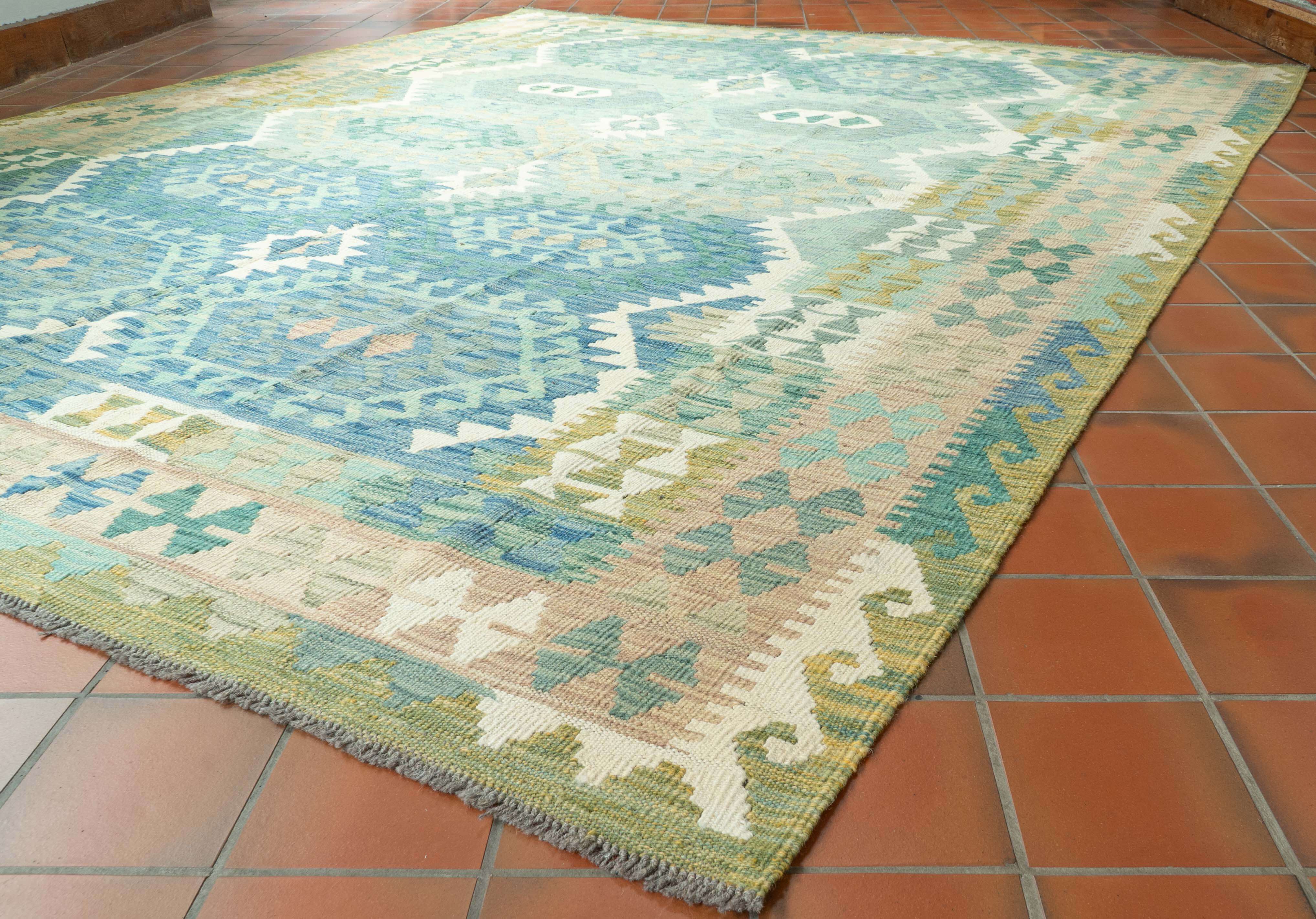 Experience the quality and tradition of Afghan craftsmanship with our handmade Kilim in blues and green colourings. This flat-weave kilim is woven from traditional, vegetable-dyed wool, making it durable and ideal for use with underfloor heating. Its colourful and striking design is reversible, allowing it to be used as a floor covering, wall hanging, or throw. Elevate your space with this stunning and affordable piece.